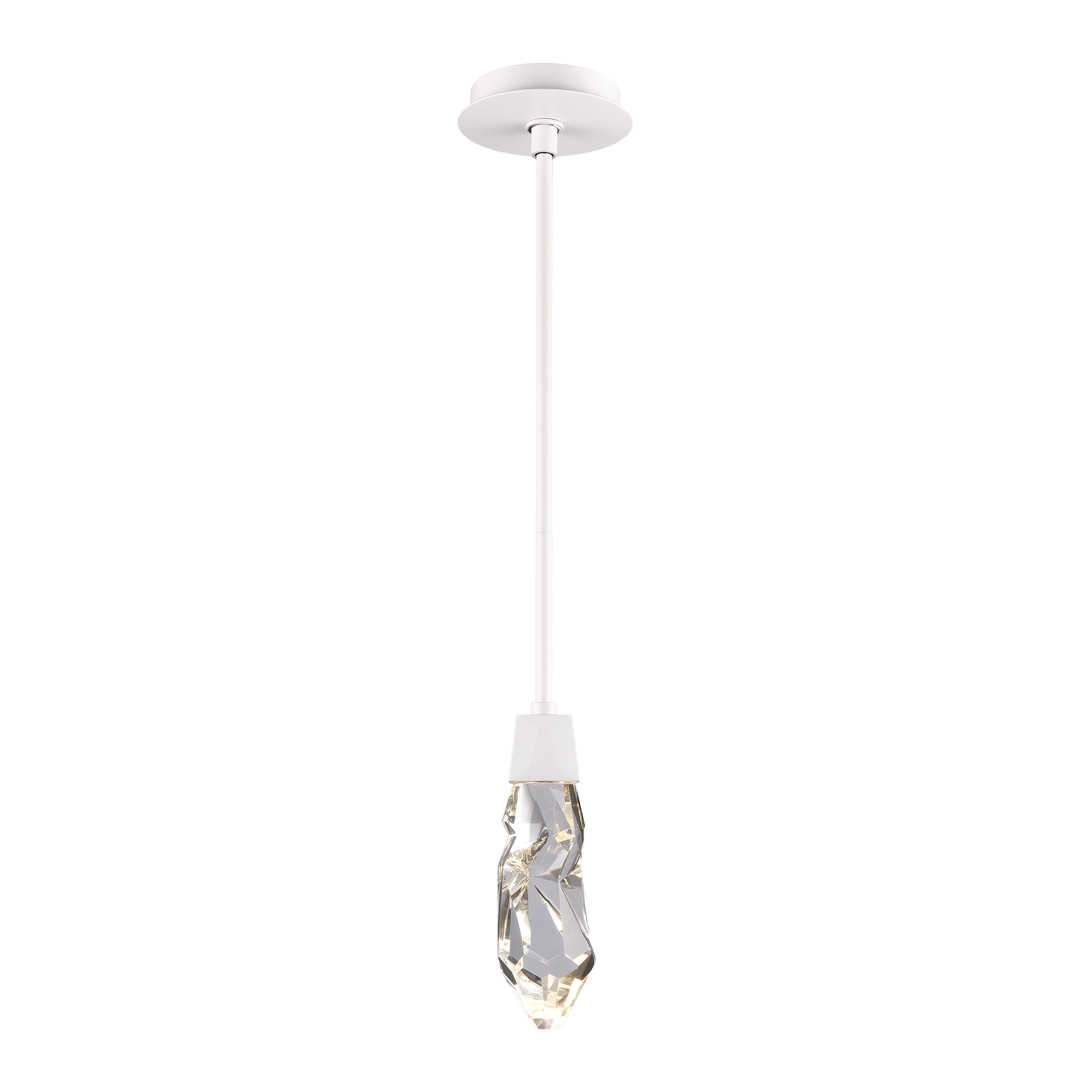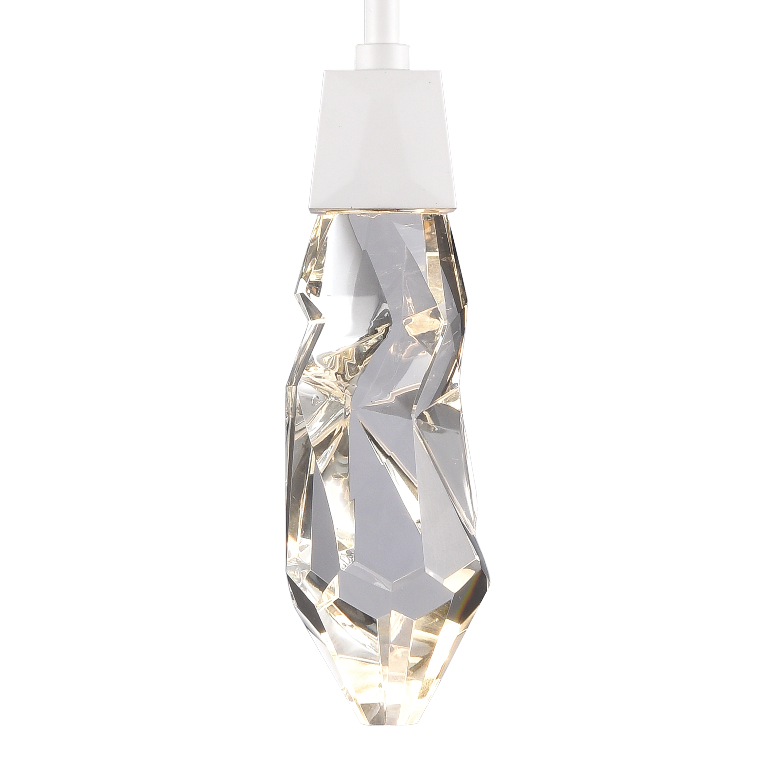 1-Light Inimitable Crystal Mini-Pendant, hand formed and polished crystal, with every turn of the crystal being unique. Refined metal with our chic matte white finish. Integrated Replaceable LED with 3CCT 3000K, 3500K and 4000K. Optional installation of suspension stems to showcase the black braided fabric wire and optional installation of canopy crystal