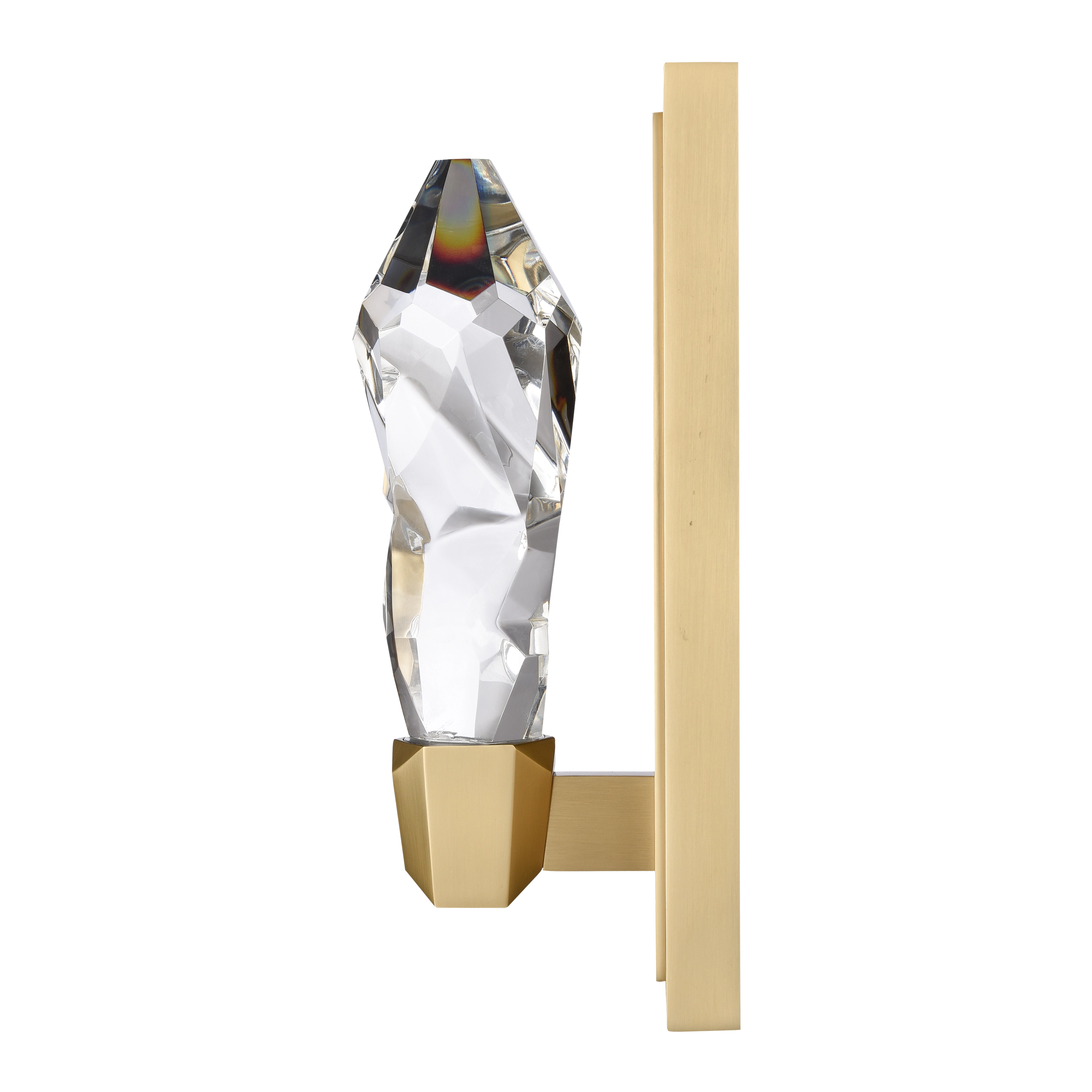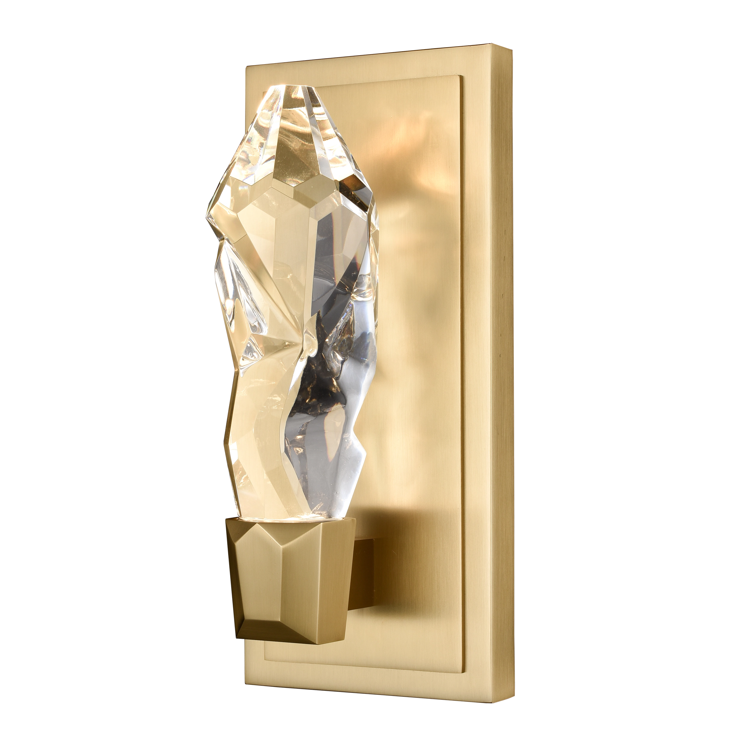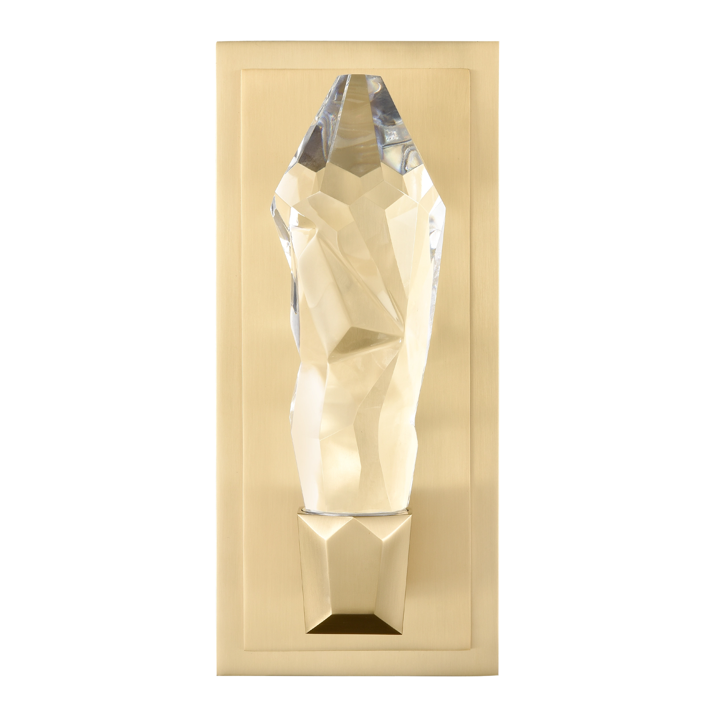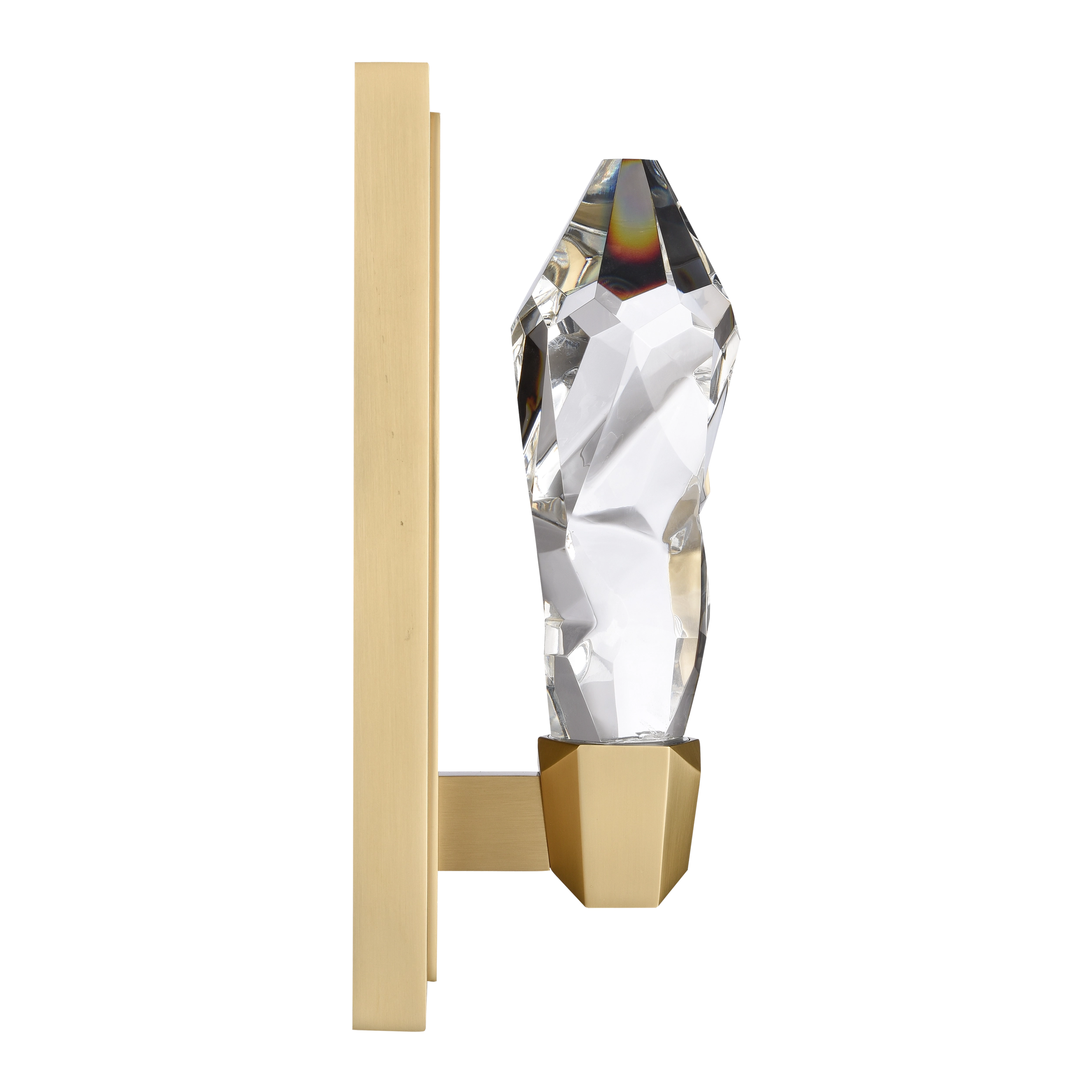 1-Light Inimitable Crystal Vertical Wall Sconce, hand formed and polished crystal, with every turn of the crystal being unique. Refined metal with our premium aged brass finish. Integrated Replaceable LED with 3CCT 3000K, 3500K and 4000K.