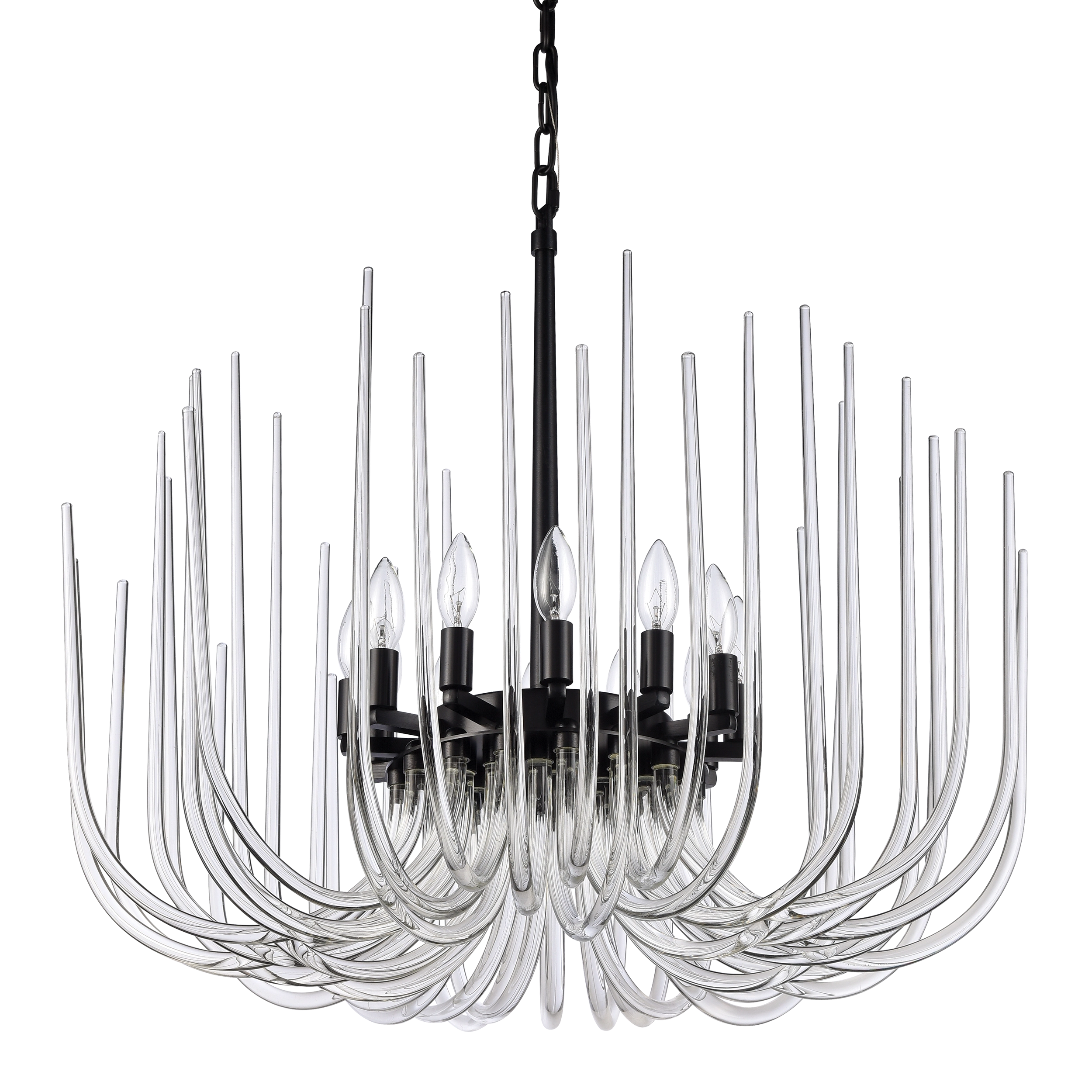 12-Light Solid Curved Clear Glass Satin Brushed Black Chandelier.