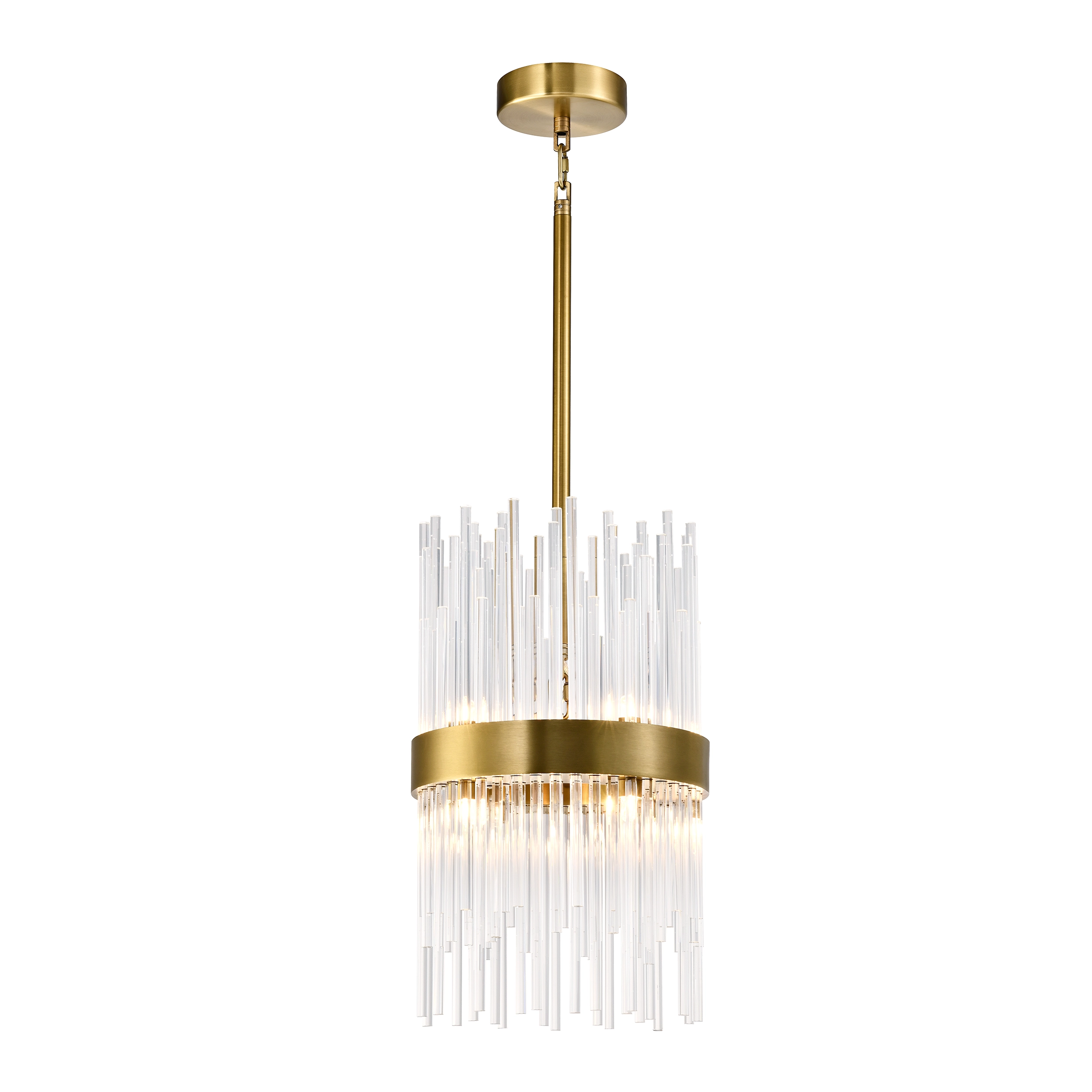 8-Light 10" Clear Staggered Solid Crystal Stems with Sleek Aged Brass Band Cylindrical Shade Pendant.