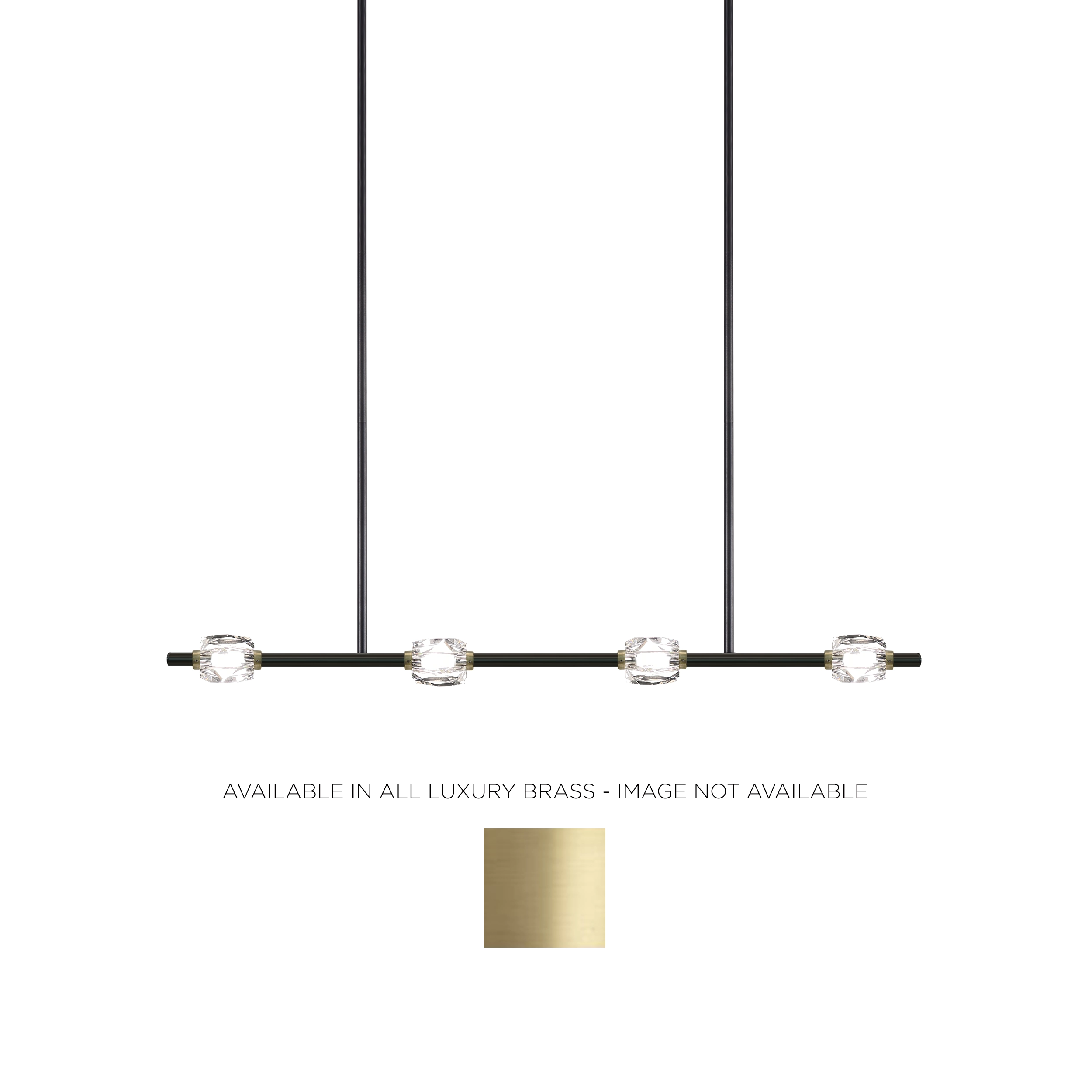 Irregular faceted Multi-Crystal 4-Light LED 37" Linear Pendant Light, Crystals Can Be Rotated to Provide Different Jagged Effects, Aluminum Frame with our Luxury Brass Finish. Powerful Dimmable Integrated LED and 3CCT 3000K, 3500K, 4000K.