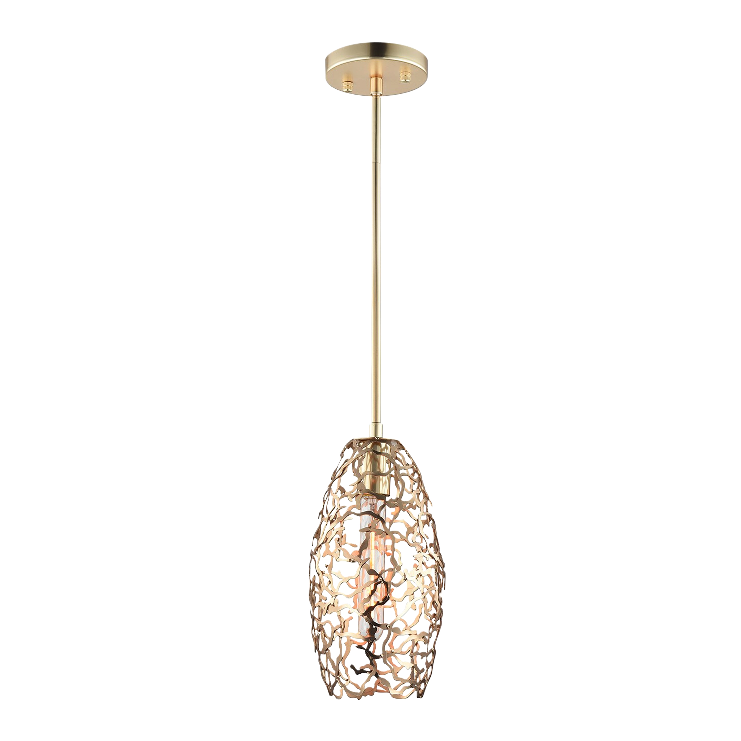 1-Light 6" Vertical Mini Pendant Light with Organic Metal Patterned Convex Shade and Matte Gold Finish.