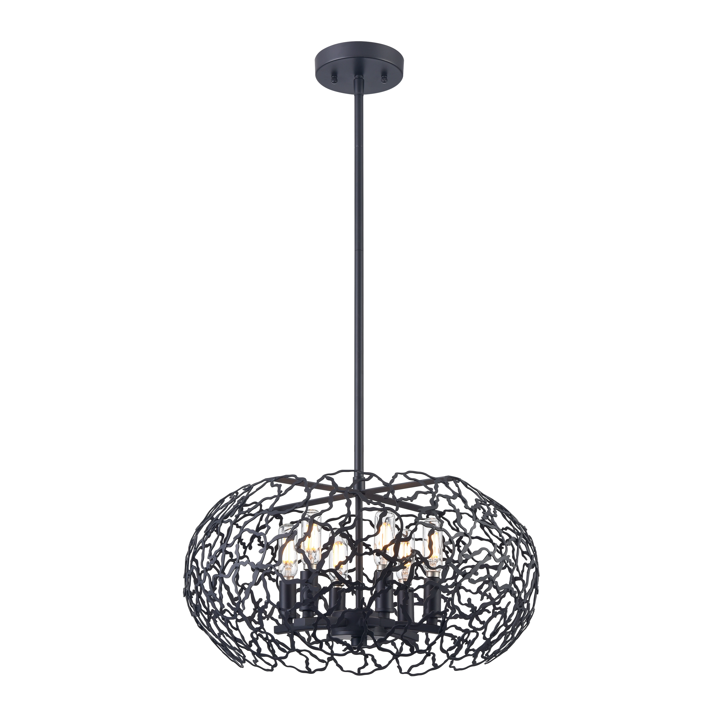 Zeev Lighting Helios Collection 6-Light 18 Inch Pendant Light with Organic Metal Patterned Oval Shade and Matte Black Finish.