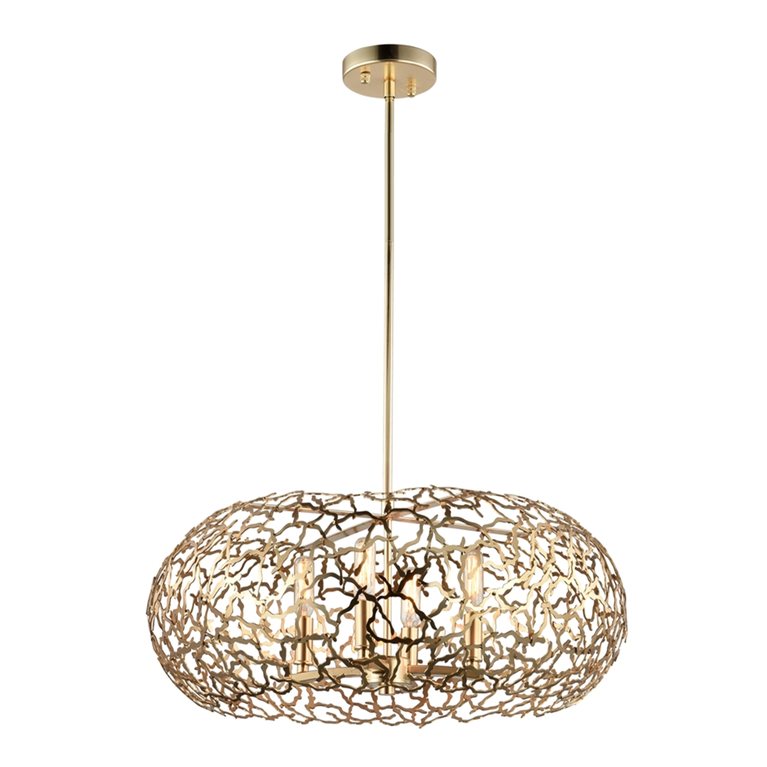8-Light 22" Pendant Light with Organic Metal Patterned Oval Shade and Matte Gold Finish.