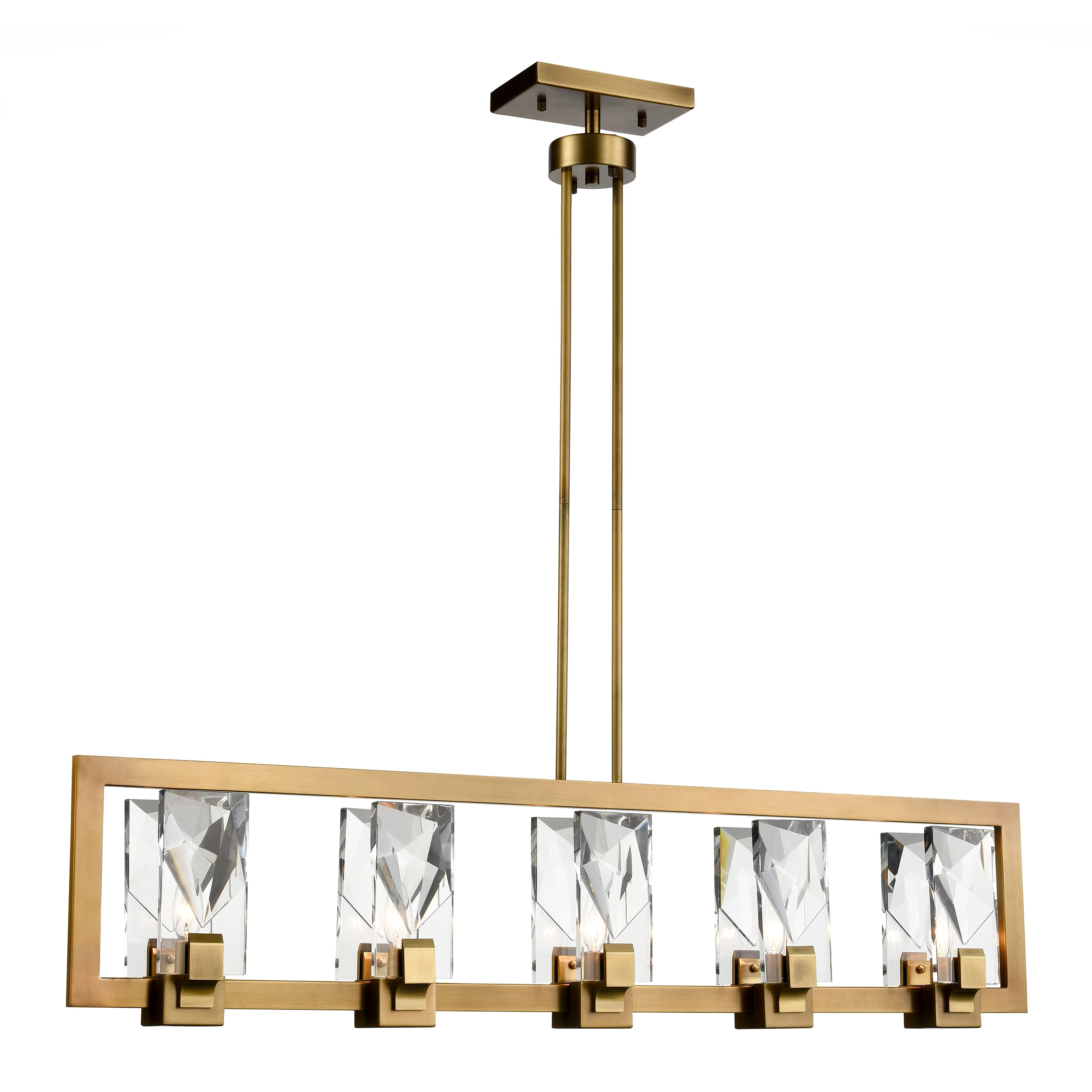 5-Light 46" Sleek Linear Dining Chandelier with Clear Crafted Rectangular Crystals and Heavy Gauge Metal Details in Aged Brass Finish.
