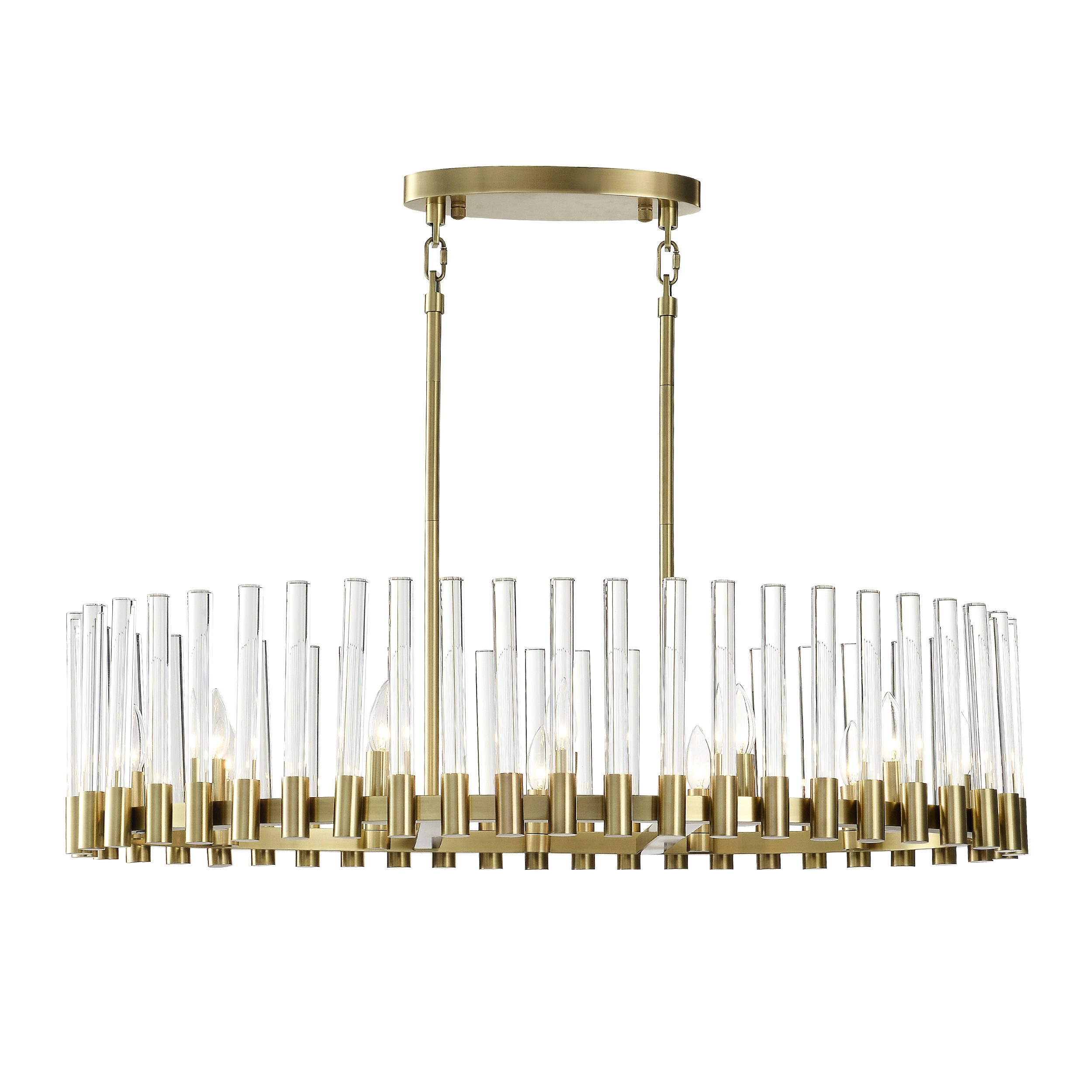 12-Light 40" Oval Contemporary Linear Chandelier with Solid Clear Glass Cylinders Placed within Decorative Aged Brass Frame.