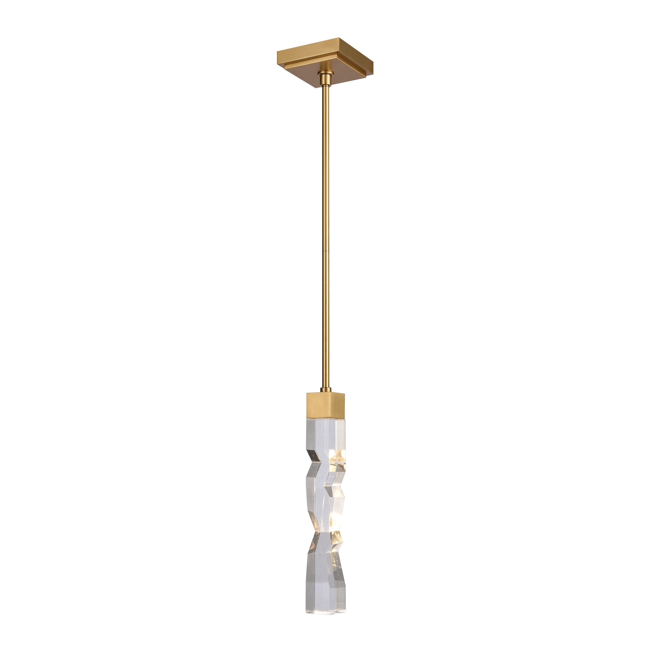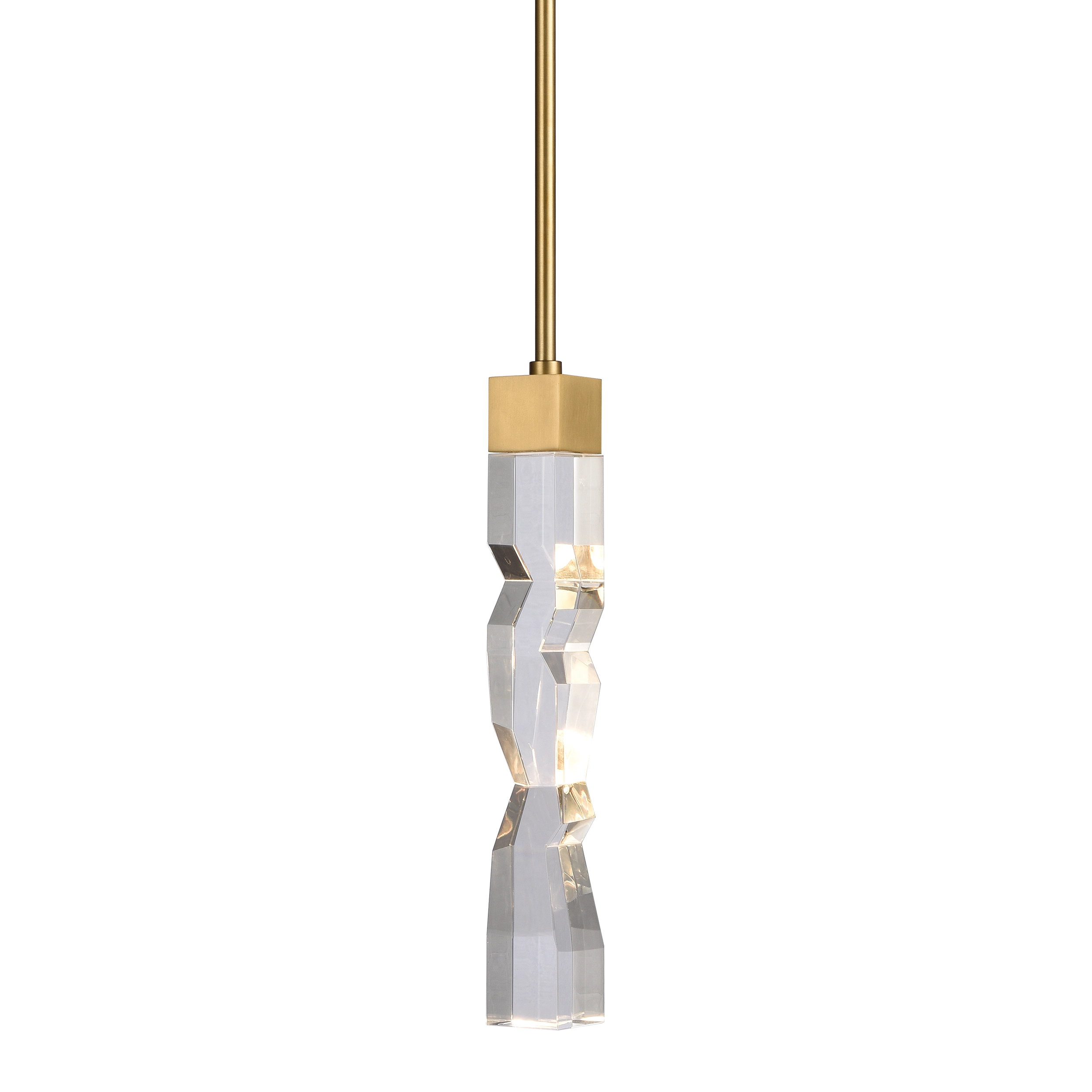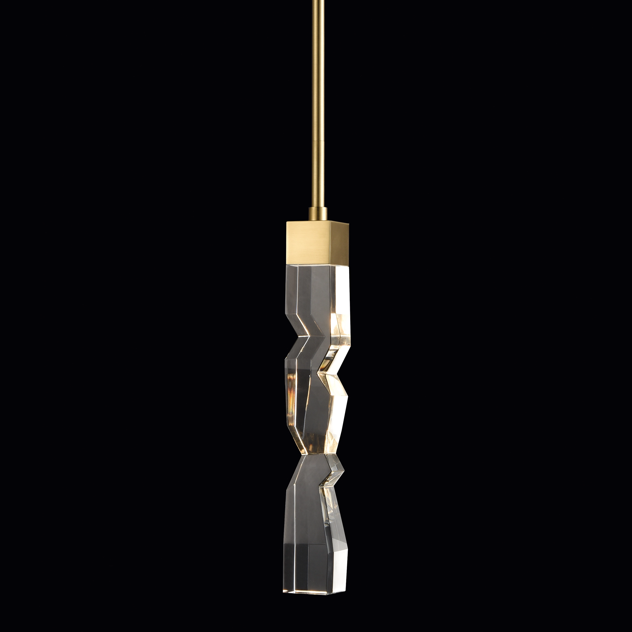 LED hand formed and polished heavy gauge 2" x 2" crystal Mini-Pendant, with deep edges and slants with each side unique. Refined iron metal details with our premium aged brass finish. Integrated Replaceable LED with 3CCT 3000K, 3500K and 4000K.