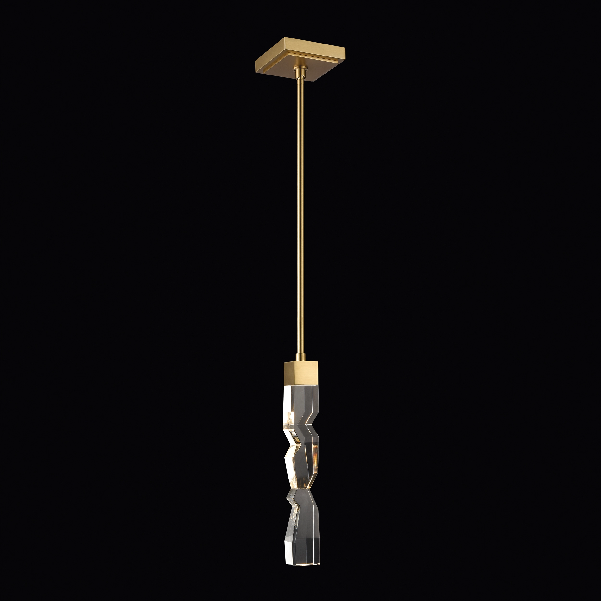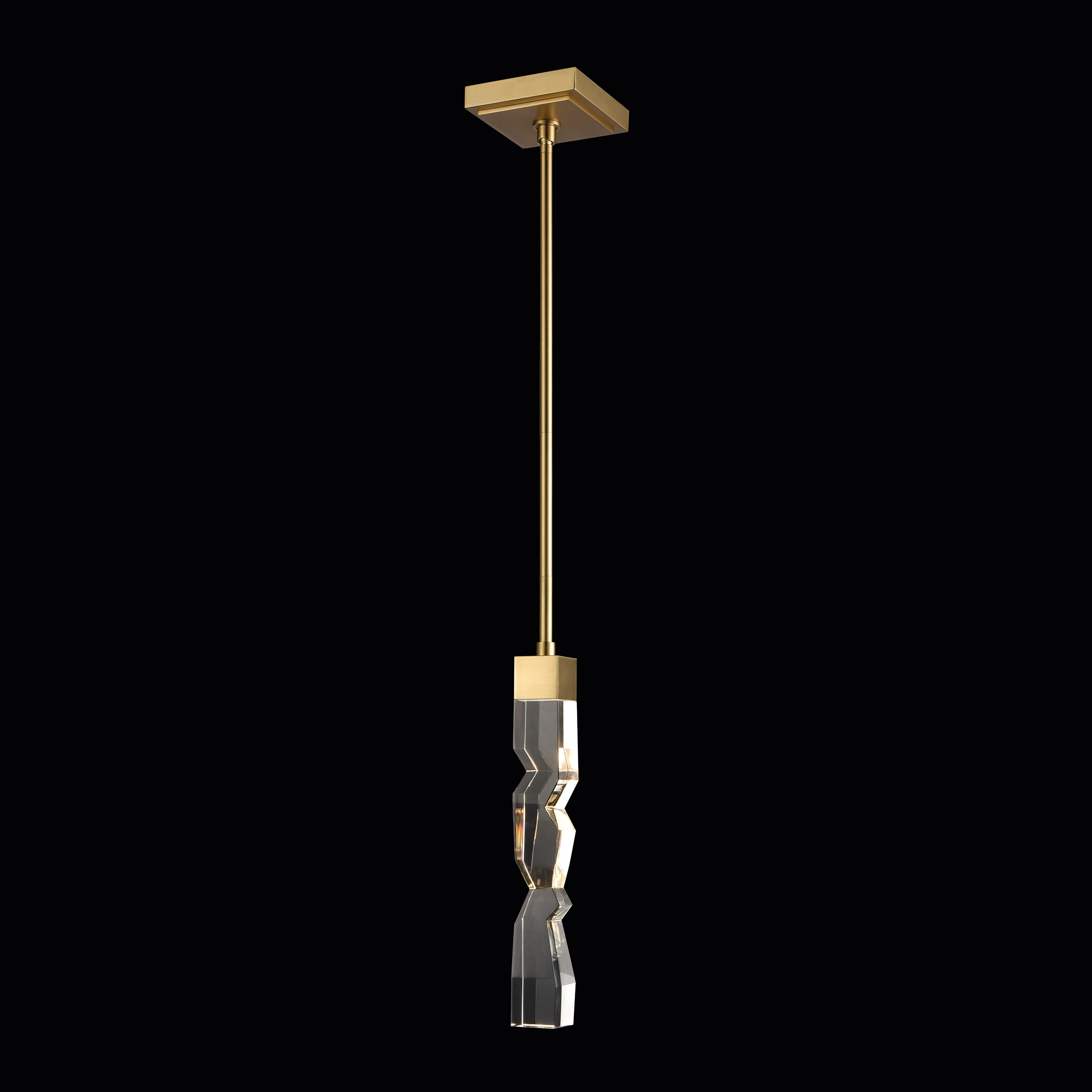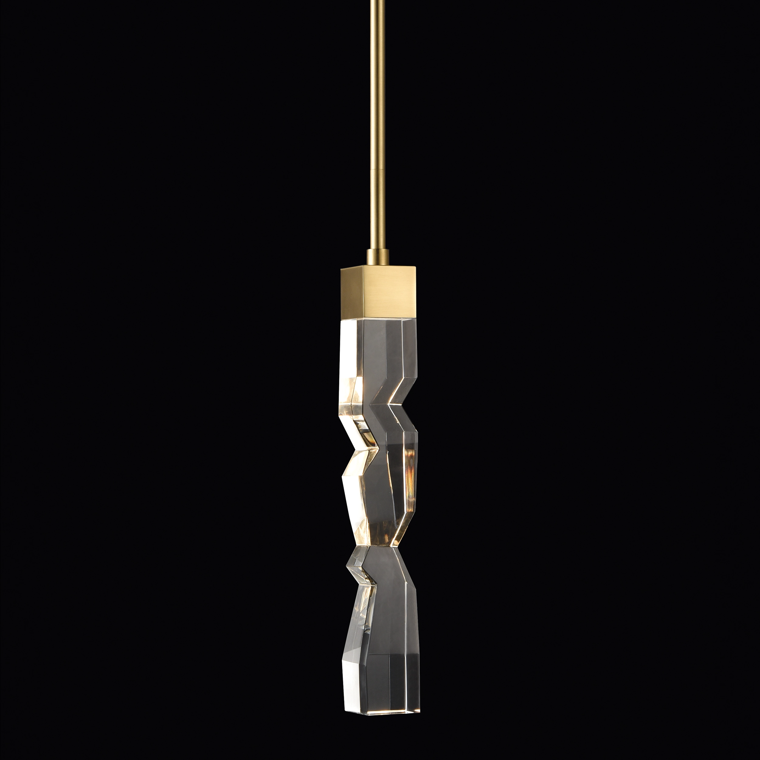 LED hand formed and polished heavy gauge 2" x 2" crystal Mini-Pendant, with deep edges and slants with each side unique. Refined iron metal details with our premium aged brass finish. Integrated Replaceable LED with 3CCT 3000K, 3500K and 4000K.