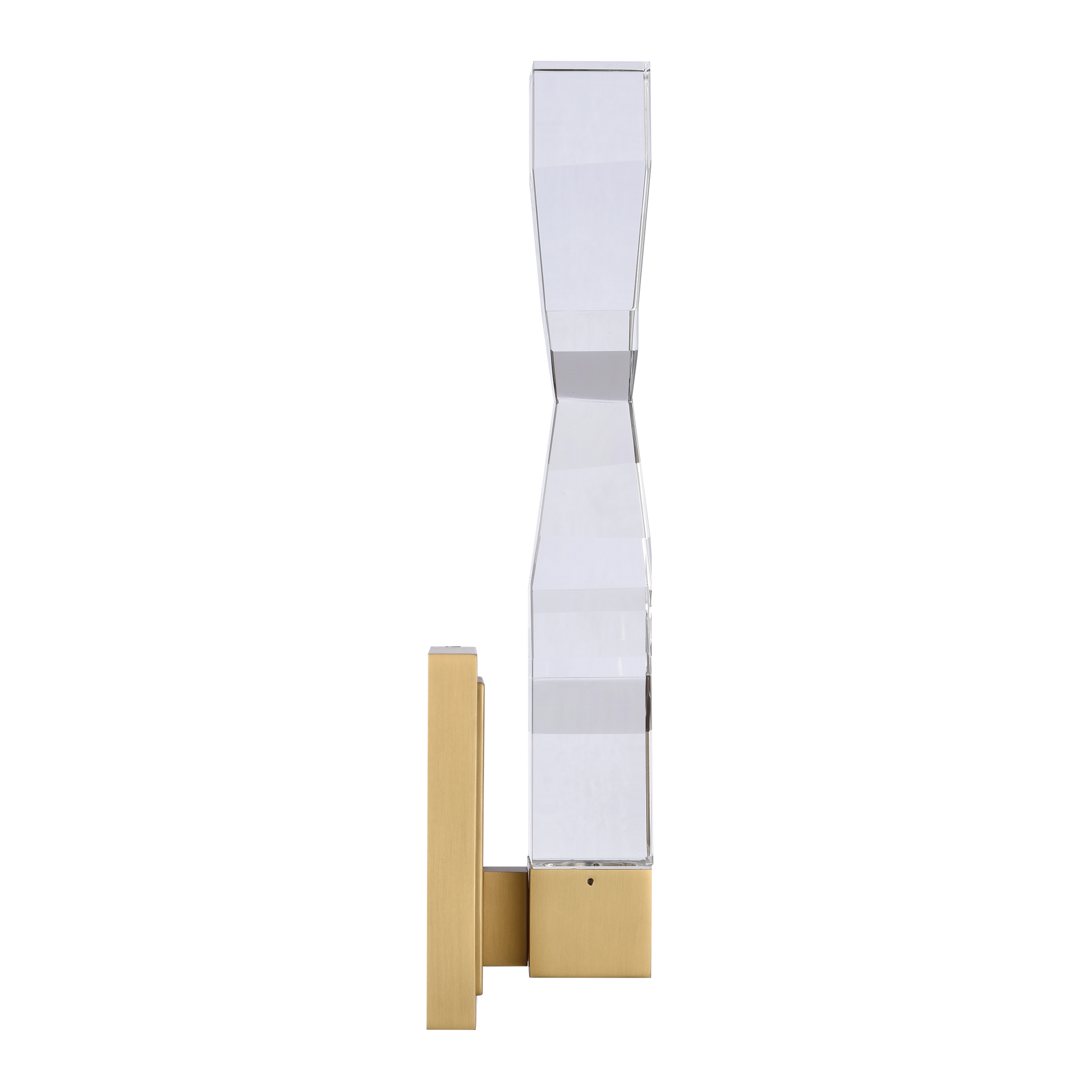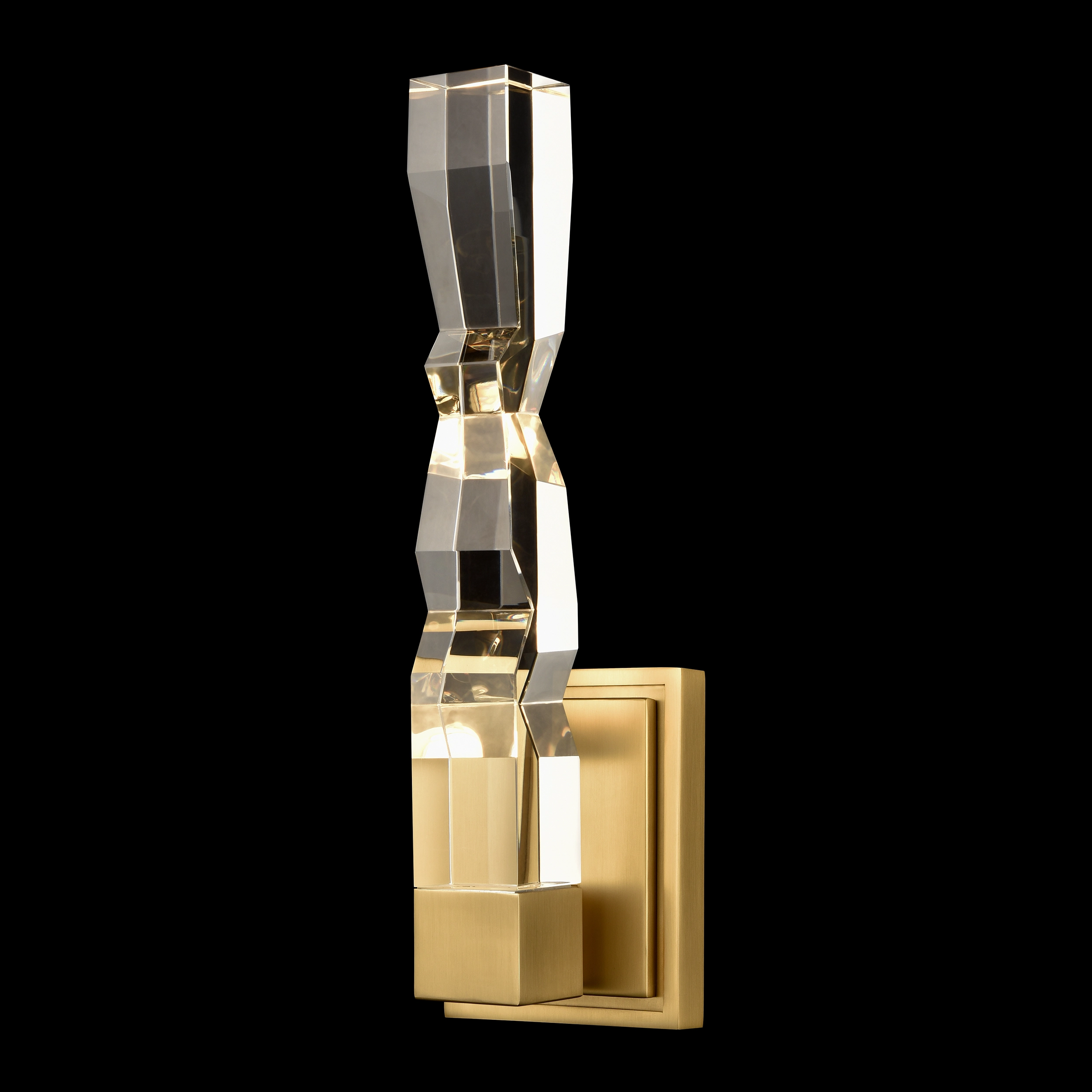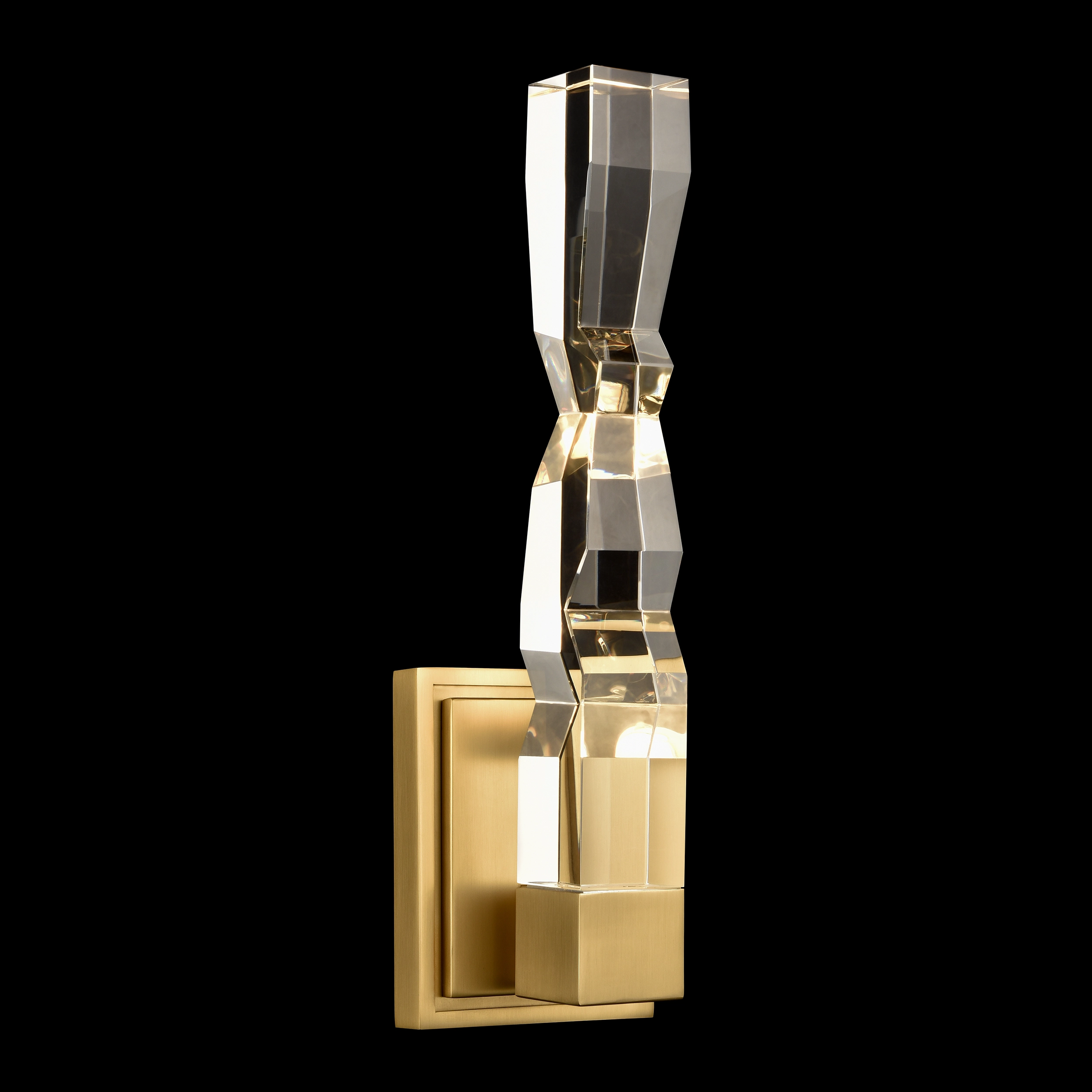 LED hand formed and polished heavy gauge 2" x 2" crystal vertical wall sconce, with deep edges and slants with each side unique. Refined iron metal details with our premium aged brass finish. Integrated Replaceable LED with 3CCT 3000K, 3500K and 4000K.
