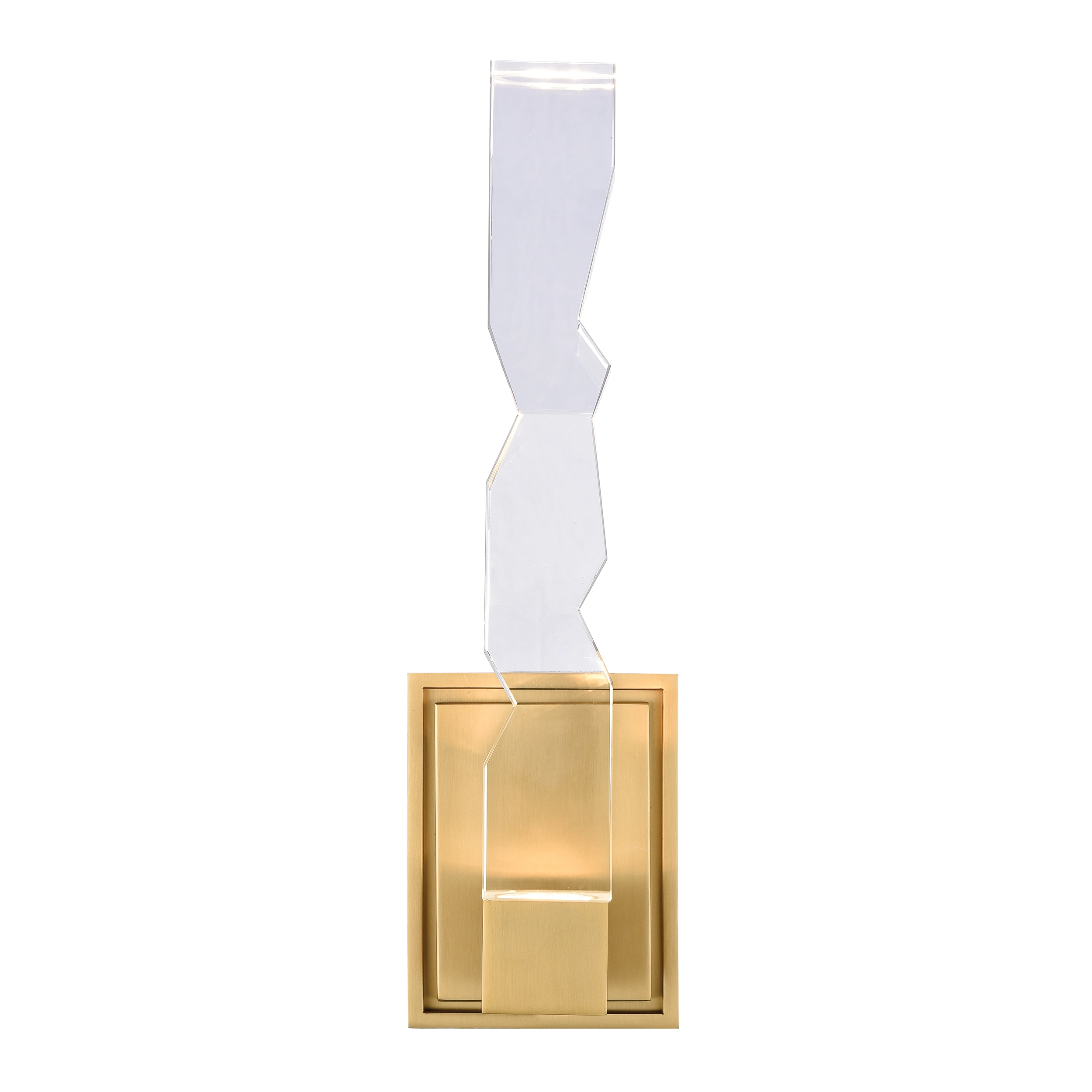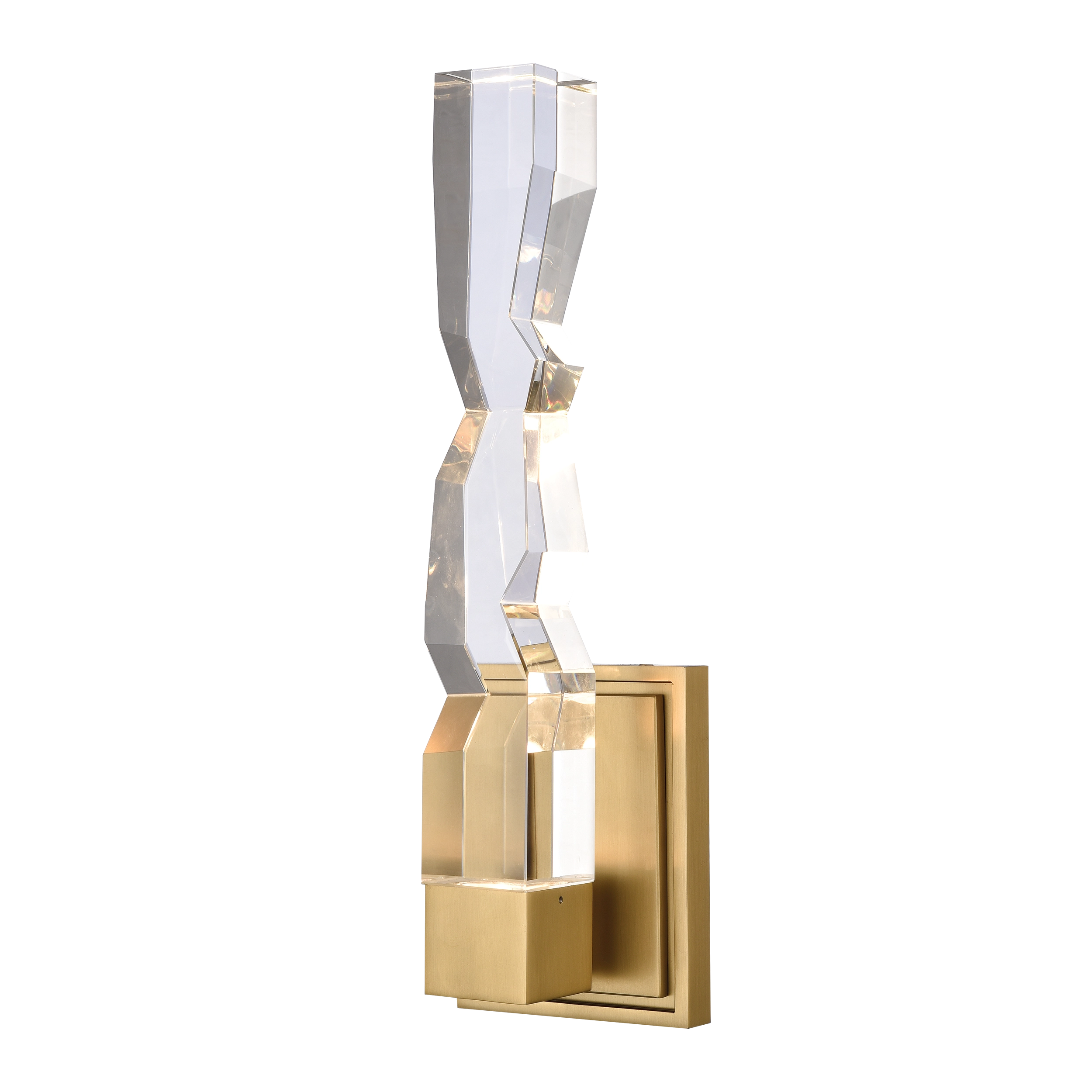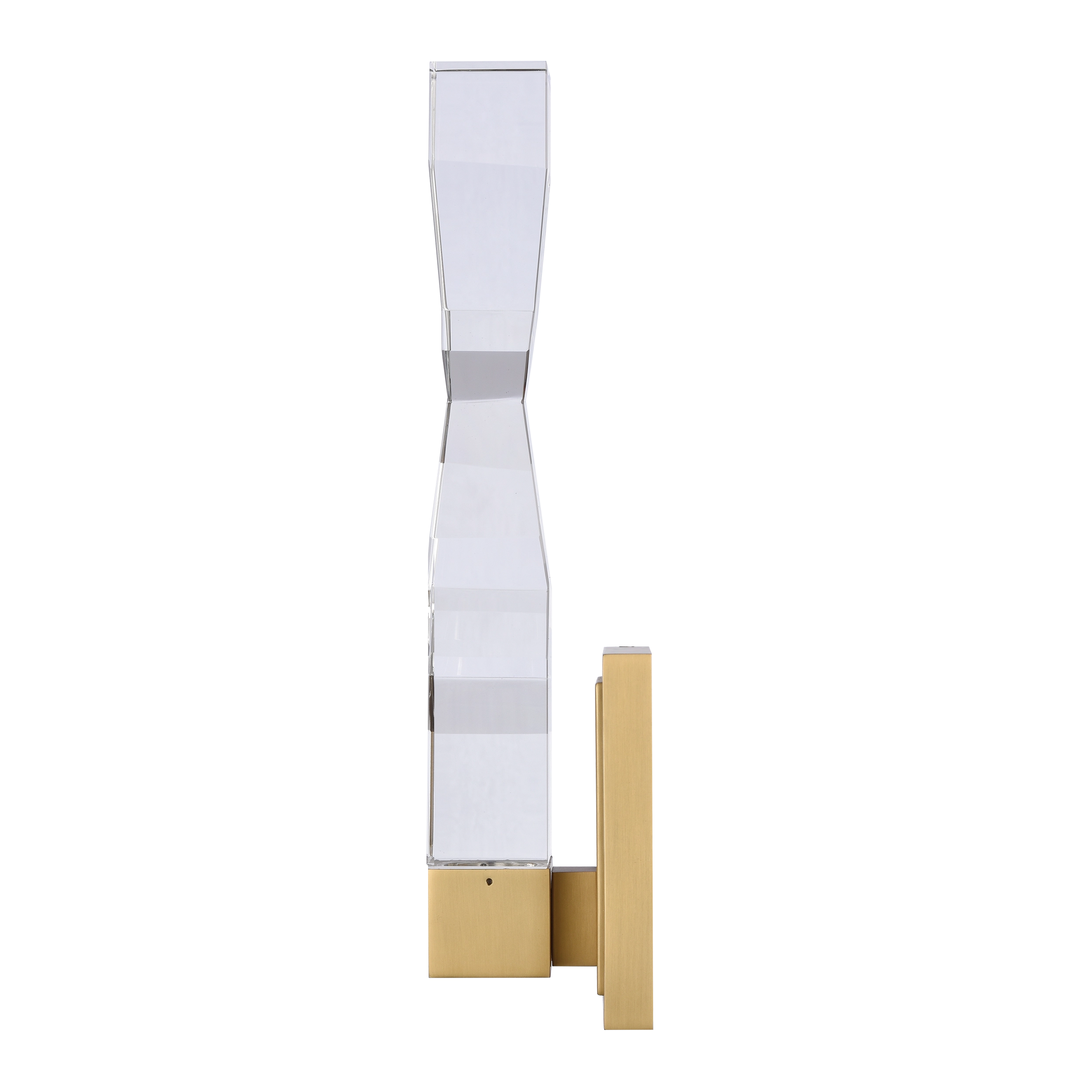 LED hand formed and polished heavy gauge 2" x 2" crystal vertical wall sconce, with deep edges and slants with each side unique. Refined iron metal details with our premium aged brass finish. Integrated Replaceable LED with 3CCT 3000K, 3500K and 4000K.