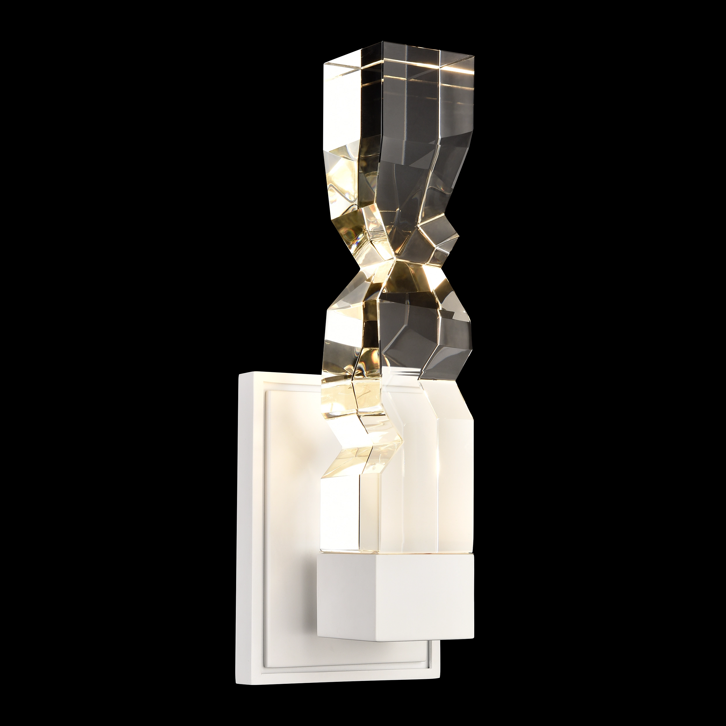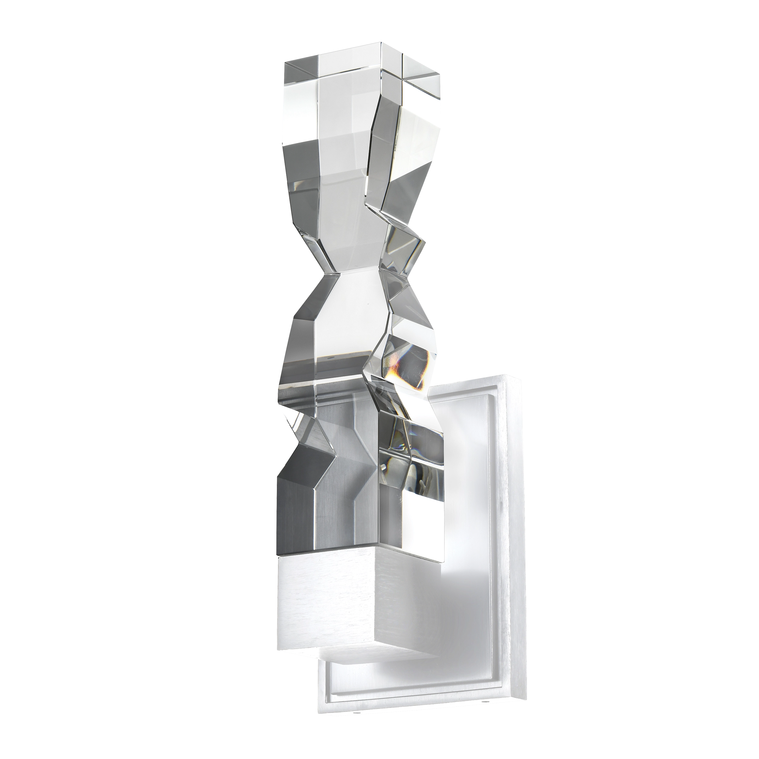 LED hand formed and polished heavy gauge 3" x 3" crystal vertical wall sconce, with deep edges and slants with each side unique. Refined iron metal details with our luxurious polished nickel finish. Integrated Replaceable LED with 3CCT 3000K, 3500K and 4000K.
