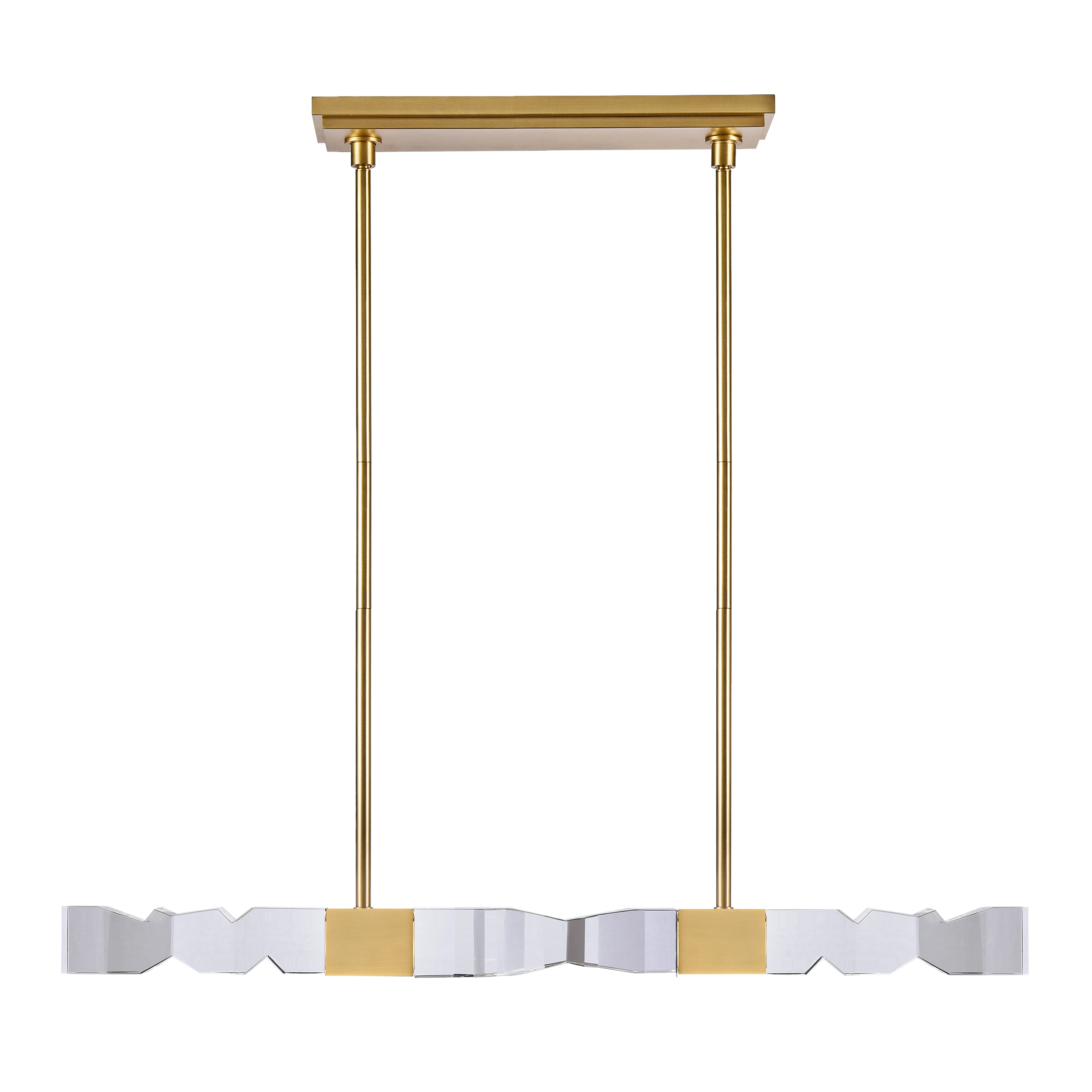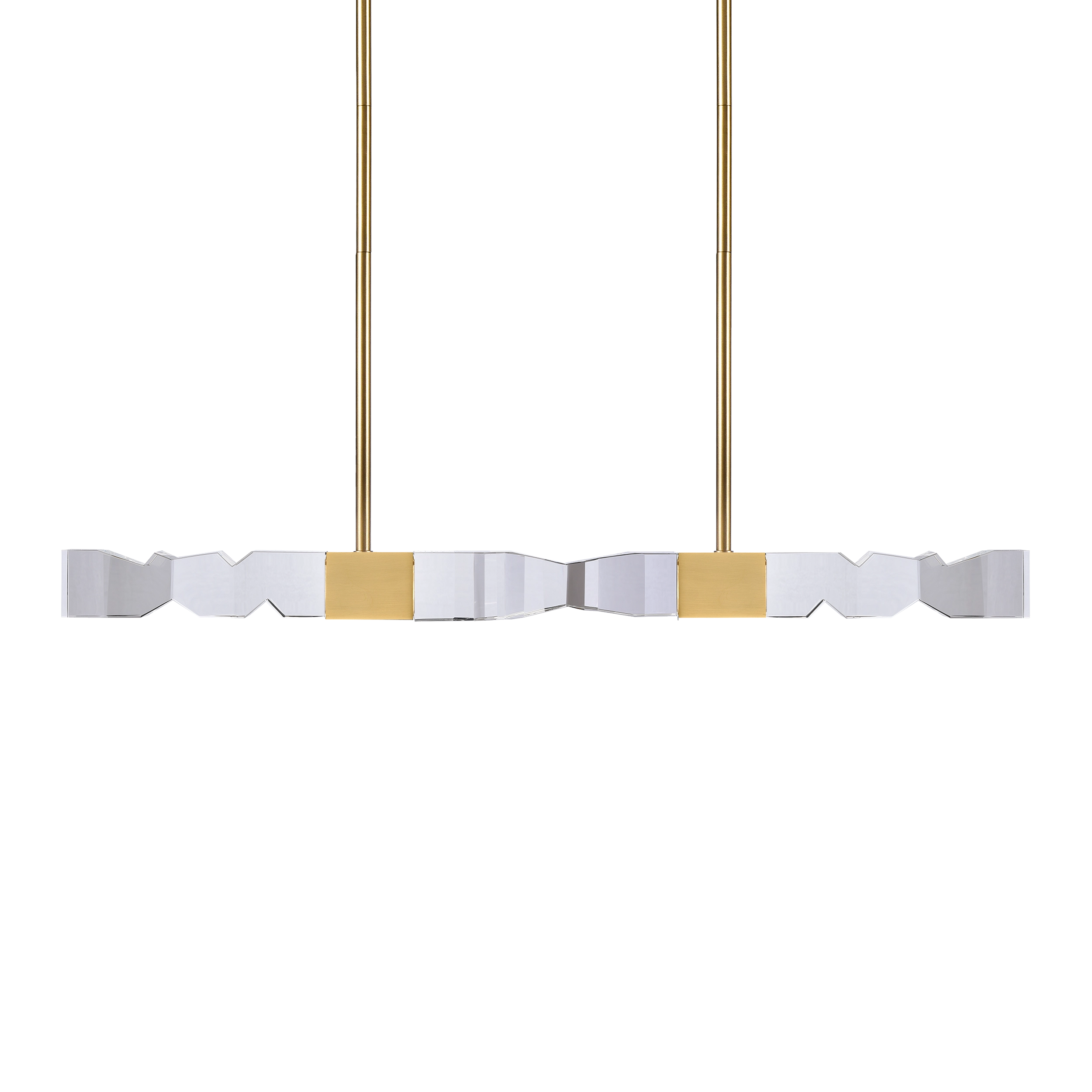 LED 49" 4-light hand formed and polished heavy gauge 3" x 3" linear crystal pendant, with deep edges and slants with each side unique. Refined iron metal details with our premium aged brass finish. Integrated Replaceable LED with 3CCT 3000K, 3500K and 4000K.