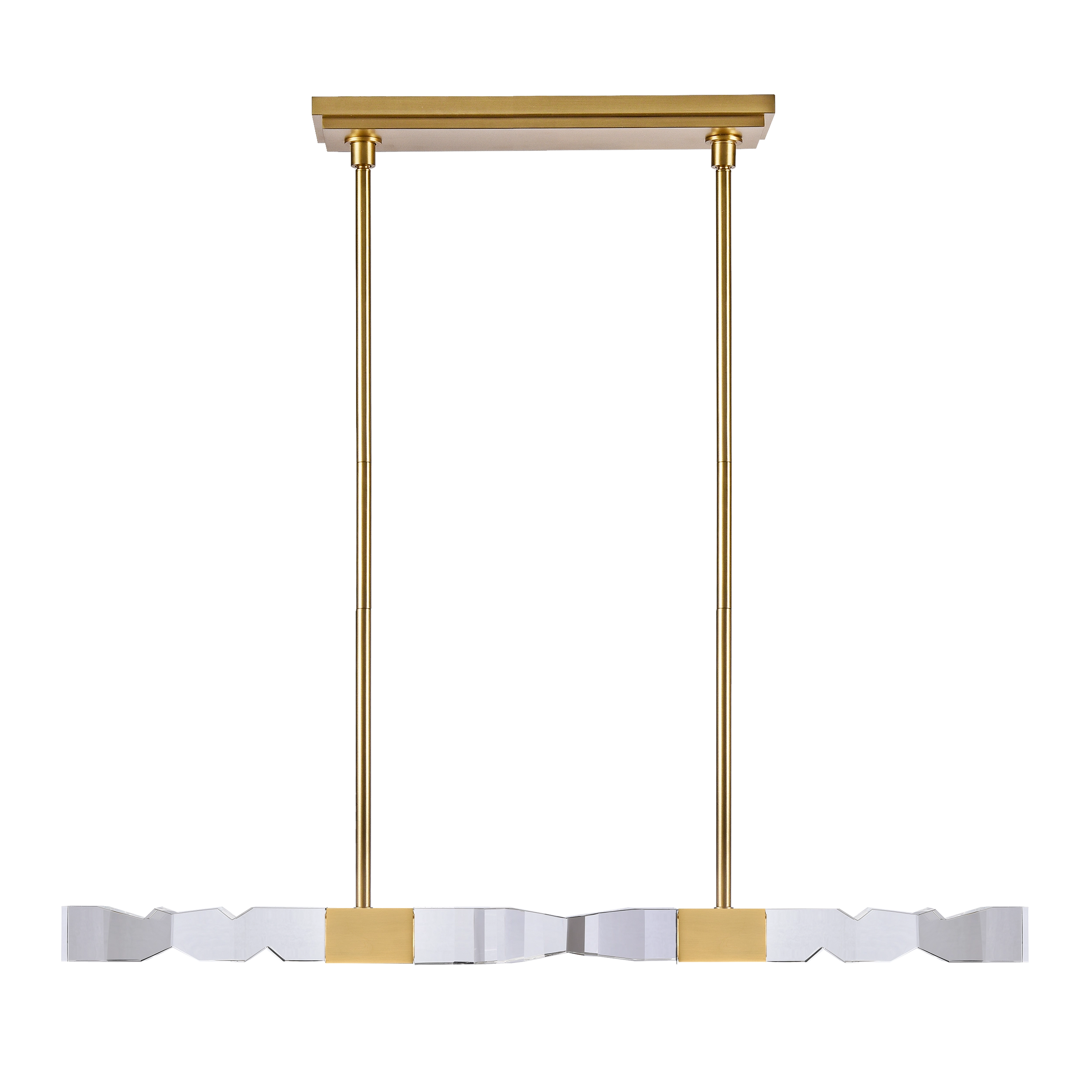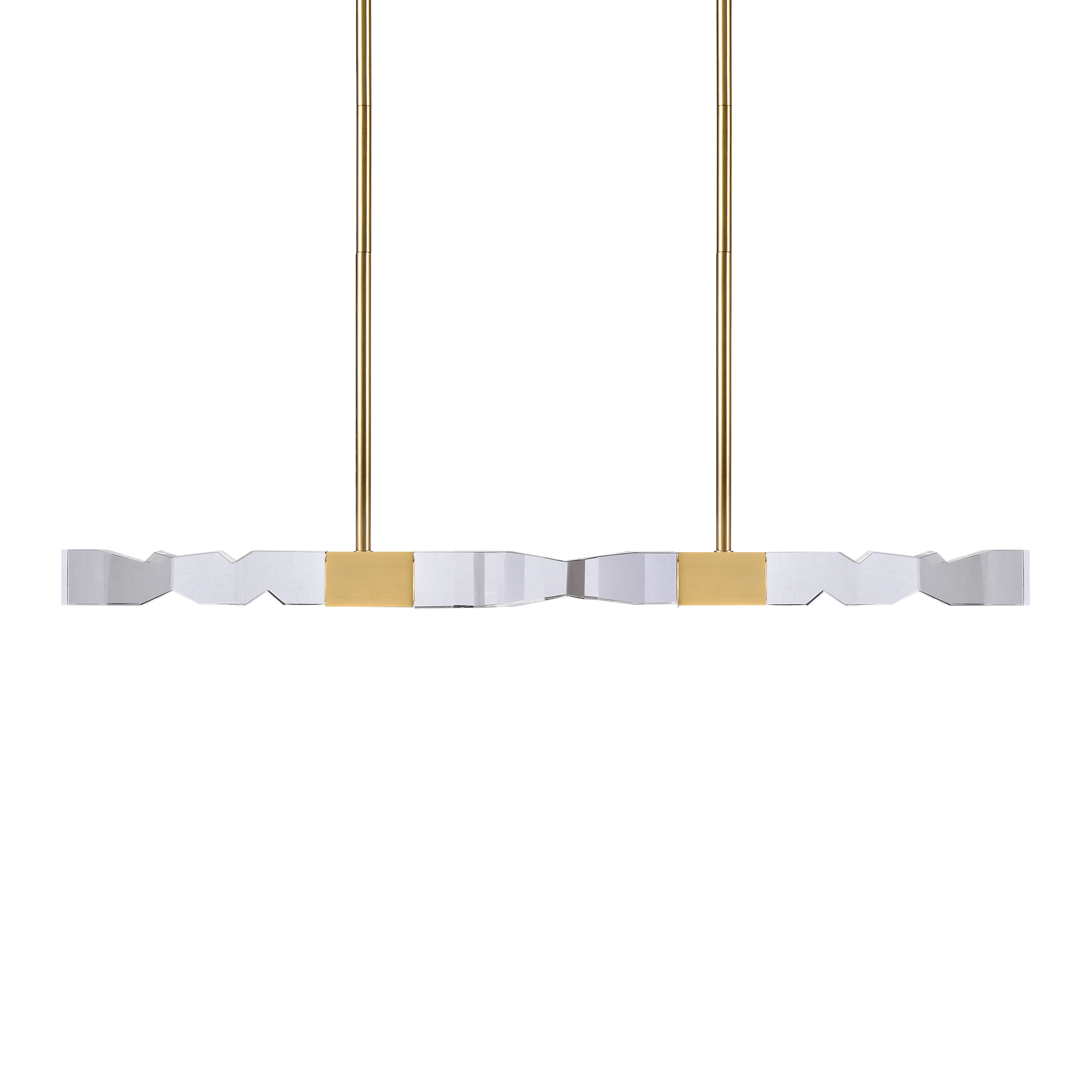 LED 49" 4-light hand formed and polished heavy gauge 2" x 2" linear crystal pendant, with deep edges and slants with each side unique. Refined iron metal details with our premium aged brass finish. Integrated Replaceable LED with 3CCT 3000K, 3500K and 4000K.