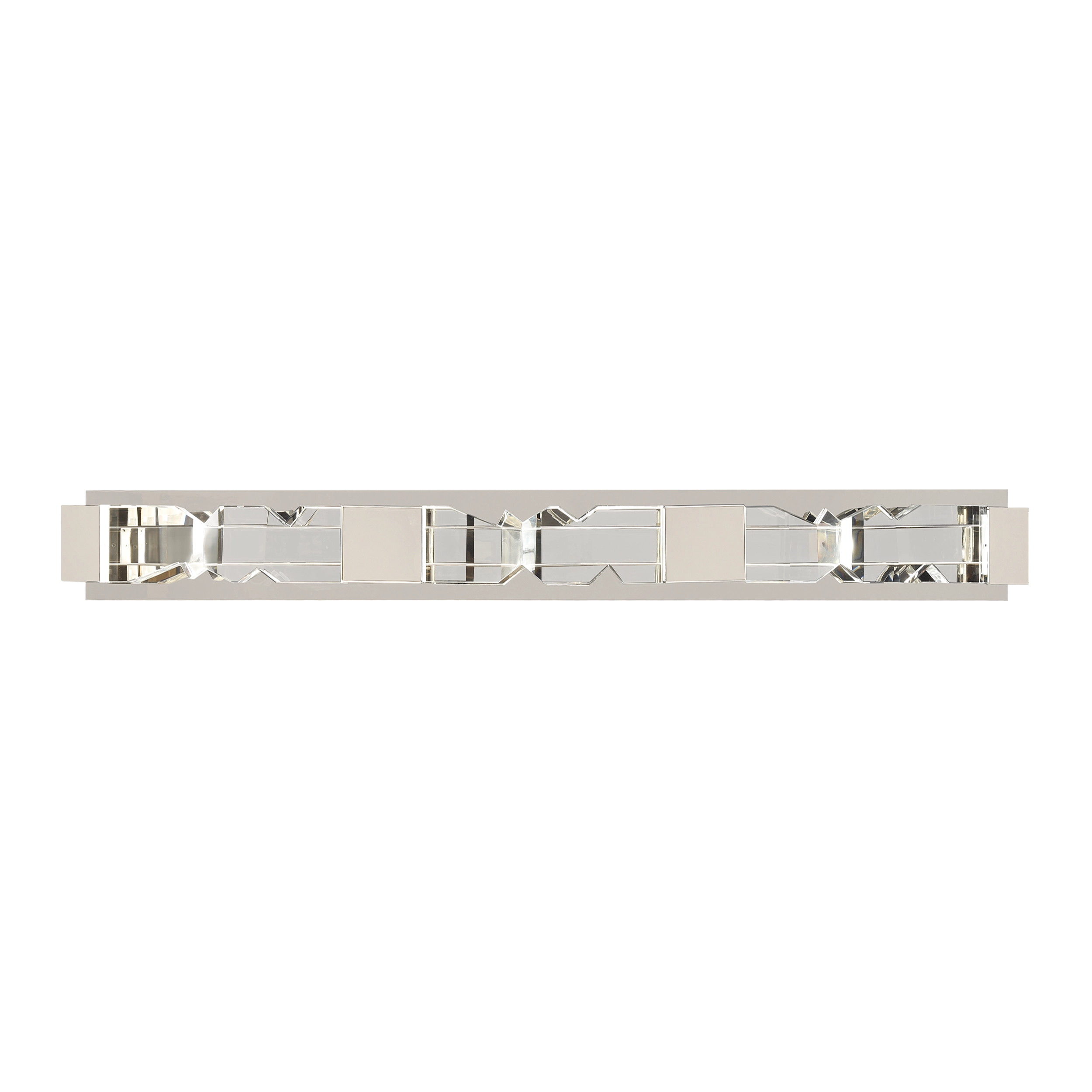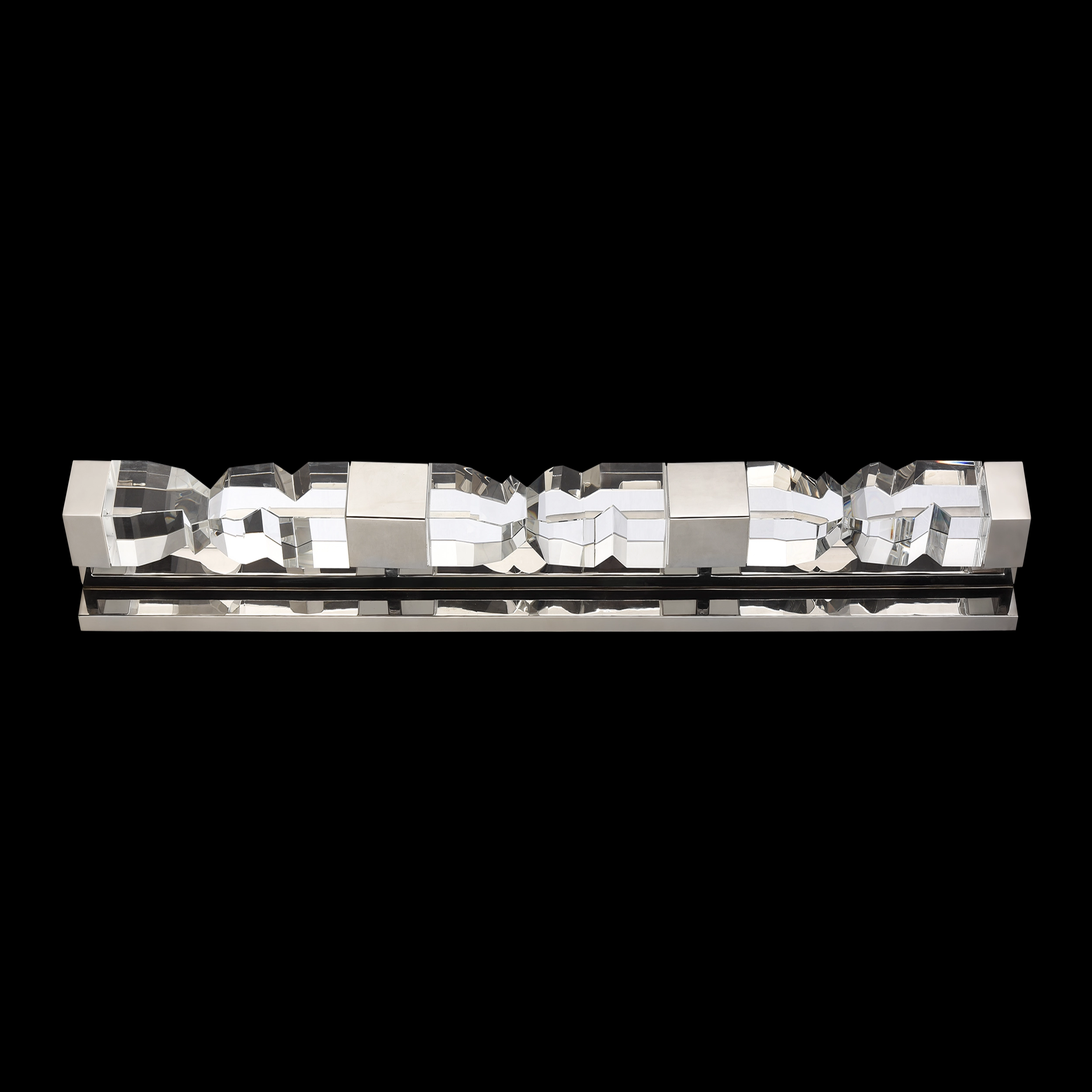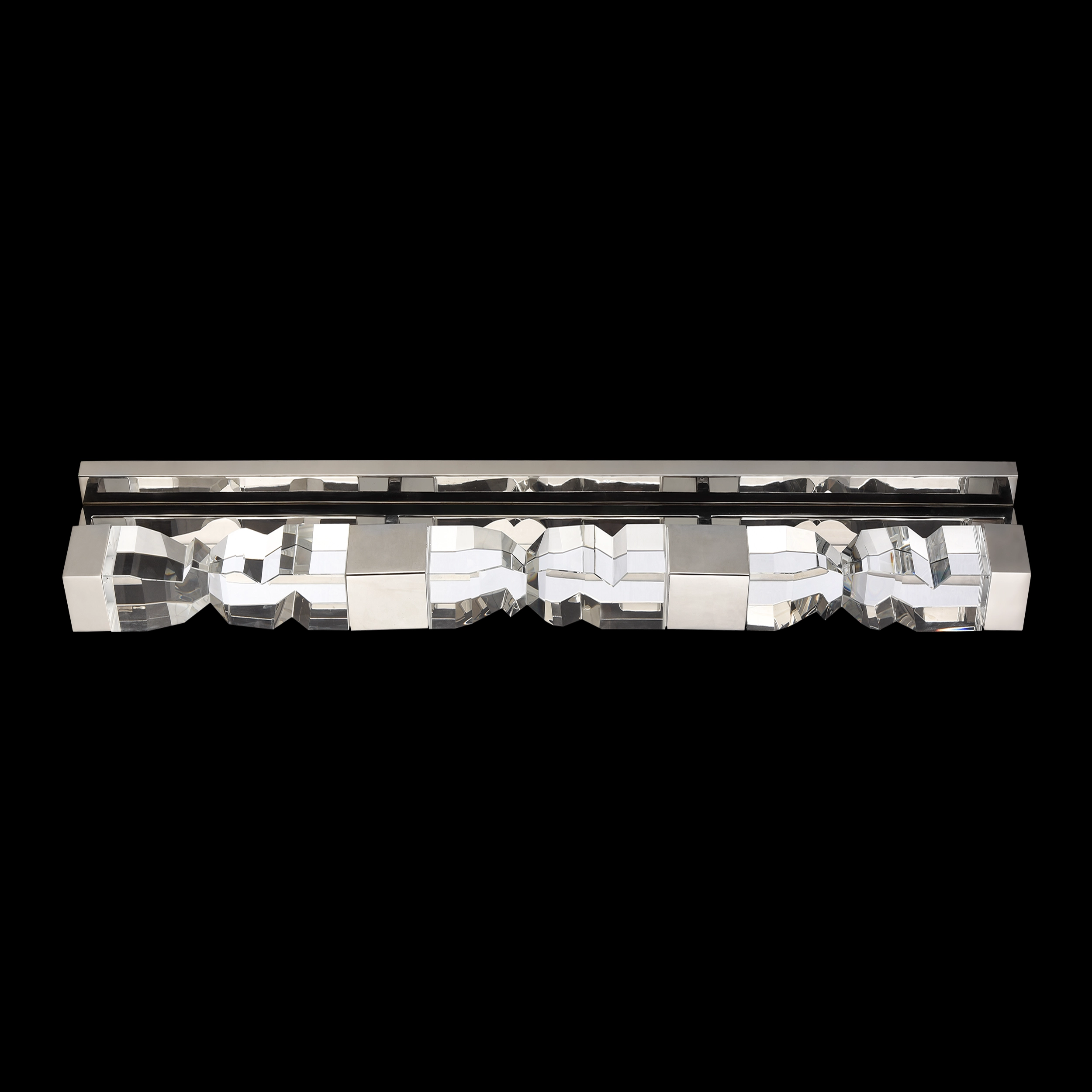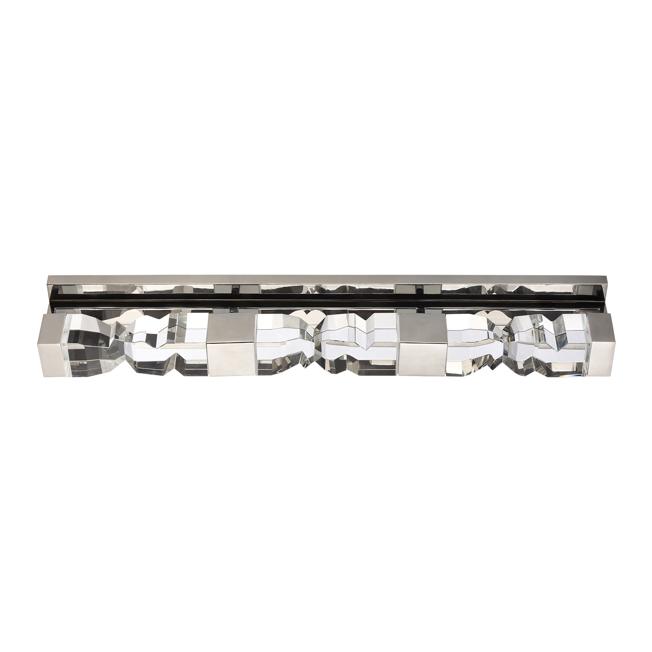 LED 54" 6-light hand formed and polished heavy gauge 3" x 3" linear crystal vanity light, with deep edges and slants with each side unique. Refined iron metal details with our luxurious polished nickel finish. Integrated Replaceable LED with 3CCT 3000K, 3500K and 4000K.