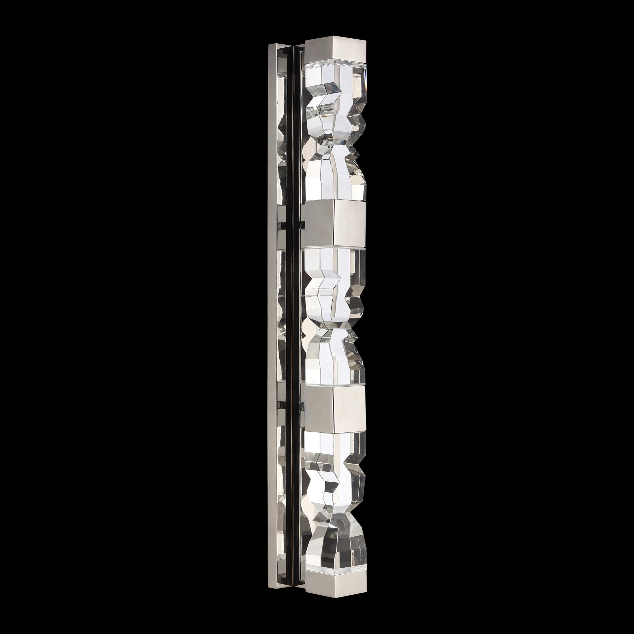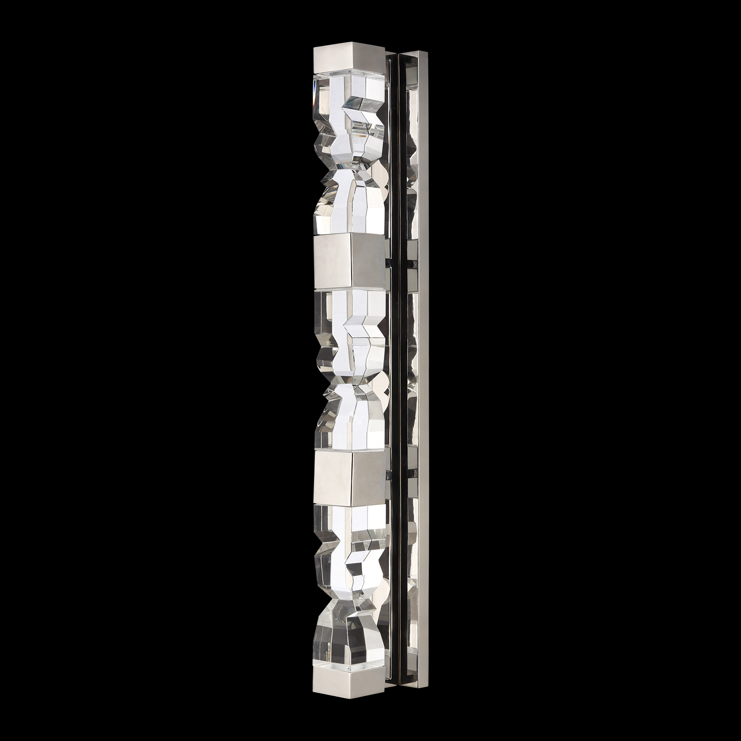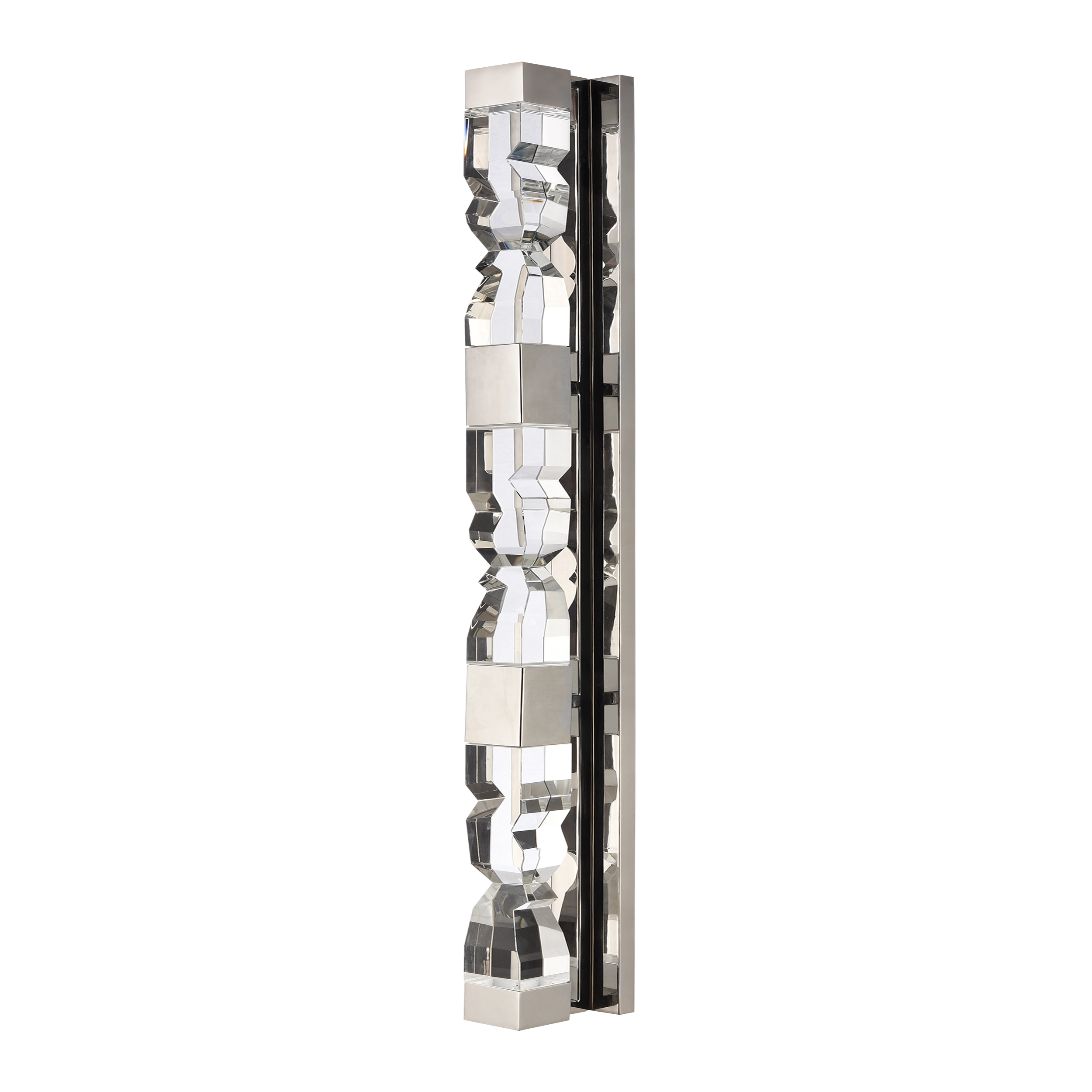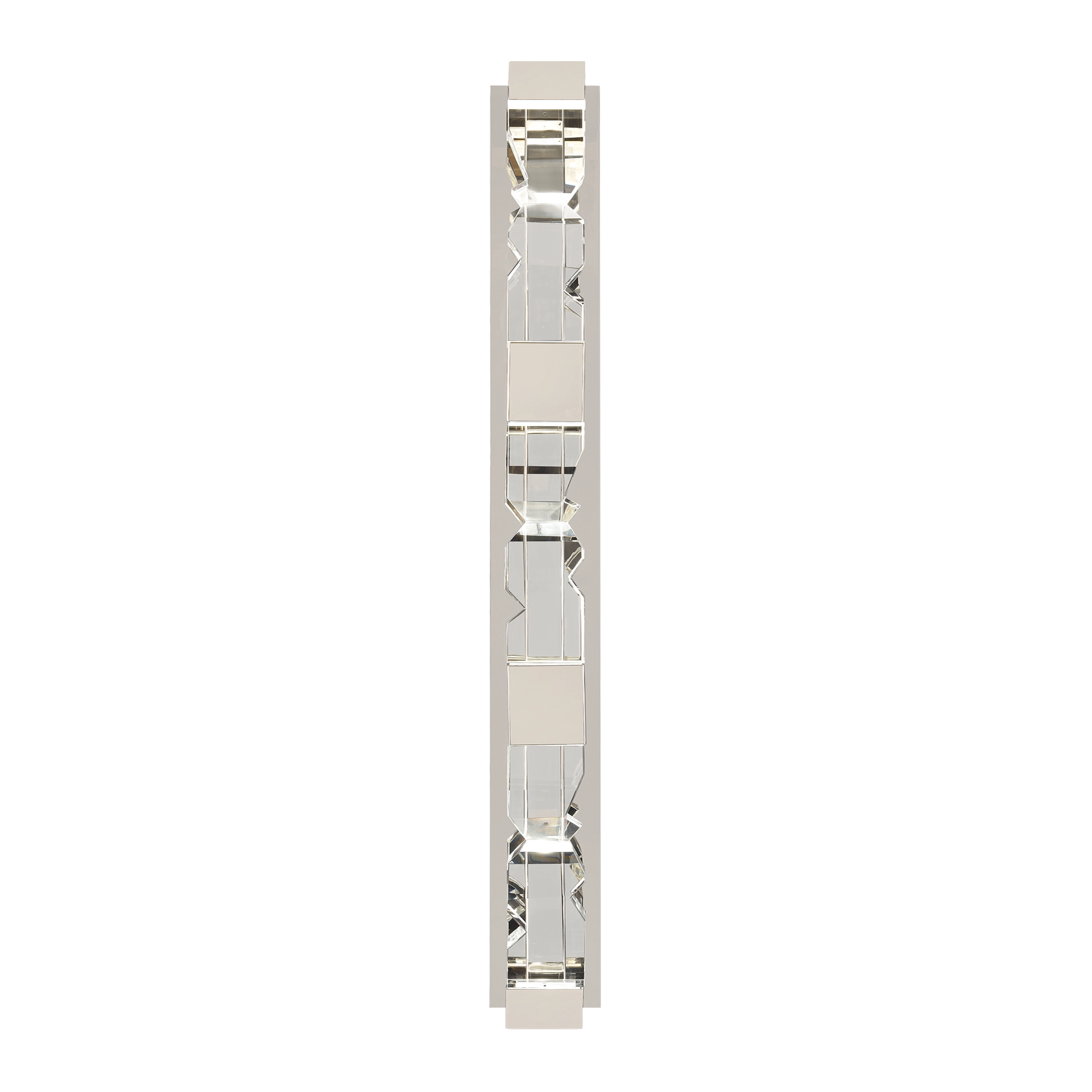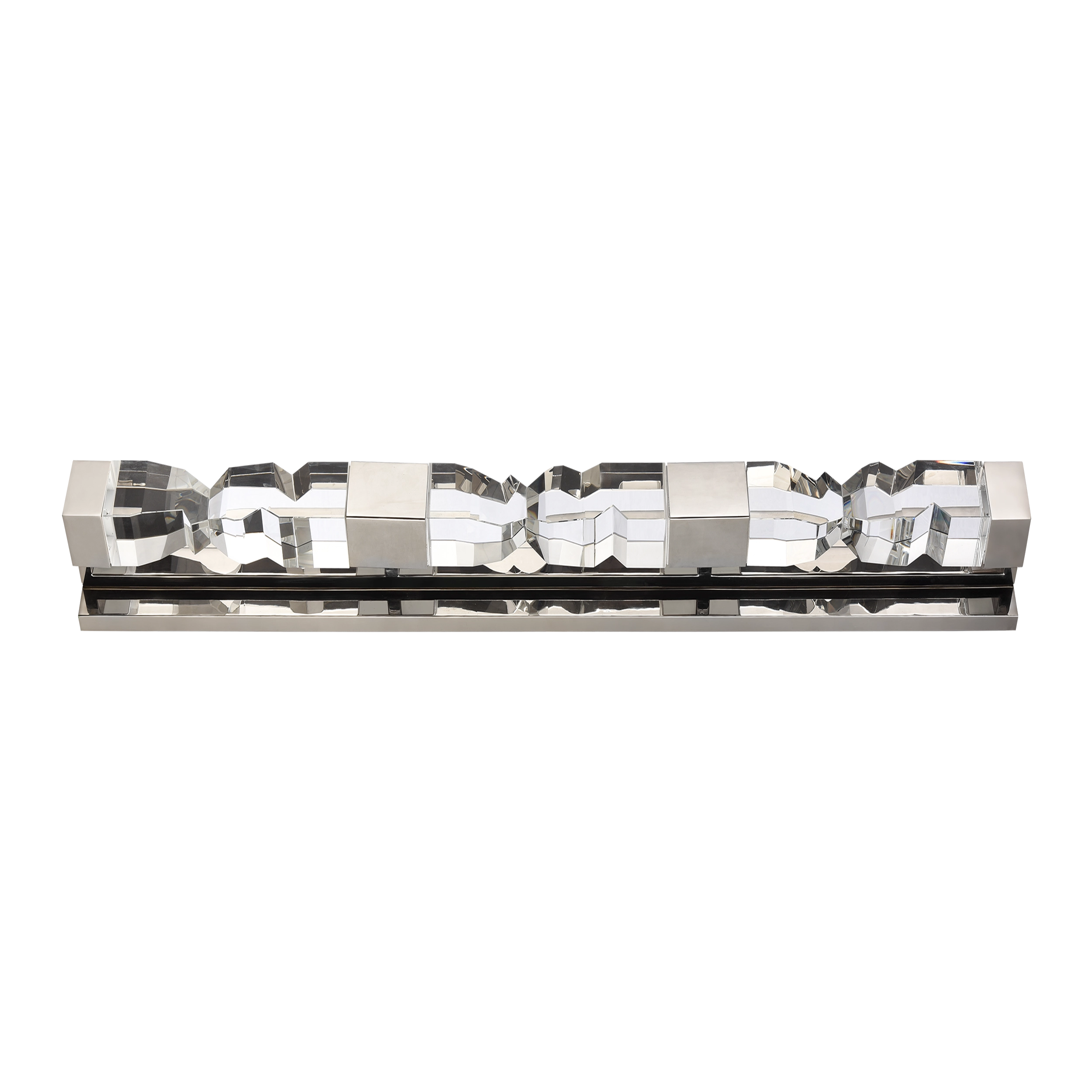 LED 54" 6-light hand formed and polished heavy gauge 3" x 3" linear crystal vanity light, with deep edges and slants with each side unique. Refined iron metal details with our luxurious polished nickel finish. Integrated Replaceable LED with 3CCT 3000K, 3500K and 4000K.