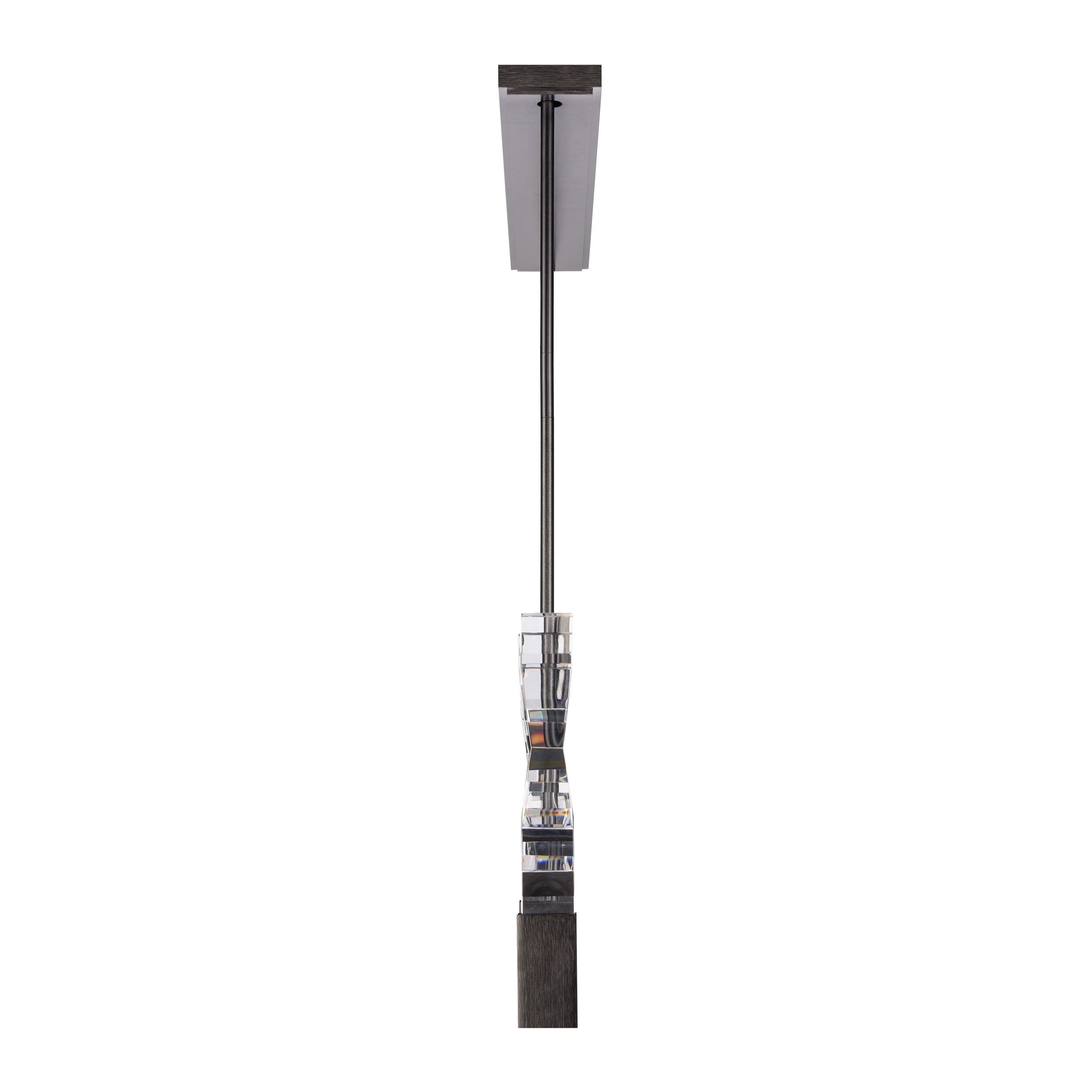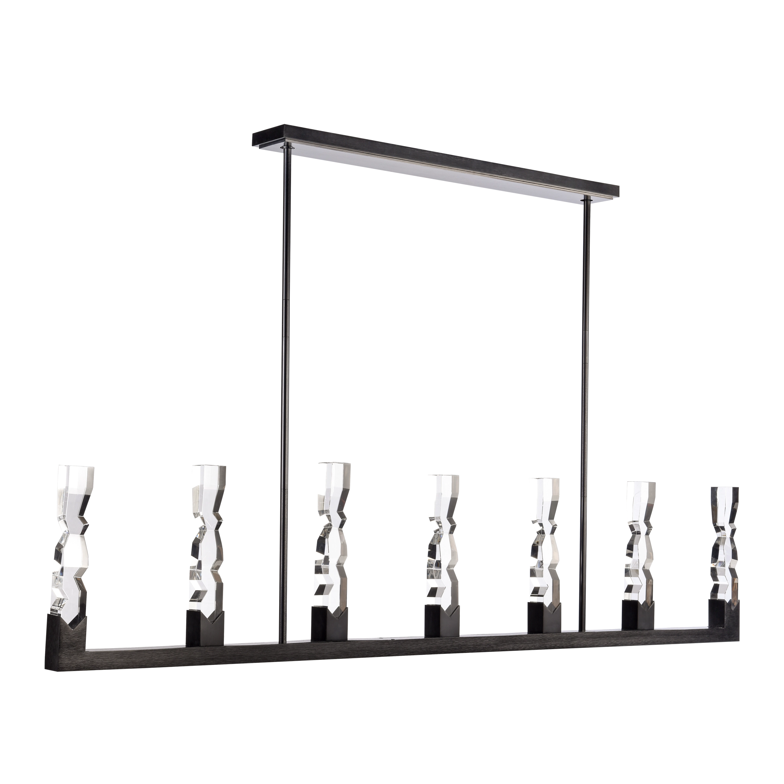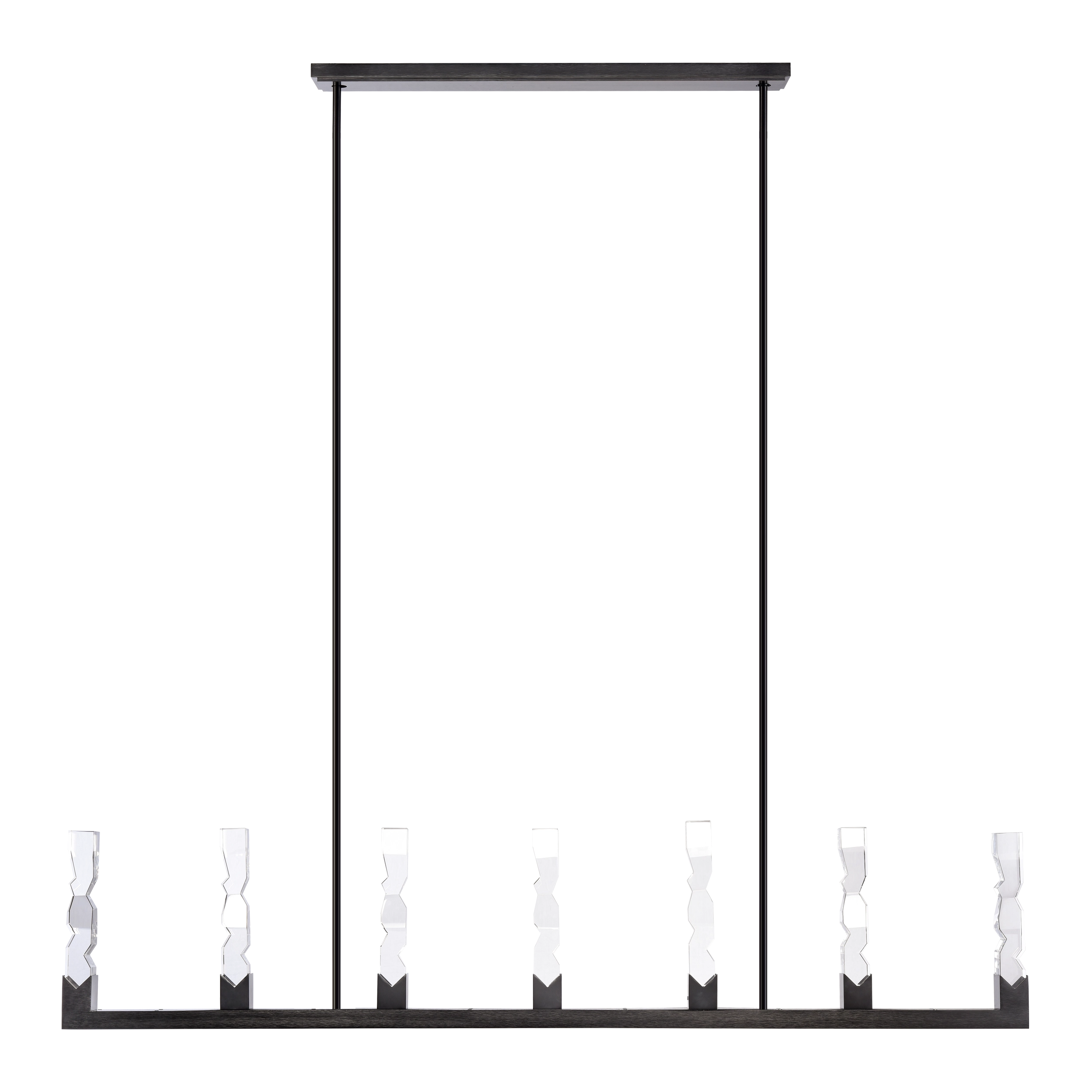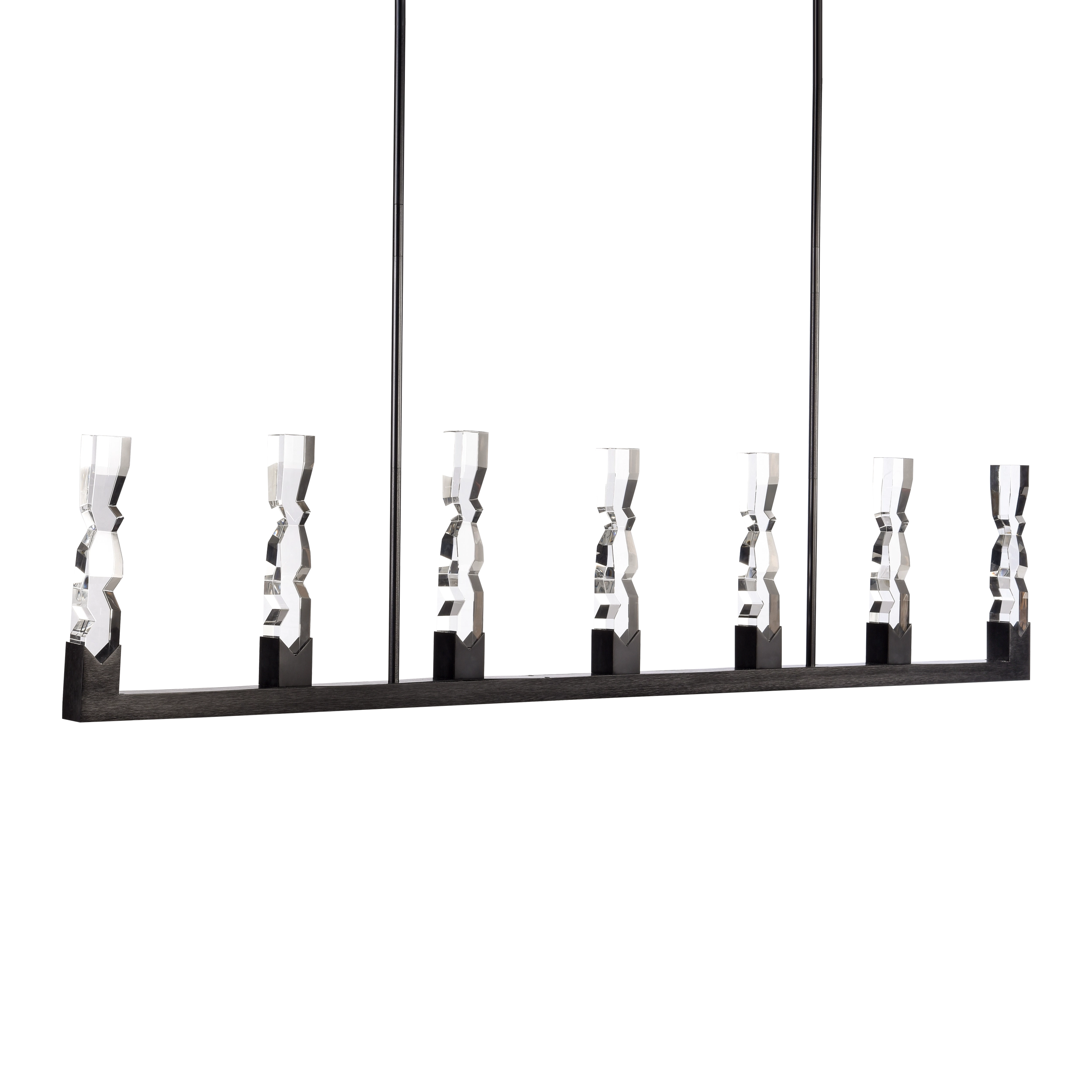 Grand 72" LED 7-light linear pendant including hand formed and polished heavy gauge 2" x 2" crystals with deep edges and slants with each side unique. Refined iron metal details with our sleek satin brushed black finish. Integrated Replaceable LED with 3CCT 3000K, 3500K and 4000K.