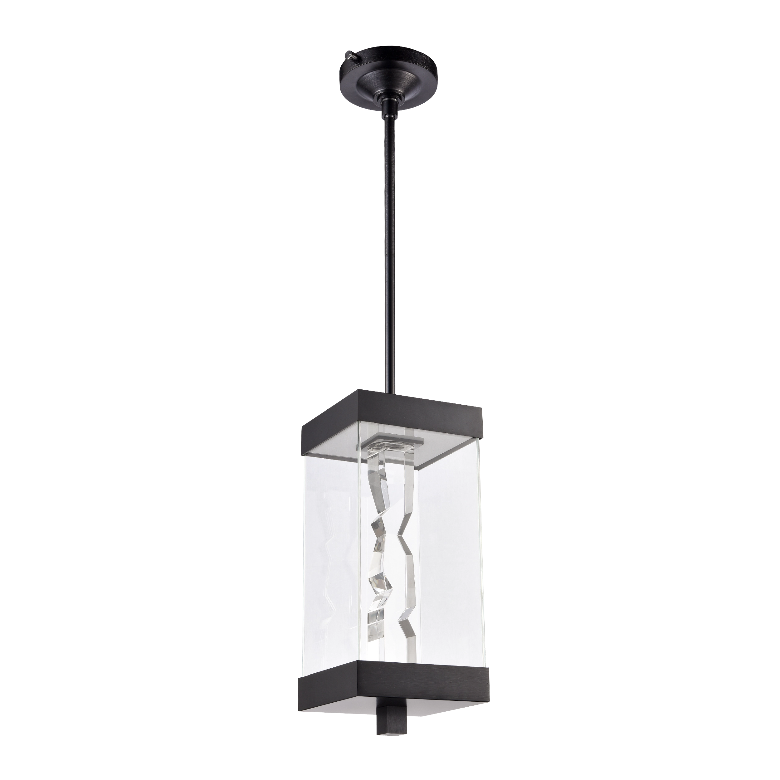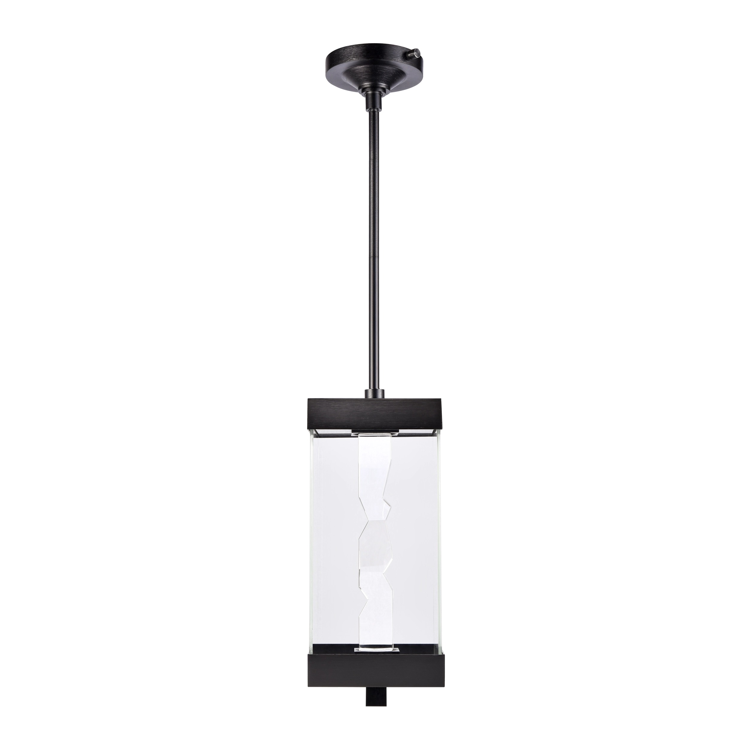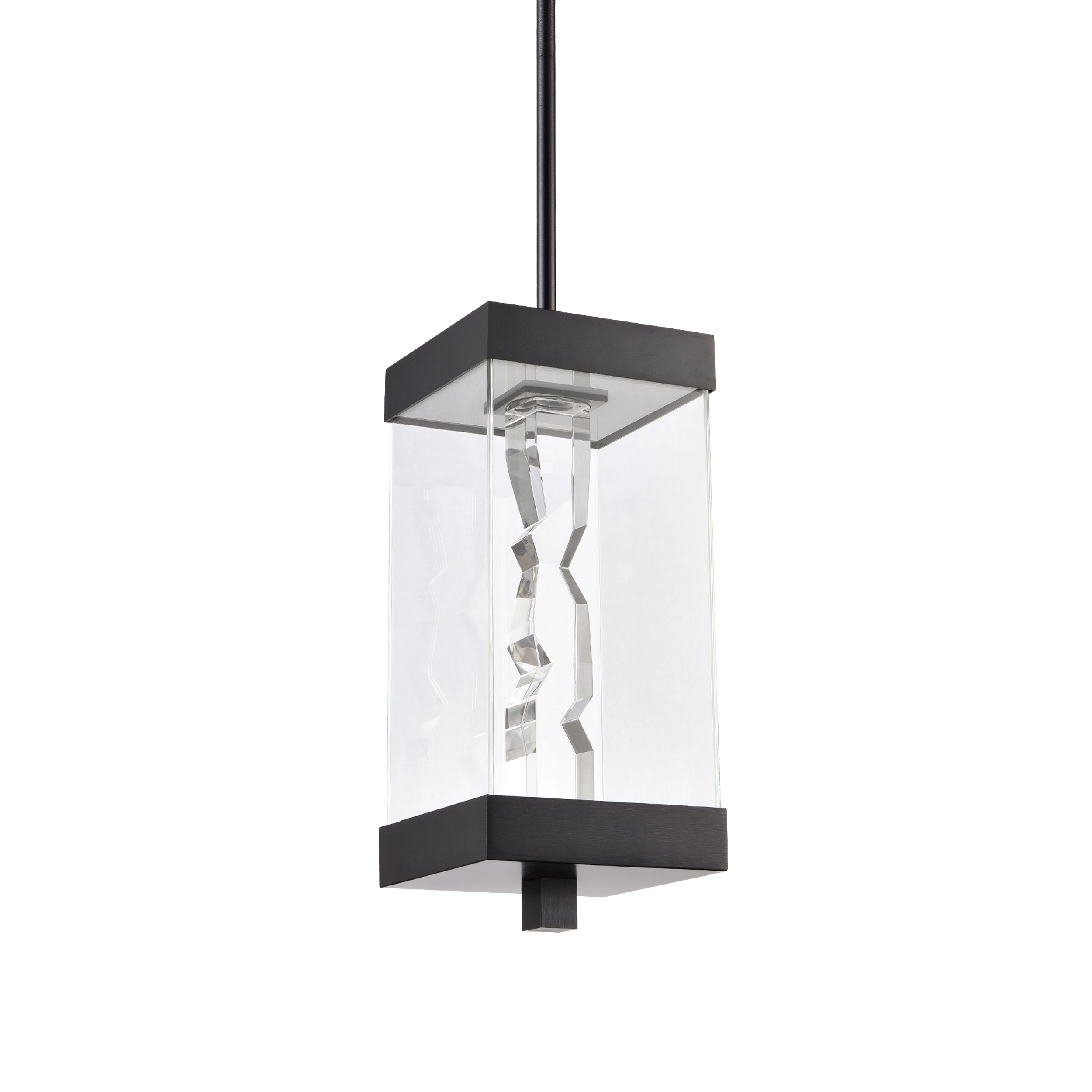 Modern 18" 2-Light Exterior Glass Incased Crystal Pendant Light. Hand formed and polished heavy gauge 2" x 2" crystal with deep edges and slants with each side unique. Refined metal details with our marine grade sleek satin brushed black finish. Equipped with a 3 way switch to showcase the crystal or glass on only or both together, with our powerful LED technology which is easily replaceable and 5CCT 2700K, 3000K, 3500K, 4000K, 5000K.