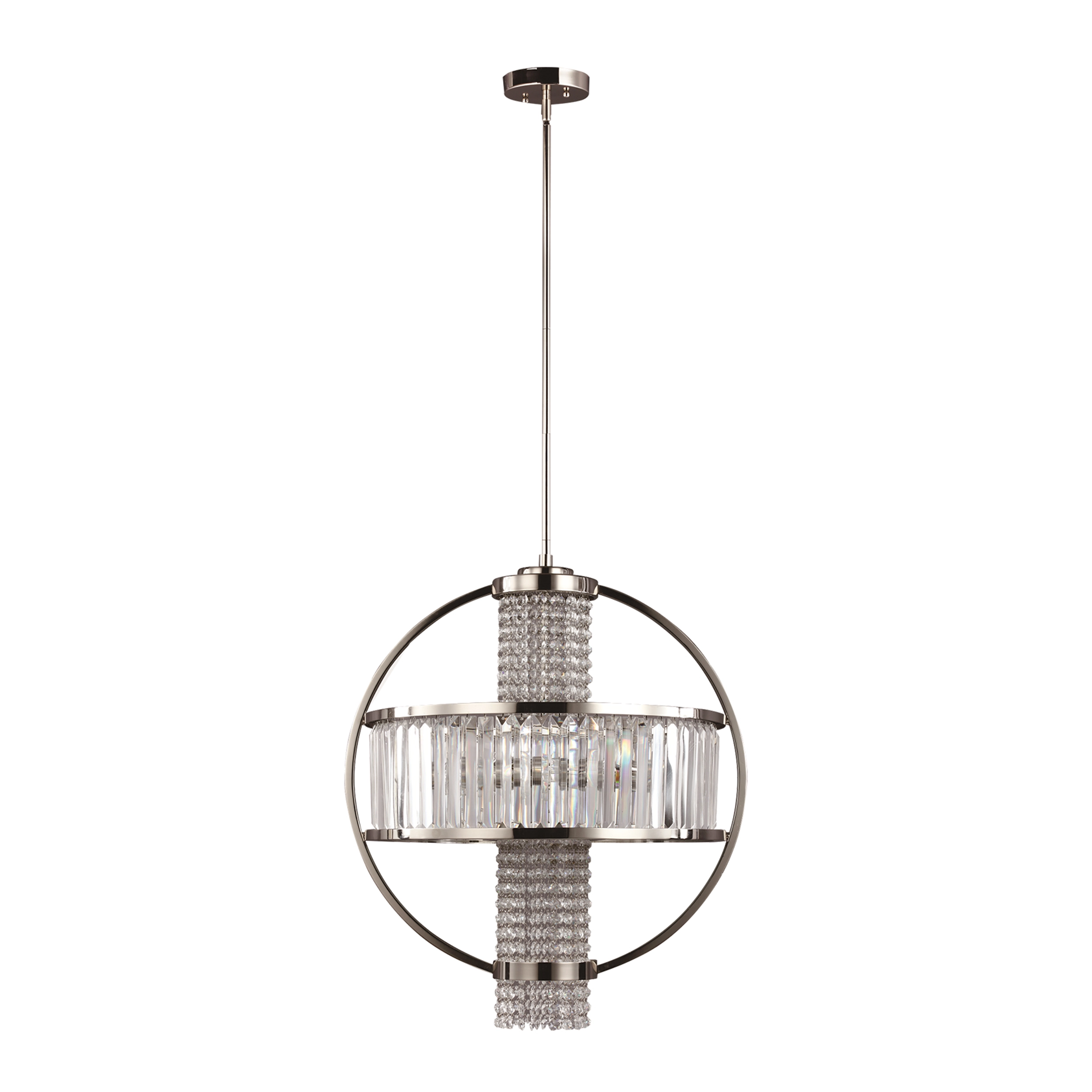 4-Light 22" Crystal Hybrid Chandelier with Inner Clear Prism Drum Shade and Clear Round Crystal Strands. Polished Nickel Finished Banded Shade Details with in Sleek Outer Ring.