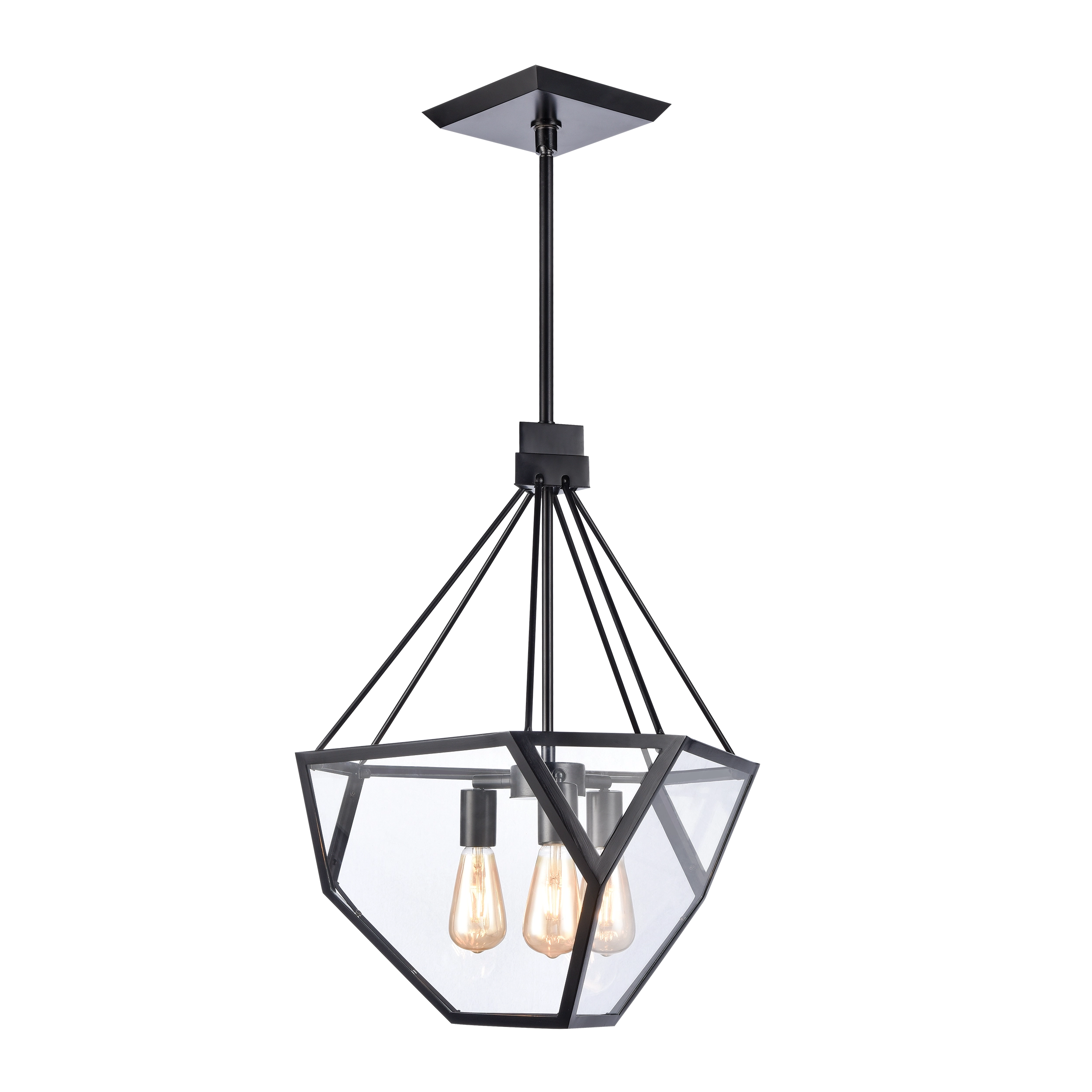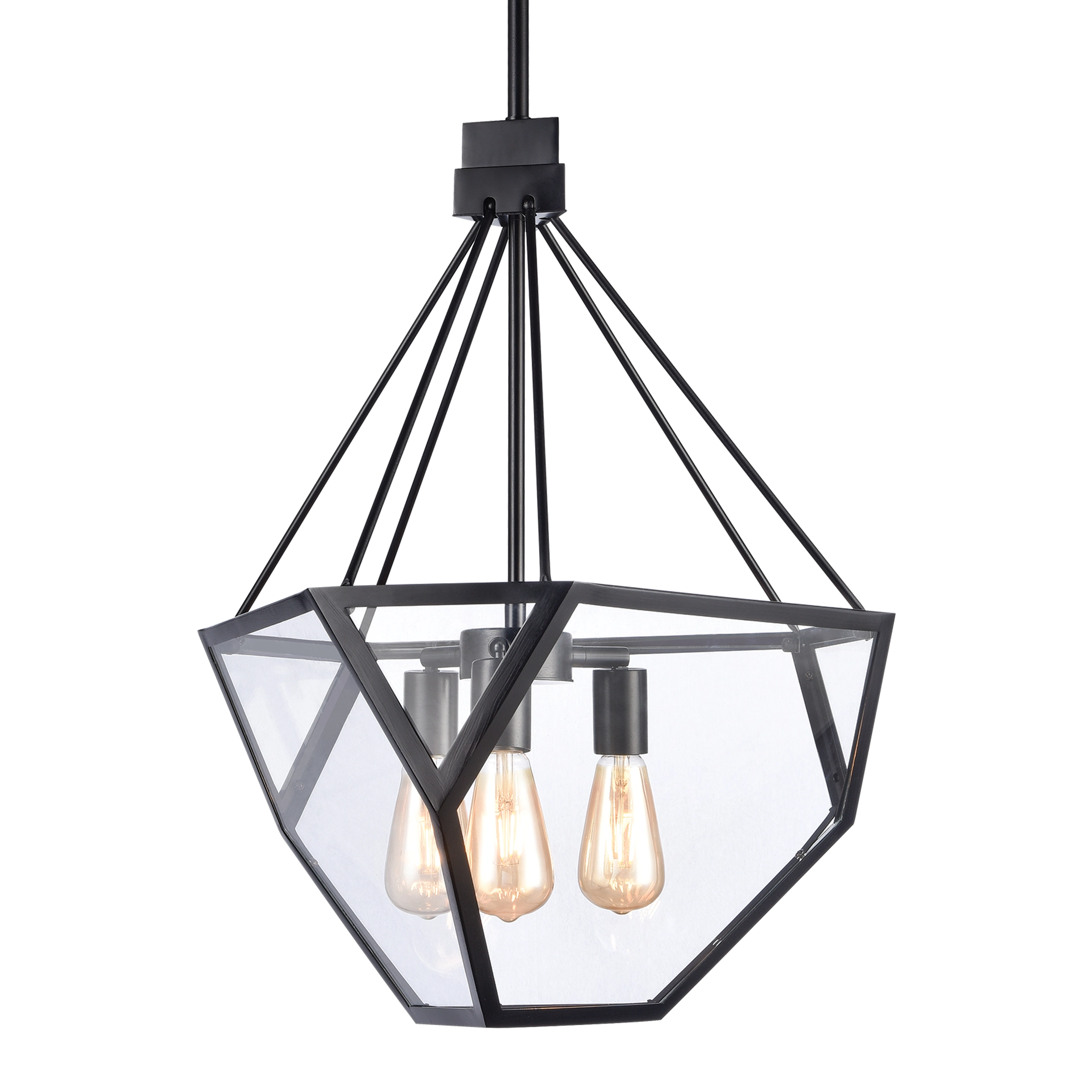 3-Light 21" Architectural Chandelier with Clear Glass & Frosted Glass Panels Included and Satin Brushed Black Metal Finish.