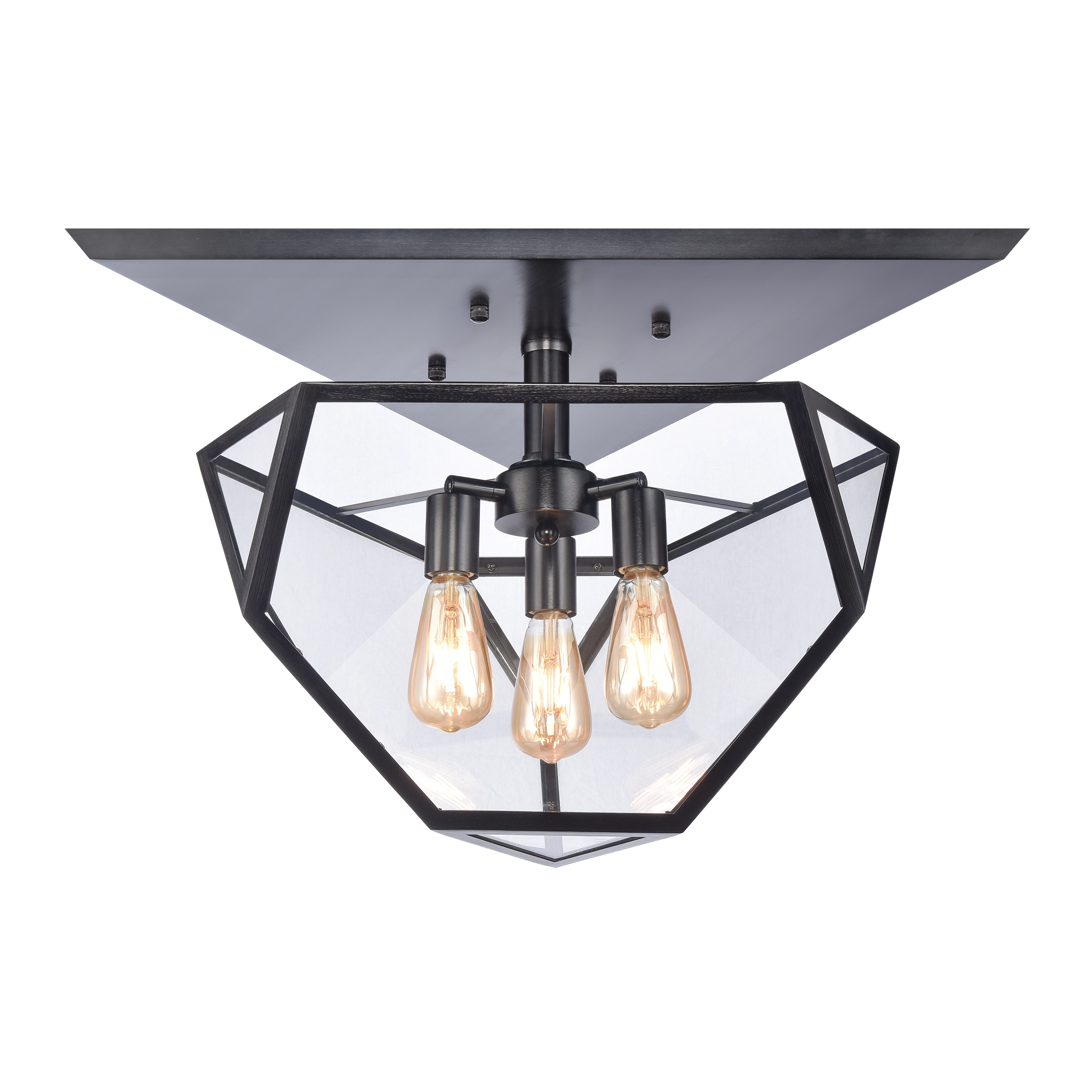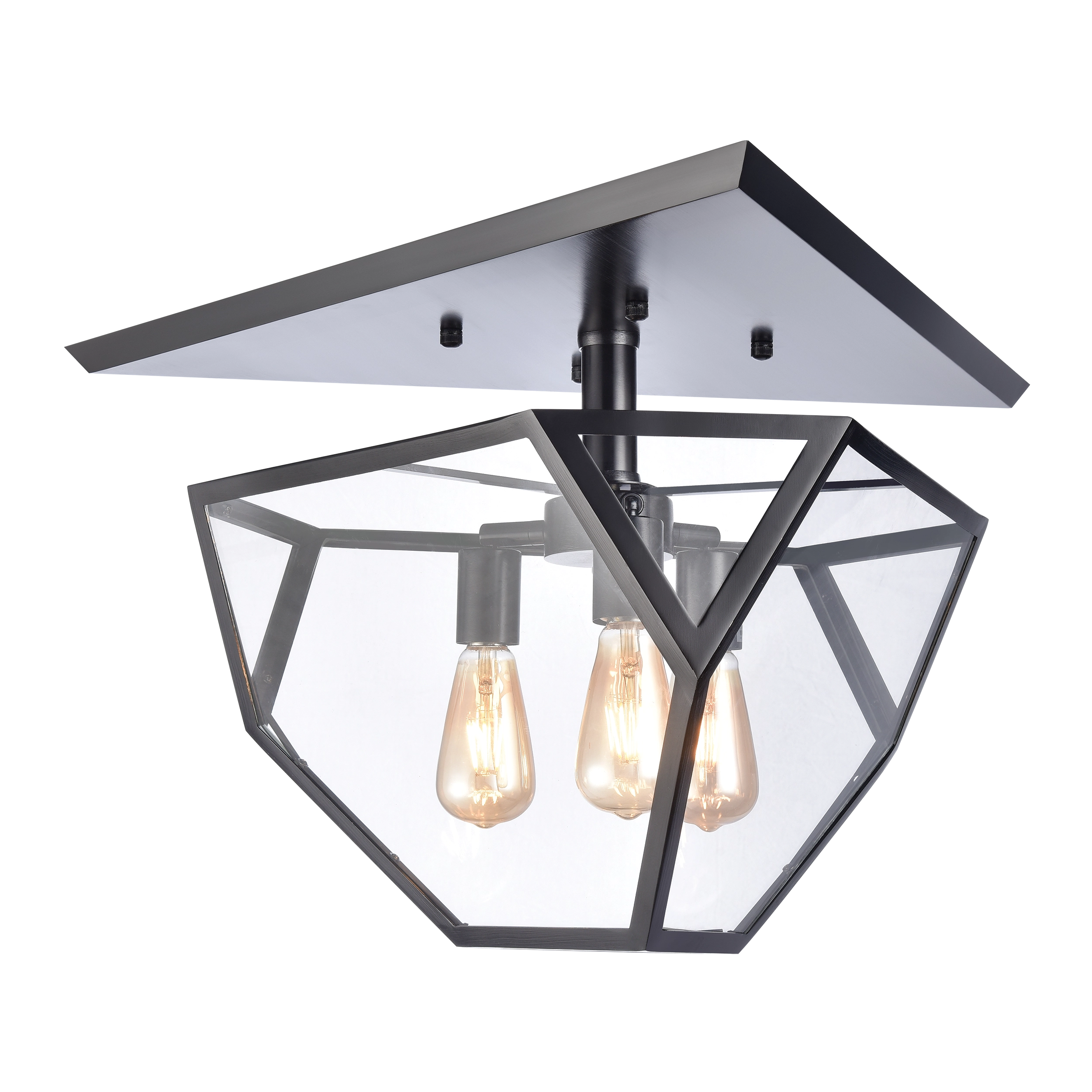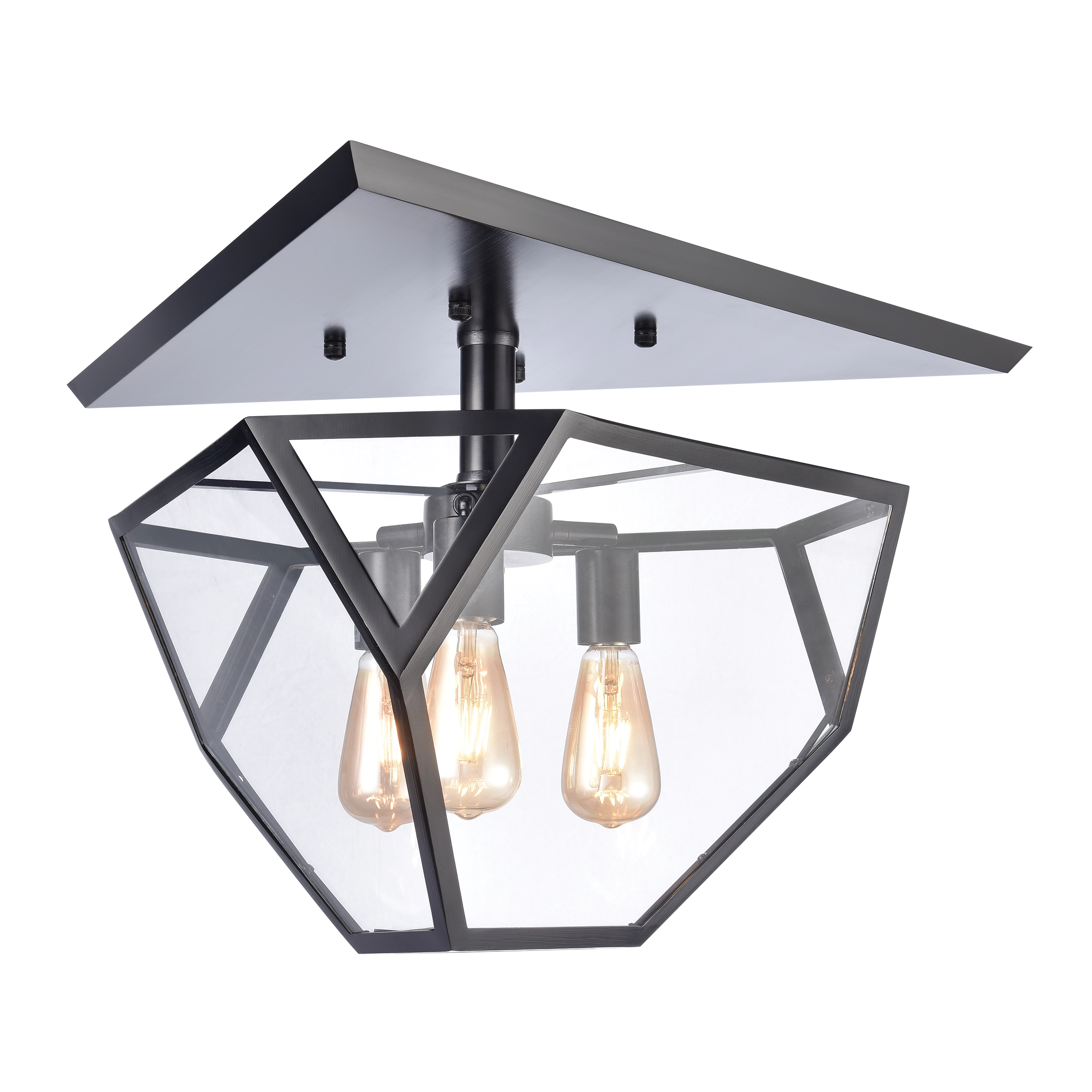 3-Light 21" Architectural Semi-Flush Mount with Clear Glass & Frosted Glass Panels Included and Satin Brushed Black Metal Finish.