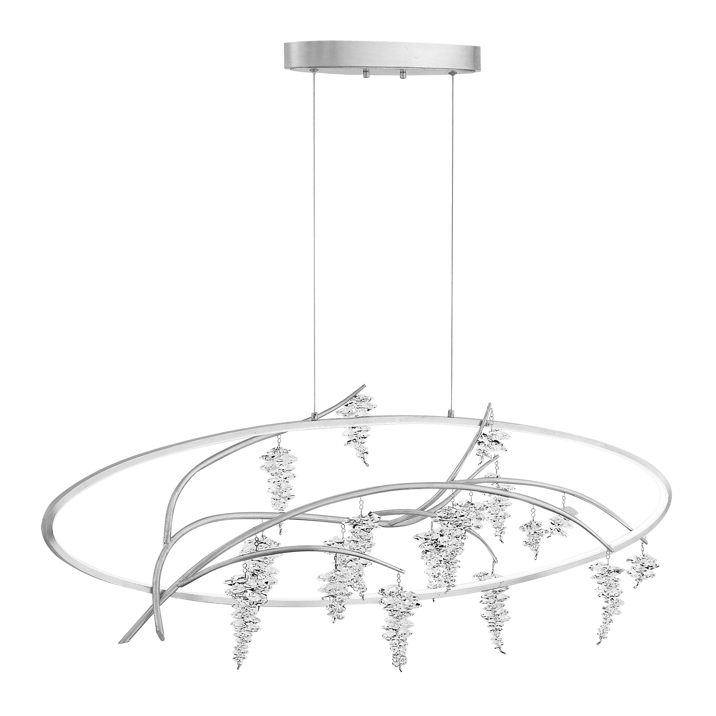 LED 48" Organic Oval Linear Chandelier with Grape Like Clusters of Clear Crystals attached to Vine Styled Arms. Silver Leaf Metal Finish.