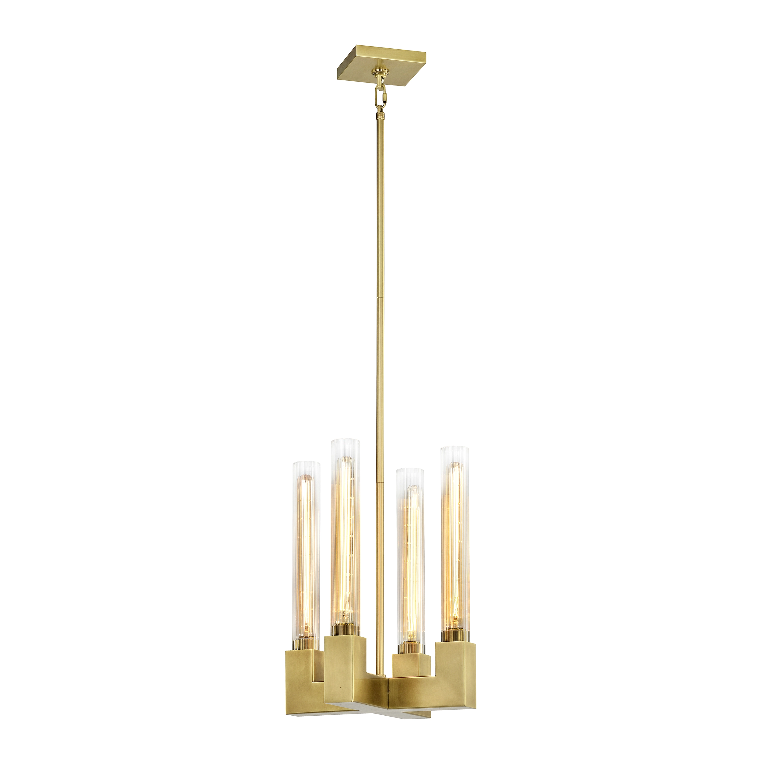 4-Light 12" Arm Styled Square Pendant with Clear Fluted Cylindrical Glass Shades Settled on a Sleek Aged Brass Arm Styled Frame.