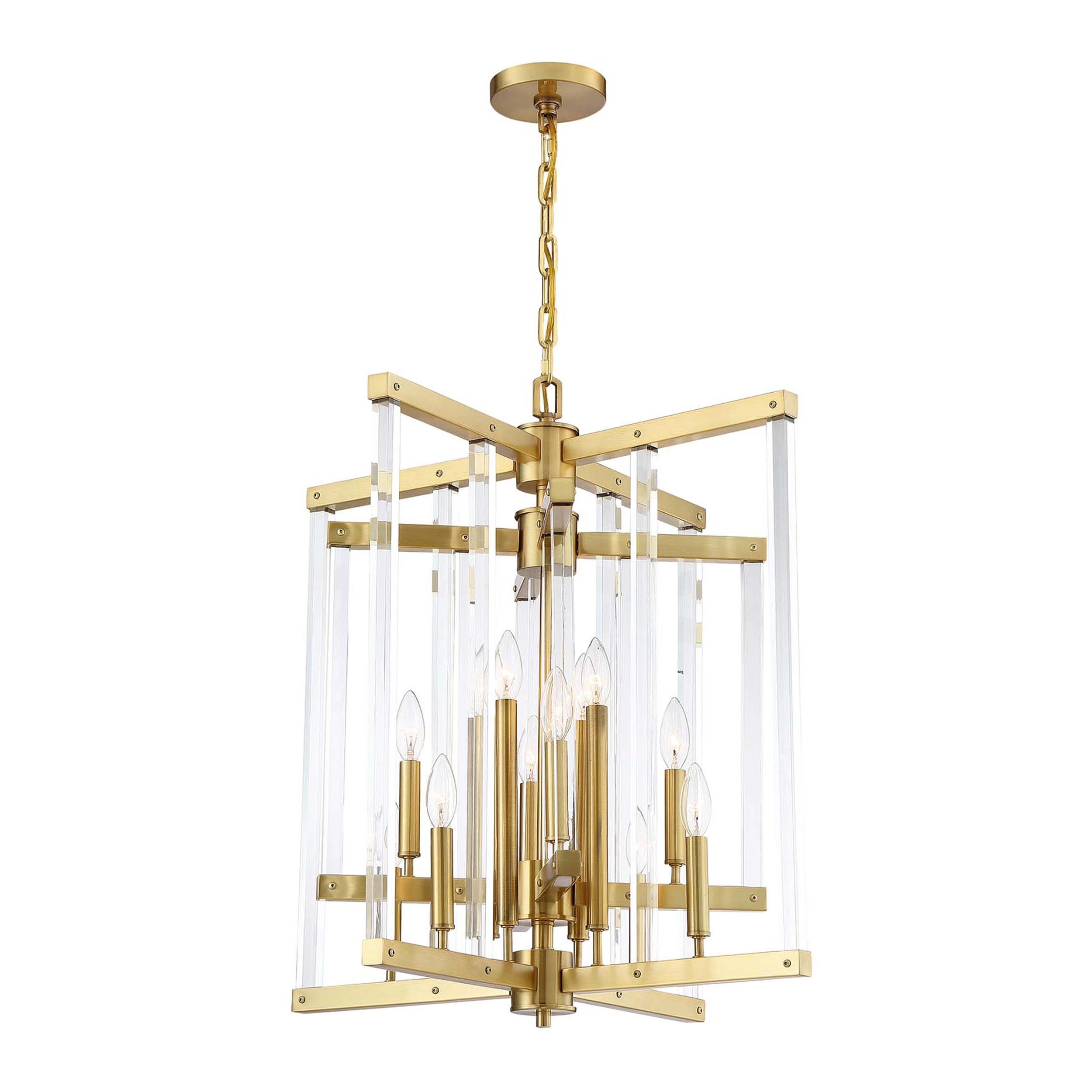 12-Light 24" Geometric Chandelier with Clear Acrylic Deco Frame Details and Polished Brass Metal Finish.