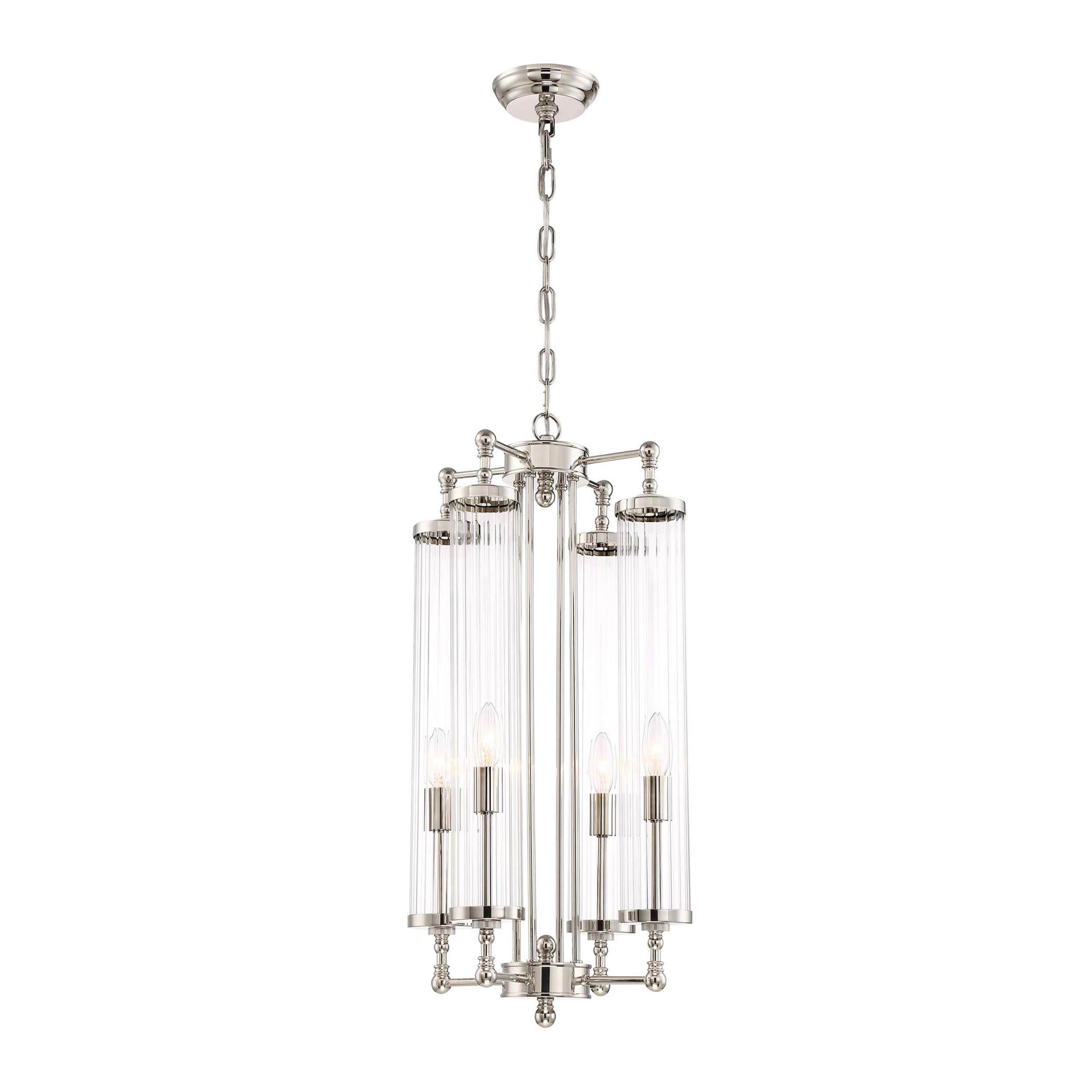 4-Light 14" Decorative Vertical Pendant with Clear Fluted Cylindrical Glass Shades within Decorative Polished Nickel Finished Metal Frame.