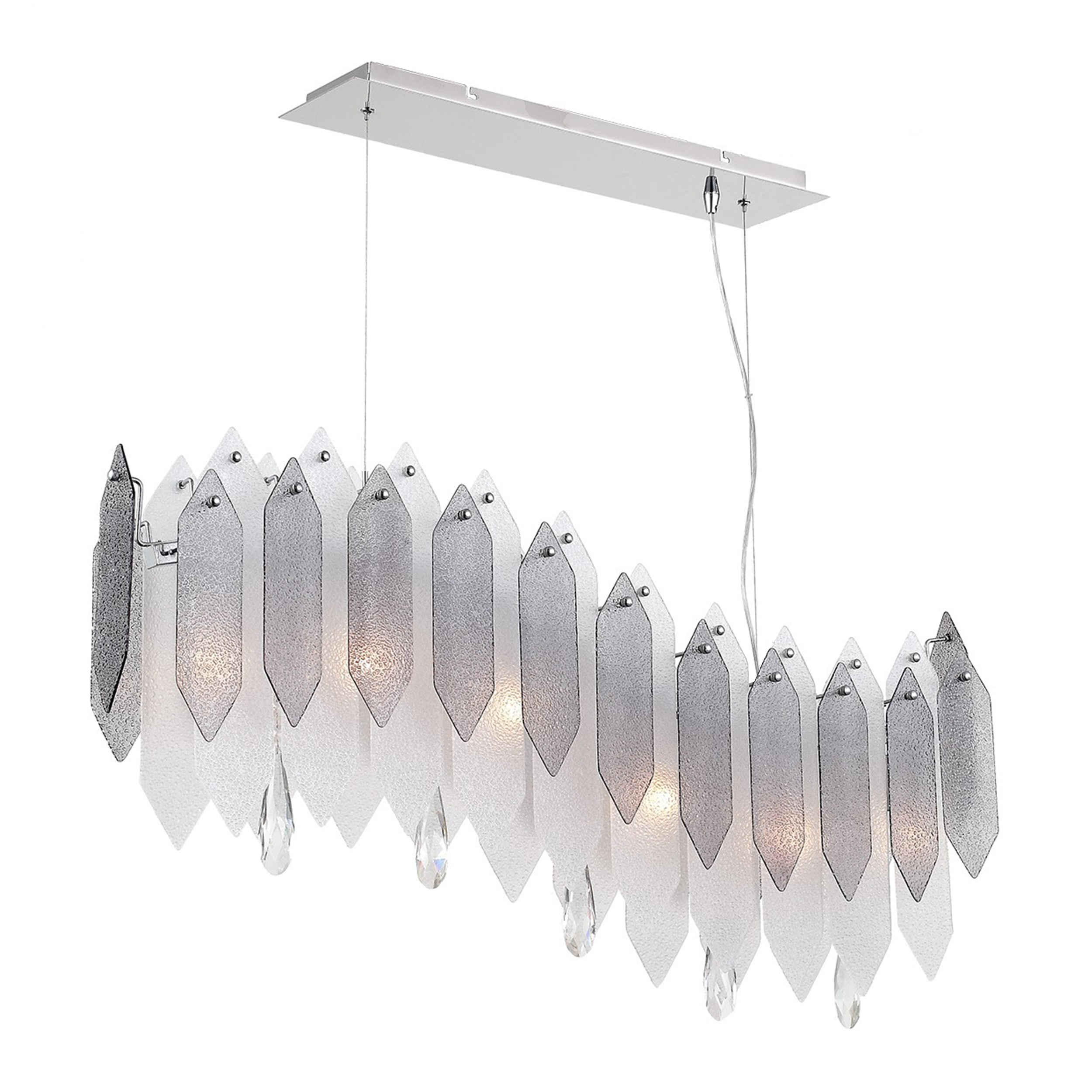 6-Light 40" Linear Chandelier with Frosted White & Smoked Water Styled Glass Petals in the Shape of a Wave. Clear Faceted Tear Drop Crystals and Polished Chrome Finished Metal Details.