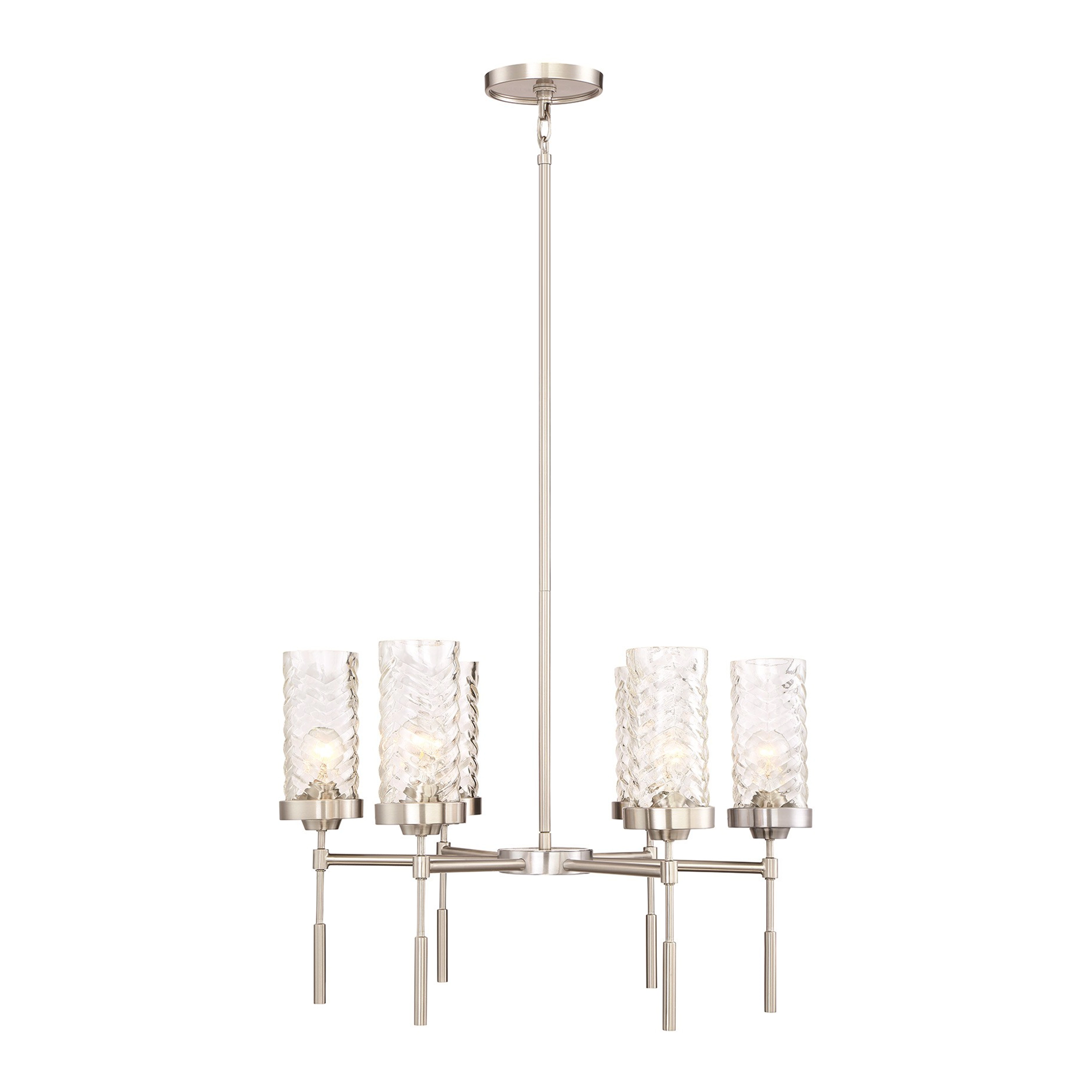 6-Light 26" Armed Chandelier with Individual Clear Wave Styled Cylindrical Glass Shade on a Brushed Nickel Decorative Metal Frame.