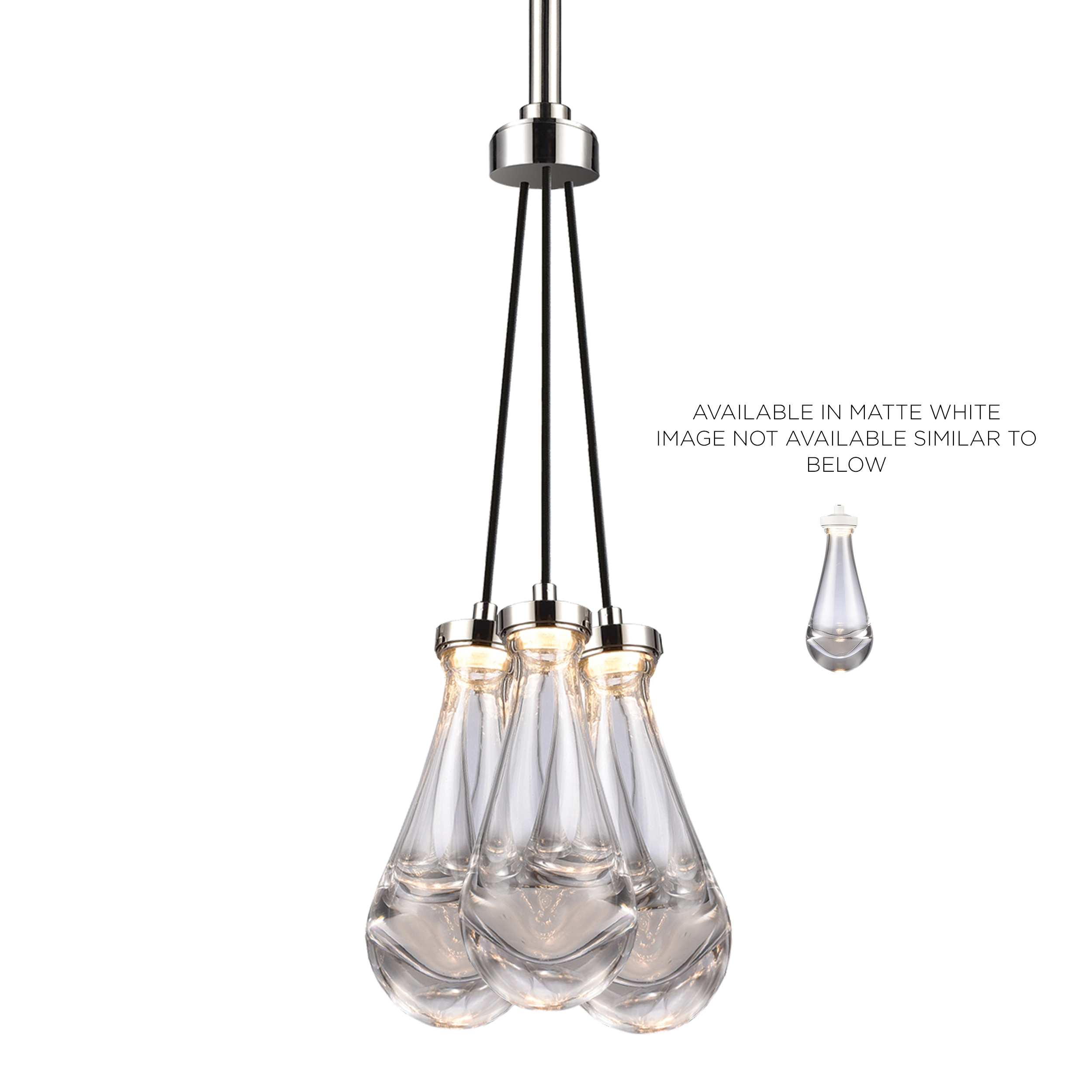 LED 3-light 11" cluster pendant light with solid heavy clear glass shaped as a rain drop. Refined metal details with our chic matte white finish. Integrated Replaceable LED with 3CCT 3000K, 3500K and 4000K.