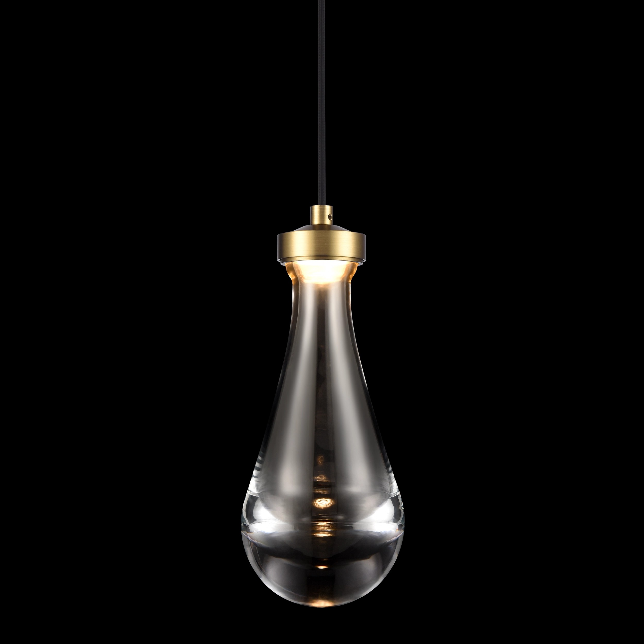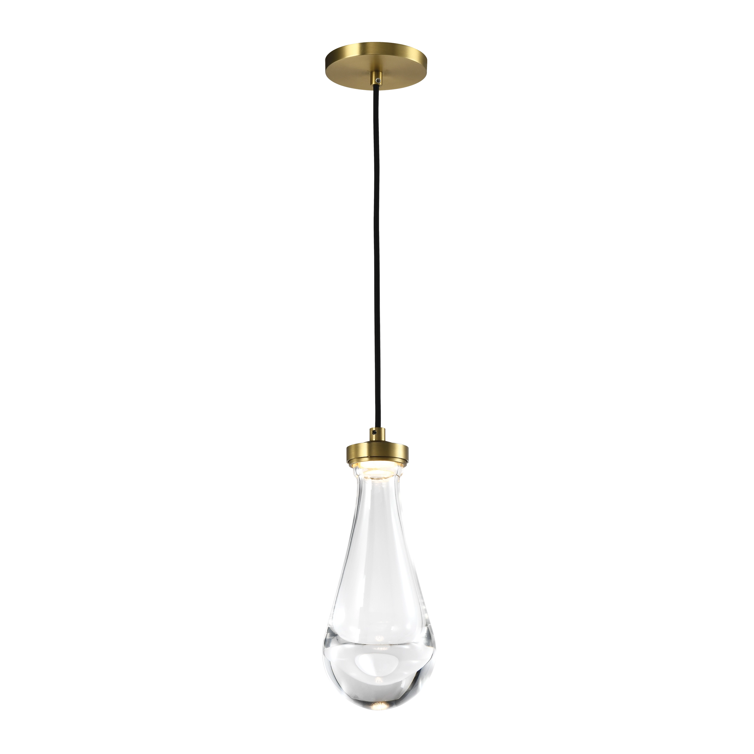 LED 5" Mini-Pendant with solid heavy clear glass shaped as a rain drop. Refined metal details with our premium aged brass finish. Integrated Replaceable LED with 3CCT 3000K, 3500K and 4000K and optional installation of suspension stems or just hang by black weaved fabric wire.