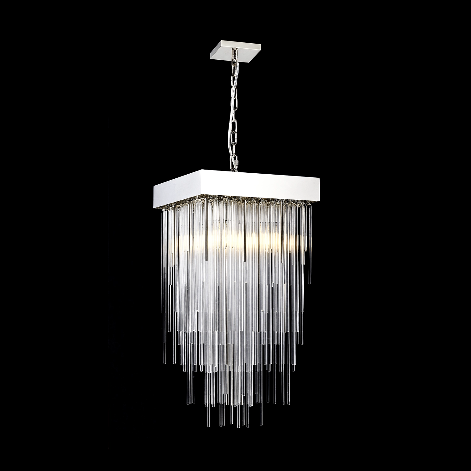4-Light 12" Square Glass Pendant Light with Multi-Sized Clear Curved Glass Stems combined with Polished Nickel Finished Stems within Sleek Metal Shade.