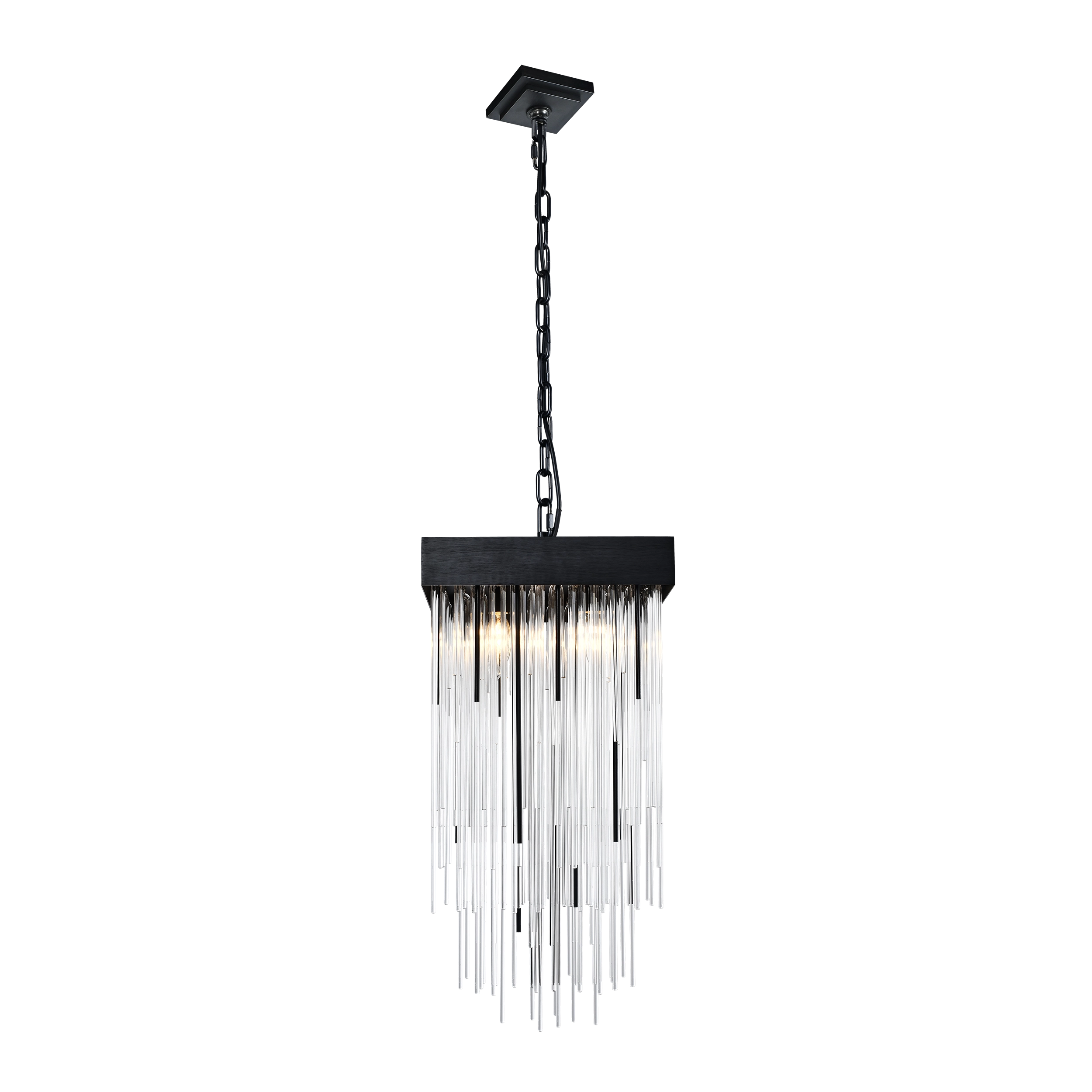 4-Light 12" Square Glass Pendant Light with Multi-Sized Clear Curved Glass Stems combined with Satin Brushed Black Finished Stems within Sleek Metal Shade.