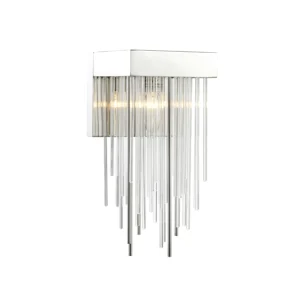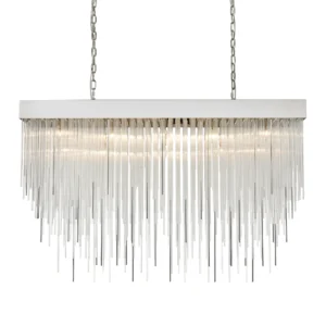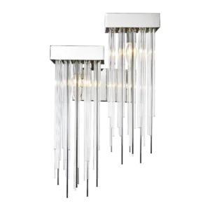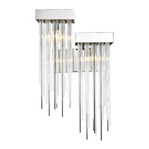 | Glass Details | Various off sized curved crystal clear slim cylindrical glass peduncles, combined with finished solid steal stems. |