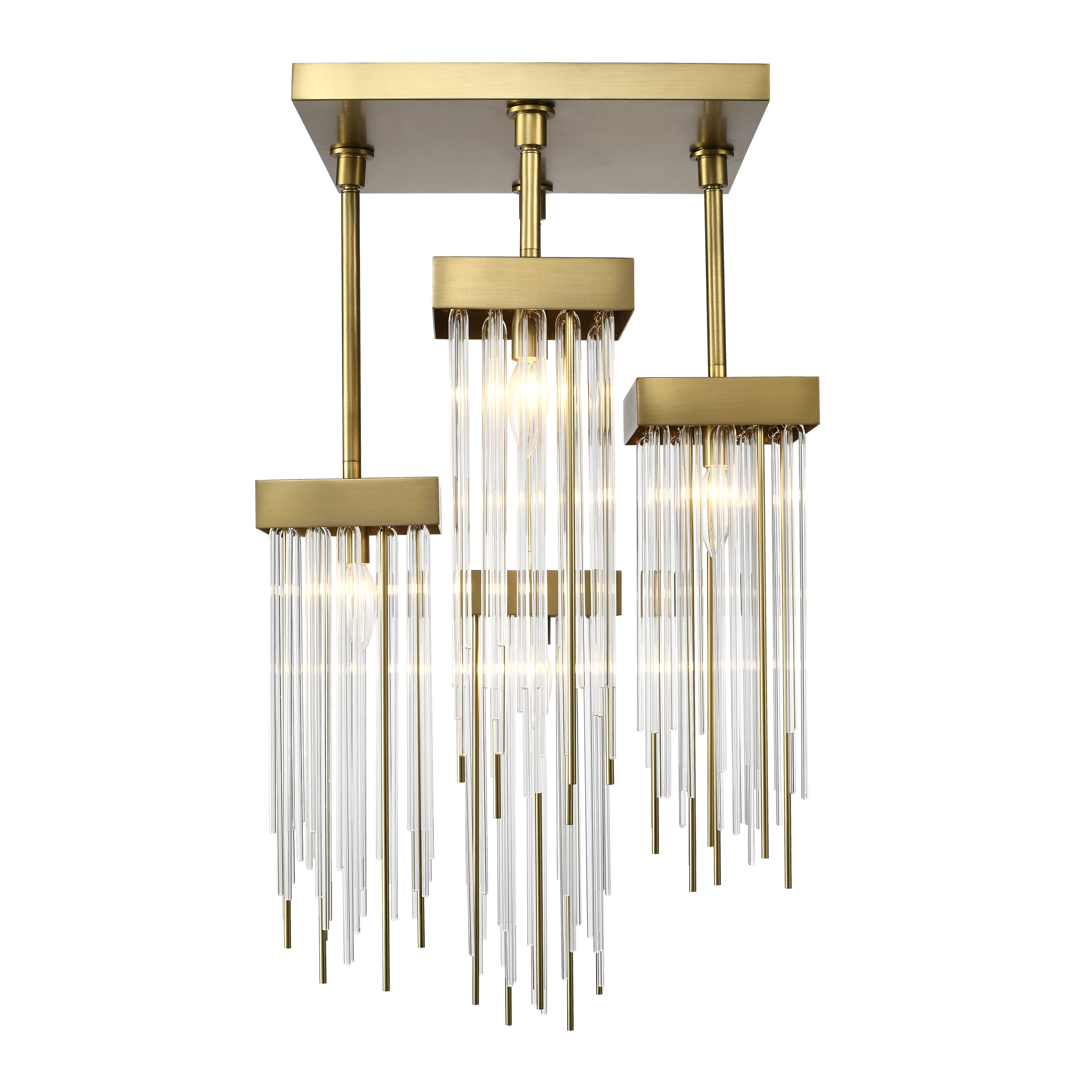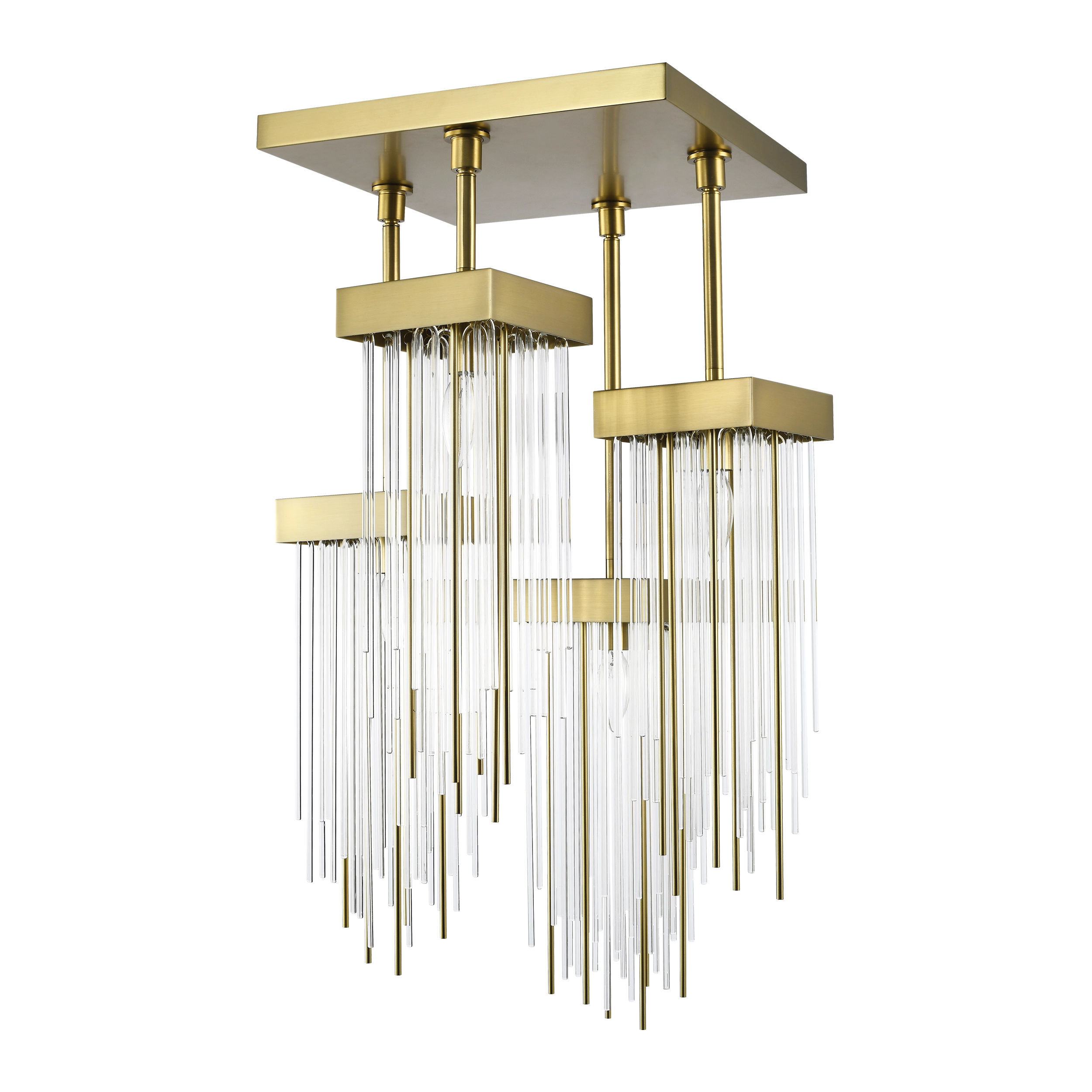 4-Light 18" Designer Cityscape Semi-Flush Mount with Multi-Sized Clear Curved Crystal Stems combined with Solid Metal Stems. Refined Metal Details with our Premium Aged Brass Finish.