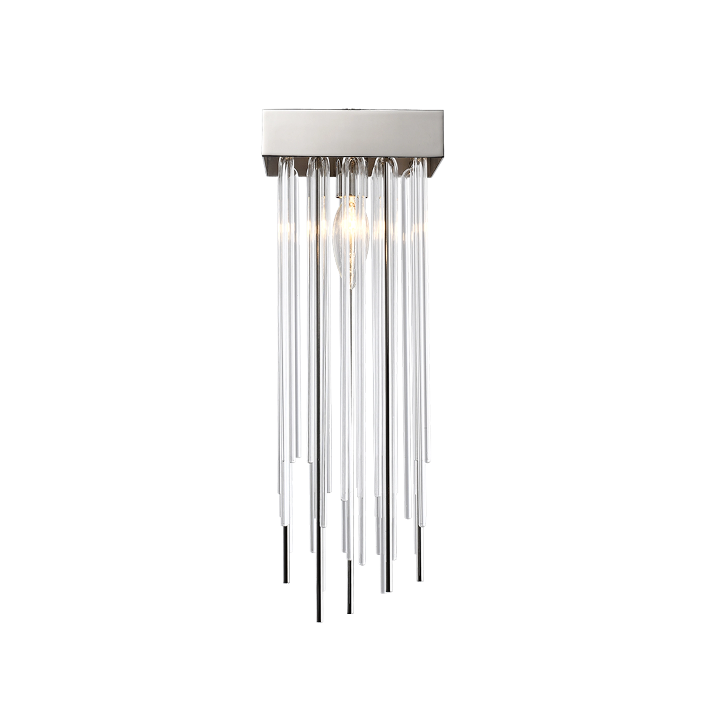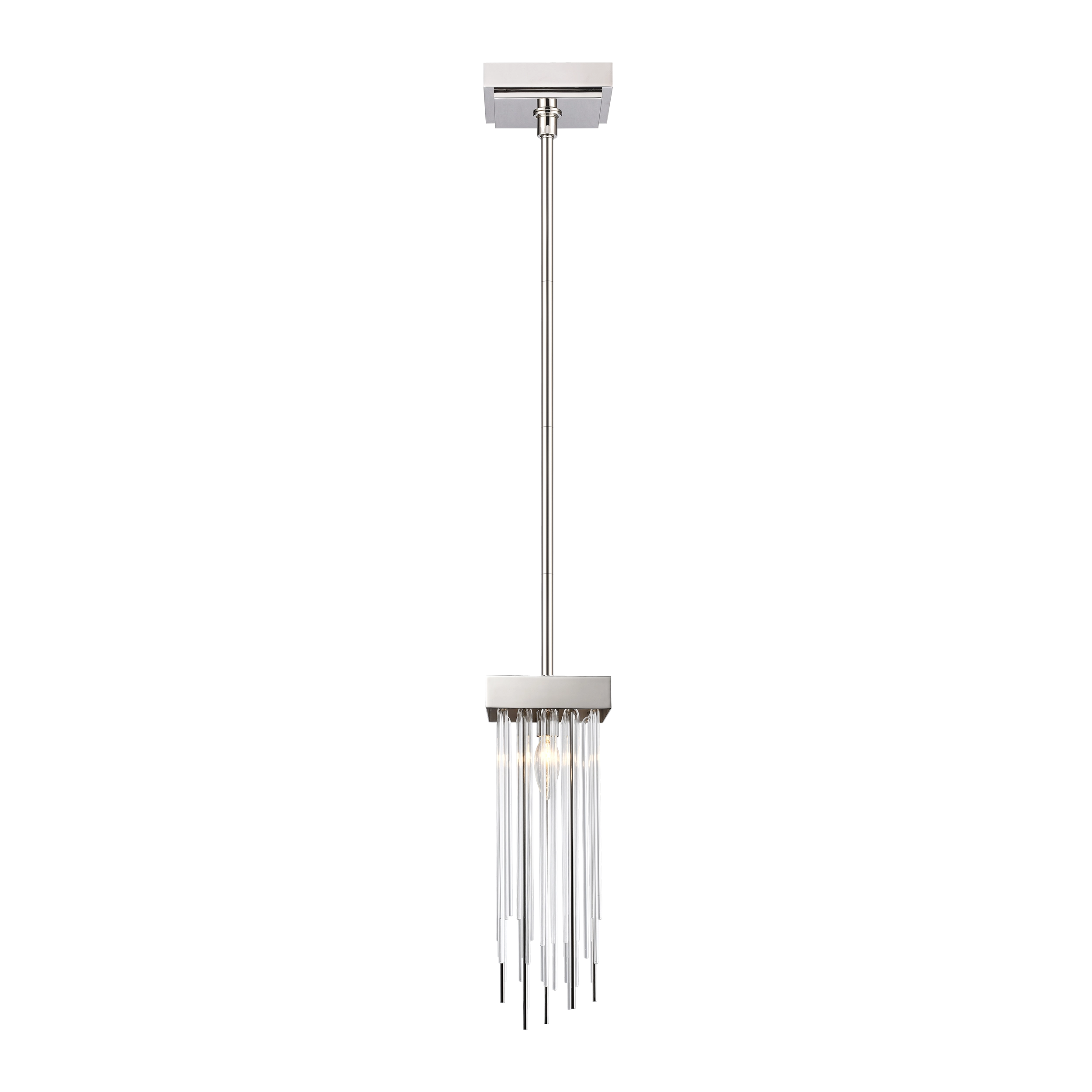 1-Light 6" Square Waterfall Glass Mini-Pendant Light with Multi-Sized Clear Curved Glass Stems combined with Solid Metal Stems. Refined Metal Details with our Luxurious Polished Nickel Finish and Flush Mount Convertible.