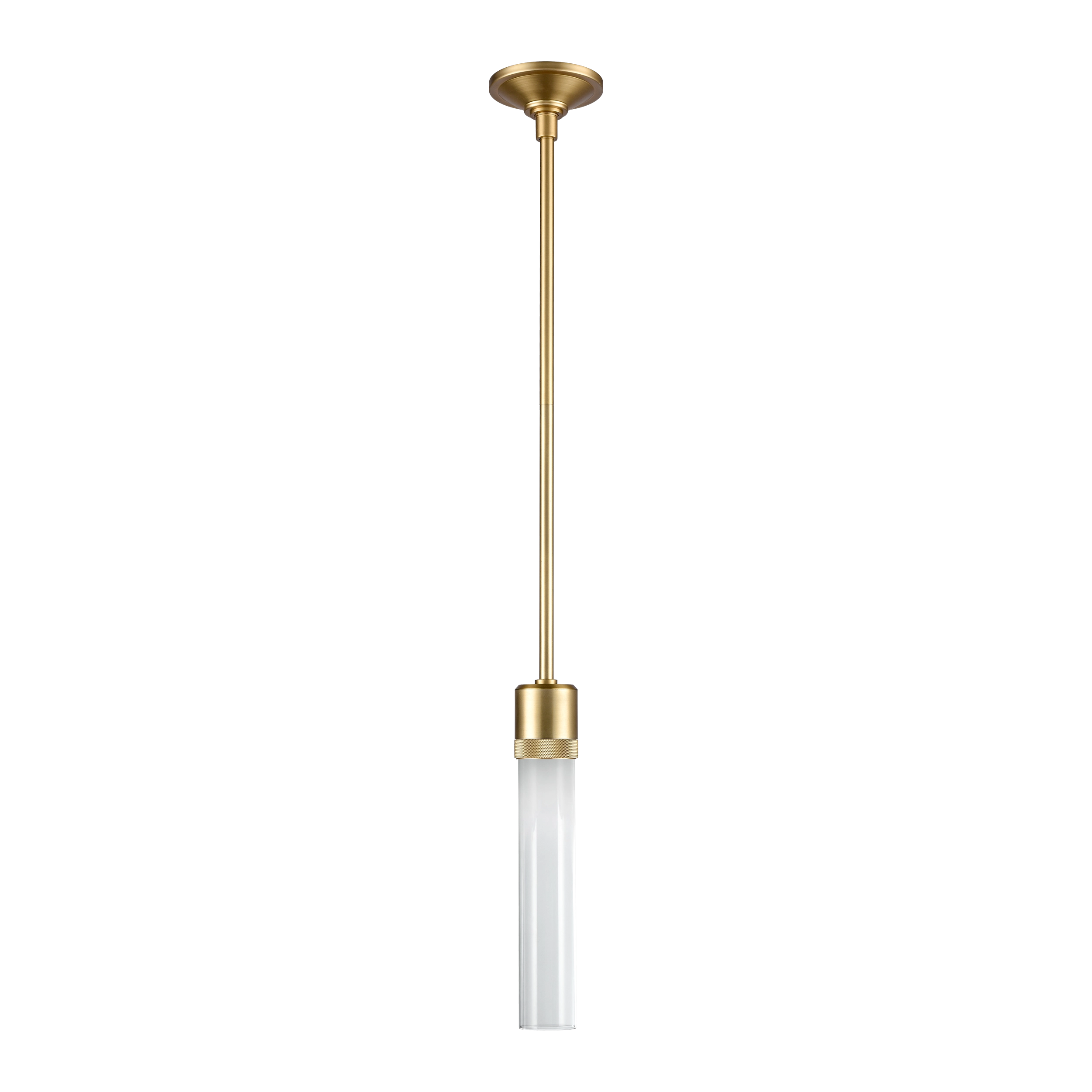 3" High End Vertical Cylindrical Pendant Light, 12" Clear Transparent Glass Shade and Our Premium Aged Brass Finish with Detailed Diamond Knurled Metal Band. Integrated Replaceable LED with 3CCT 3000K, 3500K and 4000K.