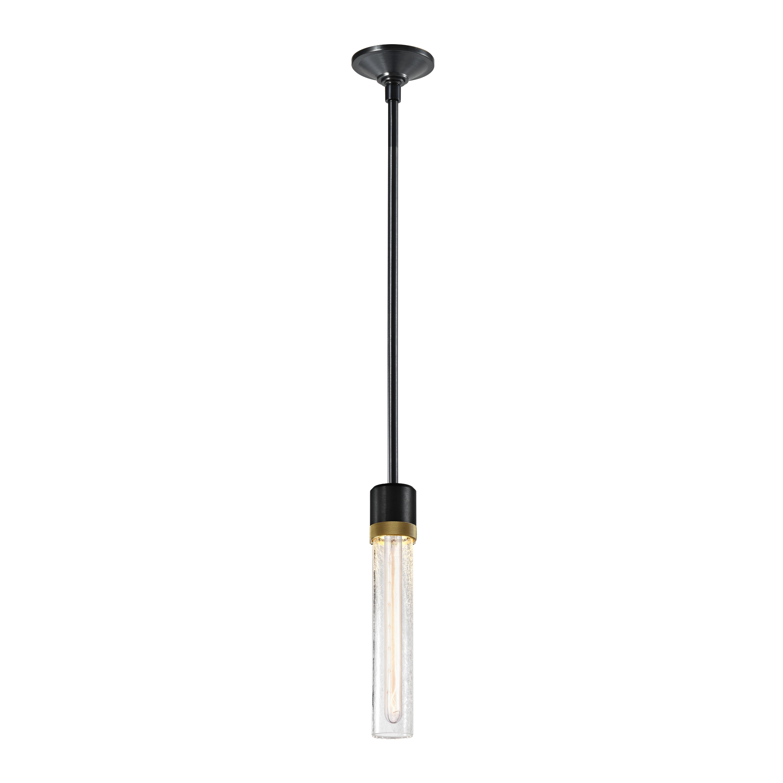 3" High End Vertical Cylindrical Pendant Light, 12" Eye Catching Crackled Glass Shade and Our Sleek Satin Brushed Black Finish with Detailed Aged Brass Diamond Knurled Metal Band. E26 Medium Base Socket for 12" T10 Filament LED Bulb Not Included.