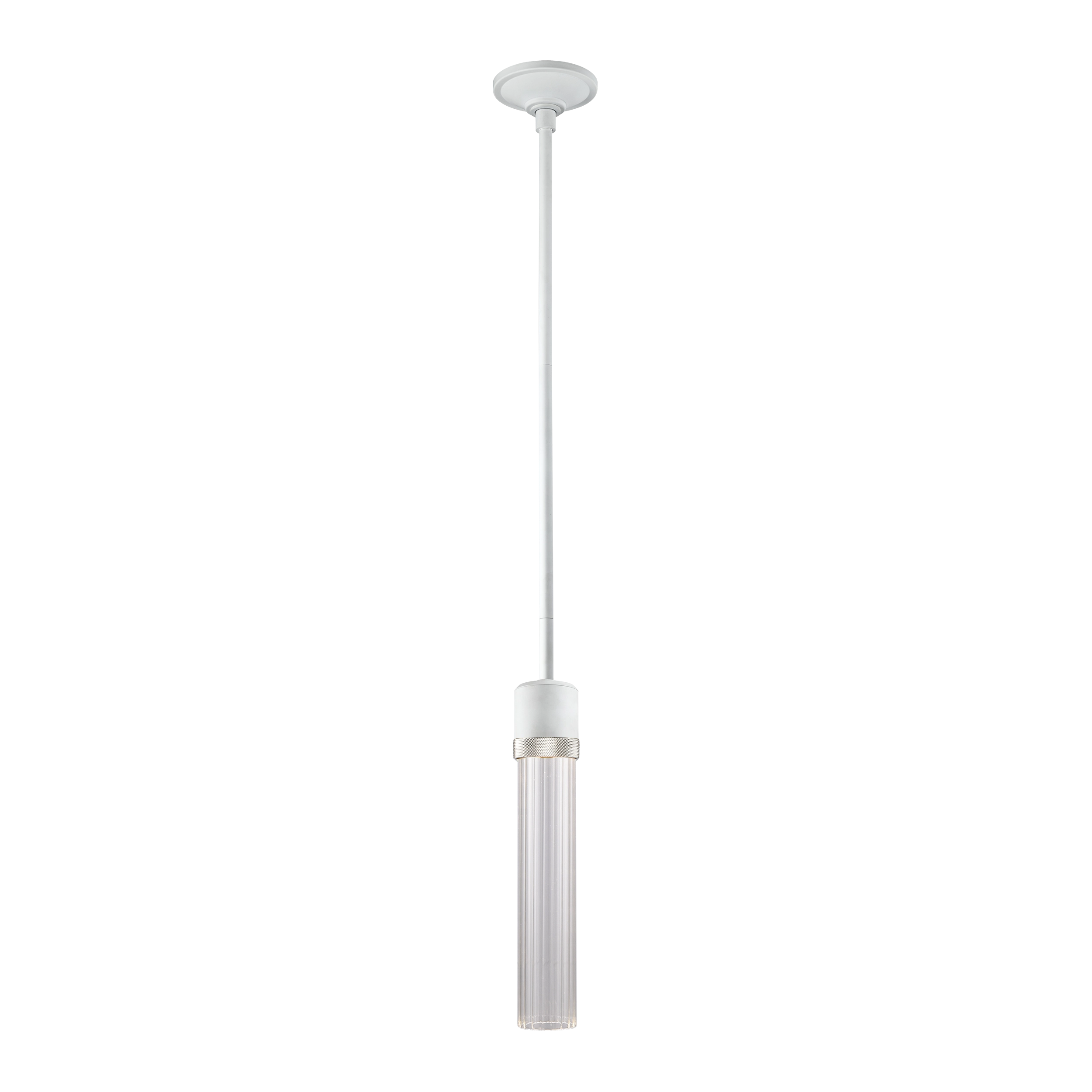 3" High End Vertical Cylindrical Pendant Light, 12" Fluted Glass Shade and Our Chic Matte White Finish with Detailed Polished Nickel Diamond Knurled Metal Band. Integrated Replaceable LED with 3CCT 3000K, 3500K and 4000K.