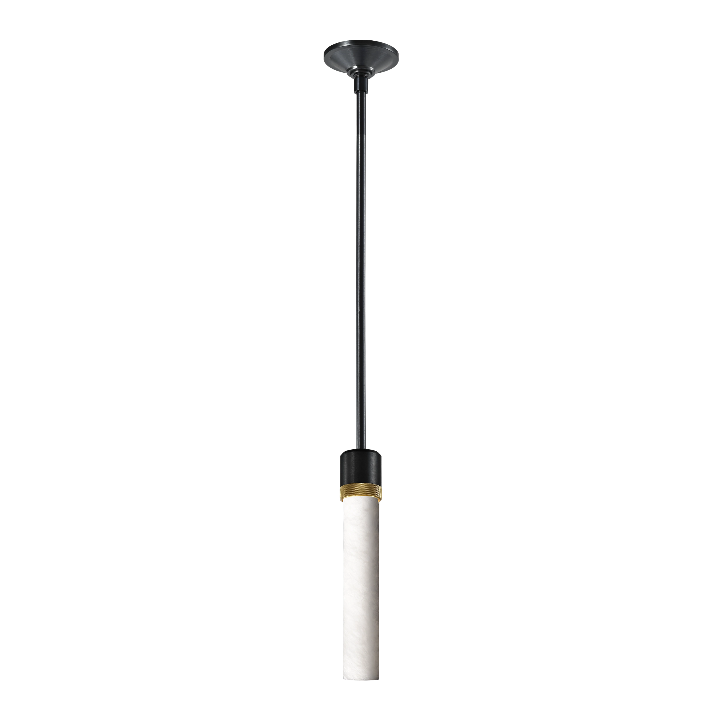 3" High End Vertical Cylindrical Pendant Light, 12" Authentic Spanish Alabaster Shade and Our Sleek Satin Brushed Black Finish with Detailed Aged Brass Diamond Knurled Metal Band. E26 Medium Base Socket for 12" T10 Filament LED Bulb Not Included.