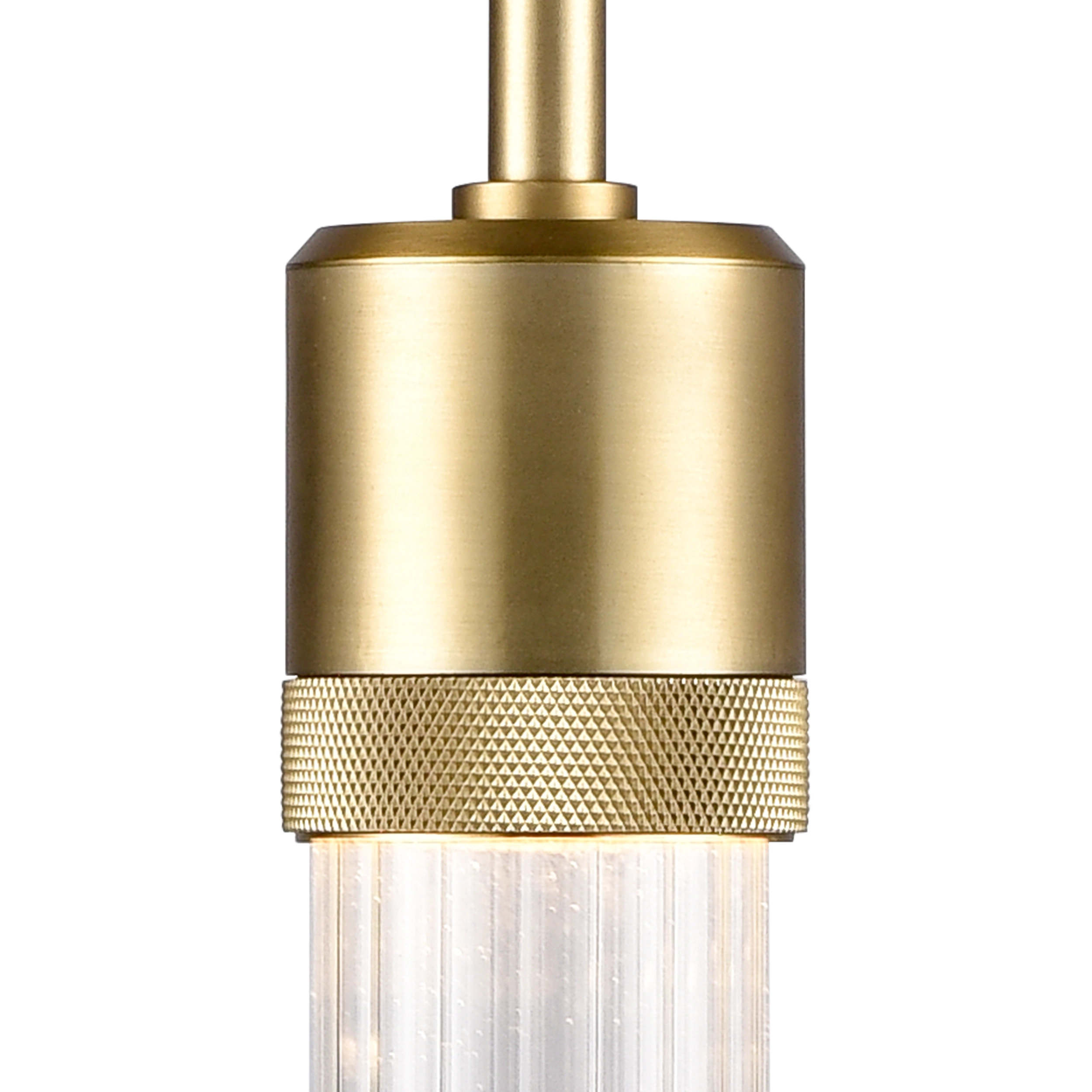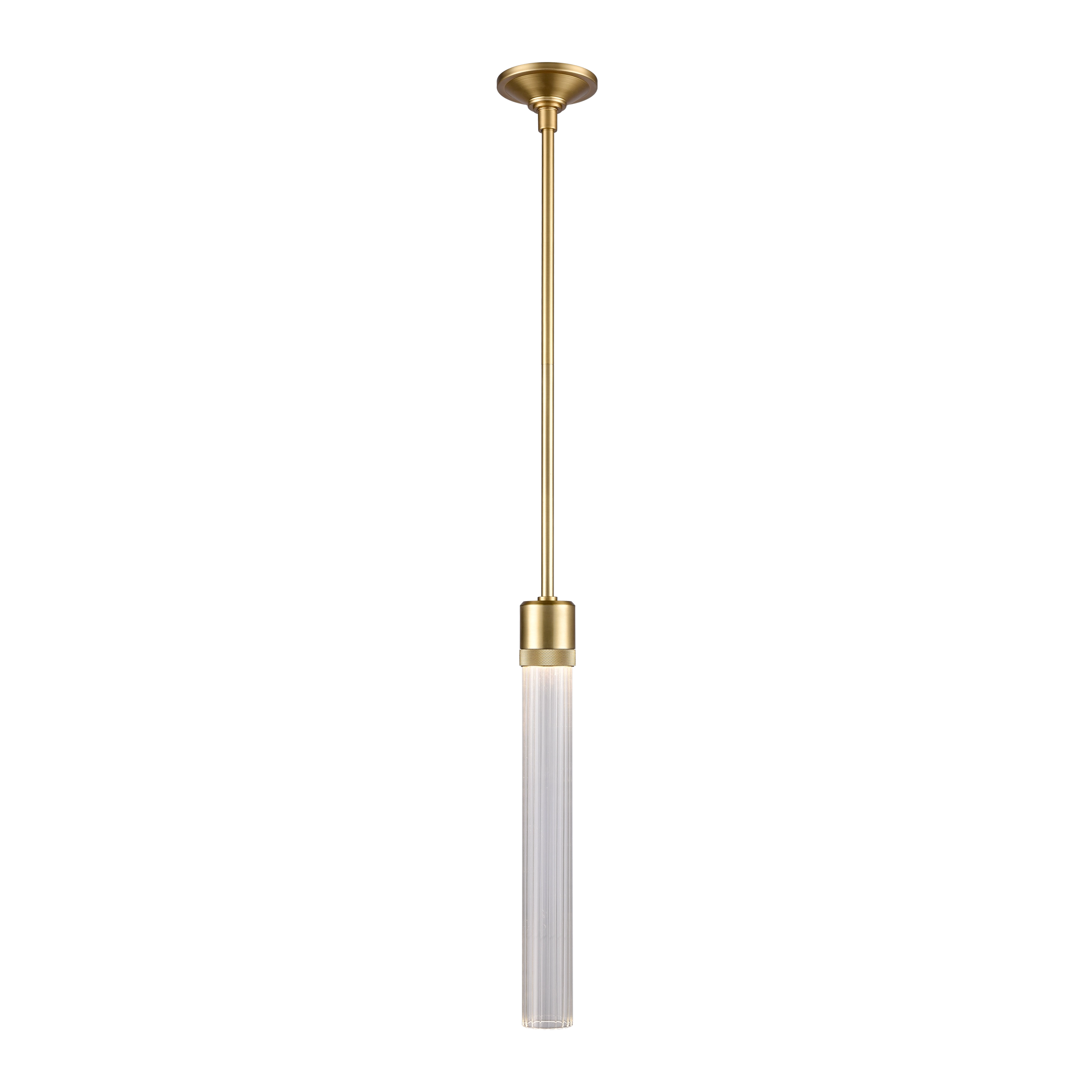 3" High End Vertical Cylindrical Pendant Light, 18" Fluted Glass Shade and Our Premium Aged Brass Finish with Detailed Diamond Knurled Metal Band. Integrated Replaceable LED with 3CCT 3000K, 3500K and 4000K.