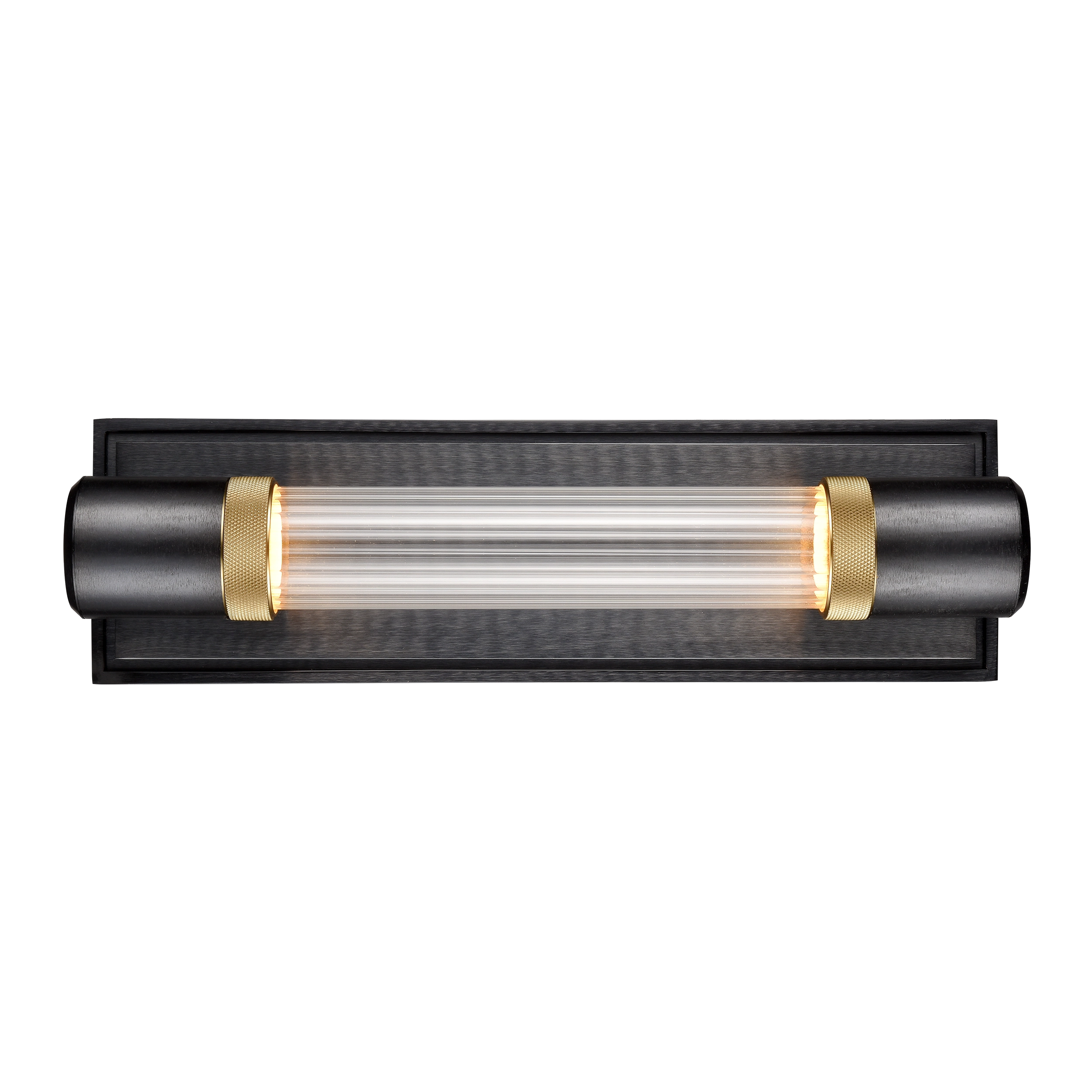 LED 3CCT 2-Light Fuse Styled Wall Sconce, 12" Clear Fluted Glass Shade and Our Sleek Satin Brushed Black Finish with Detailed Aged Brass Diamond Knurled Metal Bands. Integrated Replaceable LED with 3CCT 3000K, 3500K and 4000K.