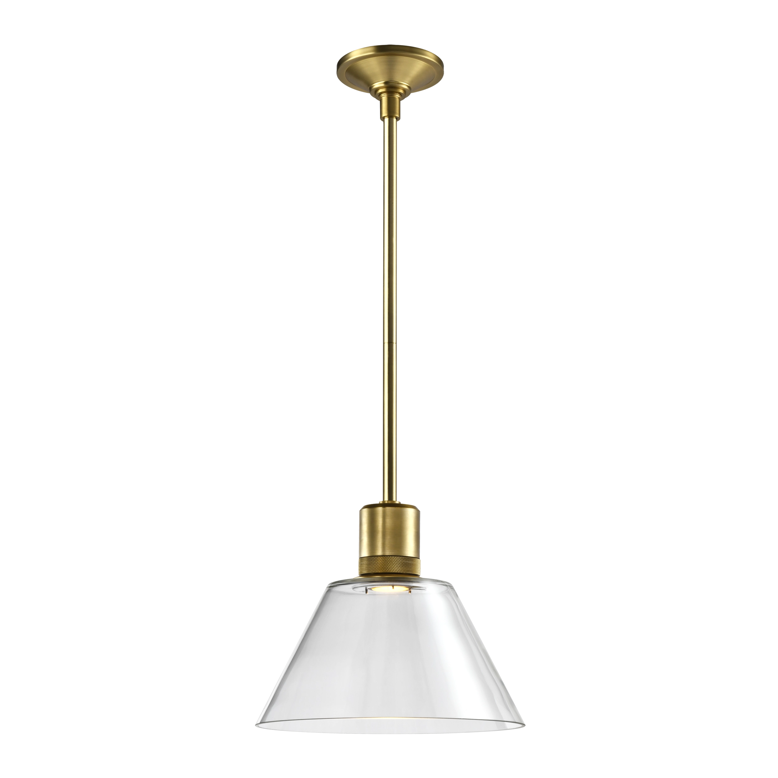 12" High End Clear Glass Cone Shade Pendant Light in Our Premium Aged Brass Finish with Detailed Diamond Knurled Metal Band. Integrated Replaceable LED with 3CCT 3000K, 3500K and 4000K.