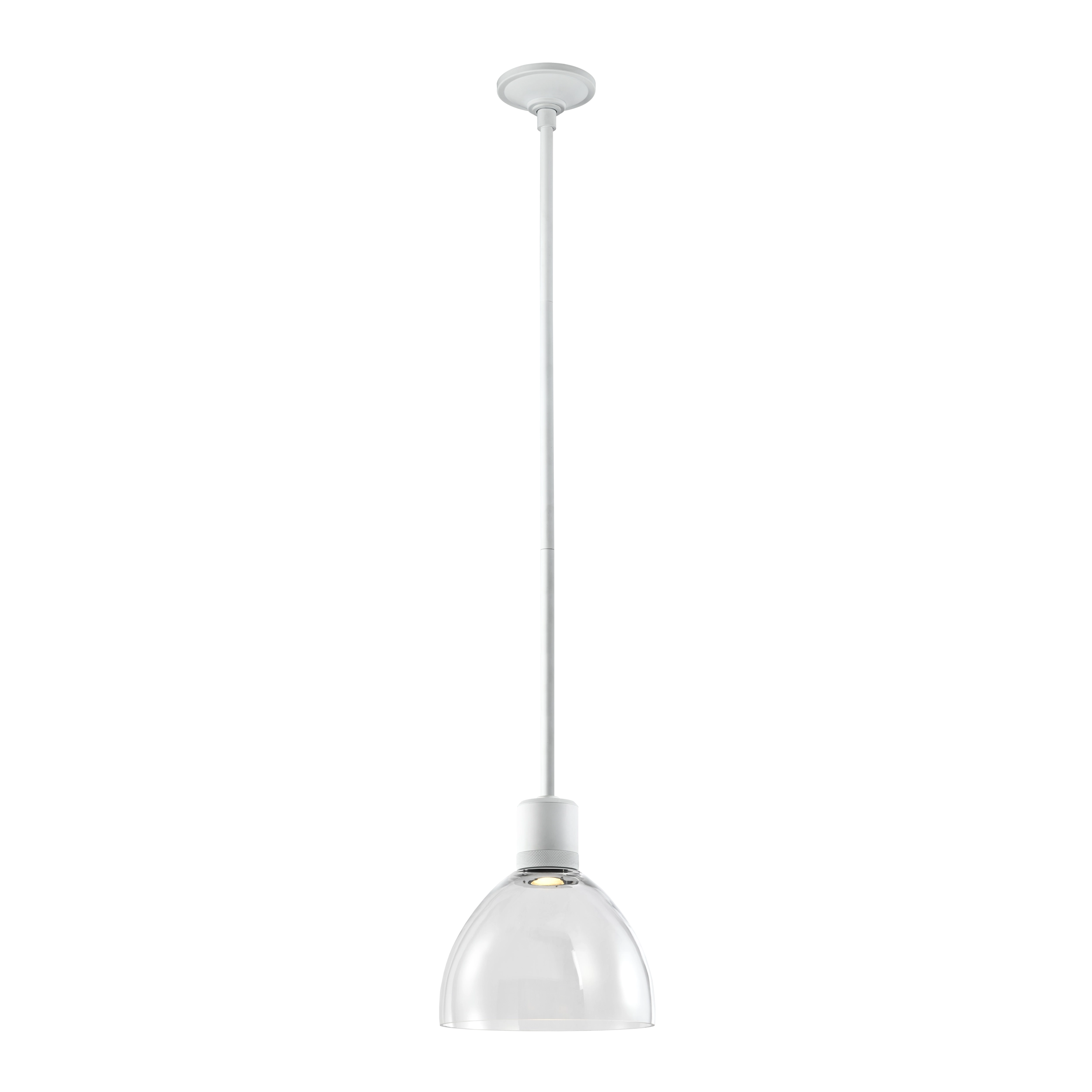 10" High End Clear Glass Dome Shade Pendant Light in Our Chic Matte White Finish with Detailed Diamond Knurled Metal Band. Integrated Replaceable LED with 3CCT 3000K, 3500K and 4000K.