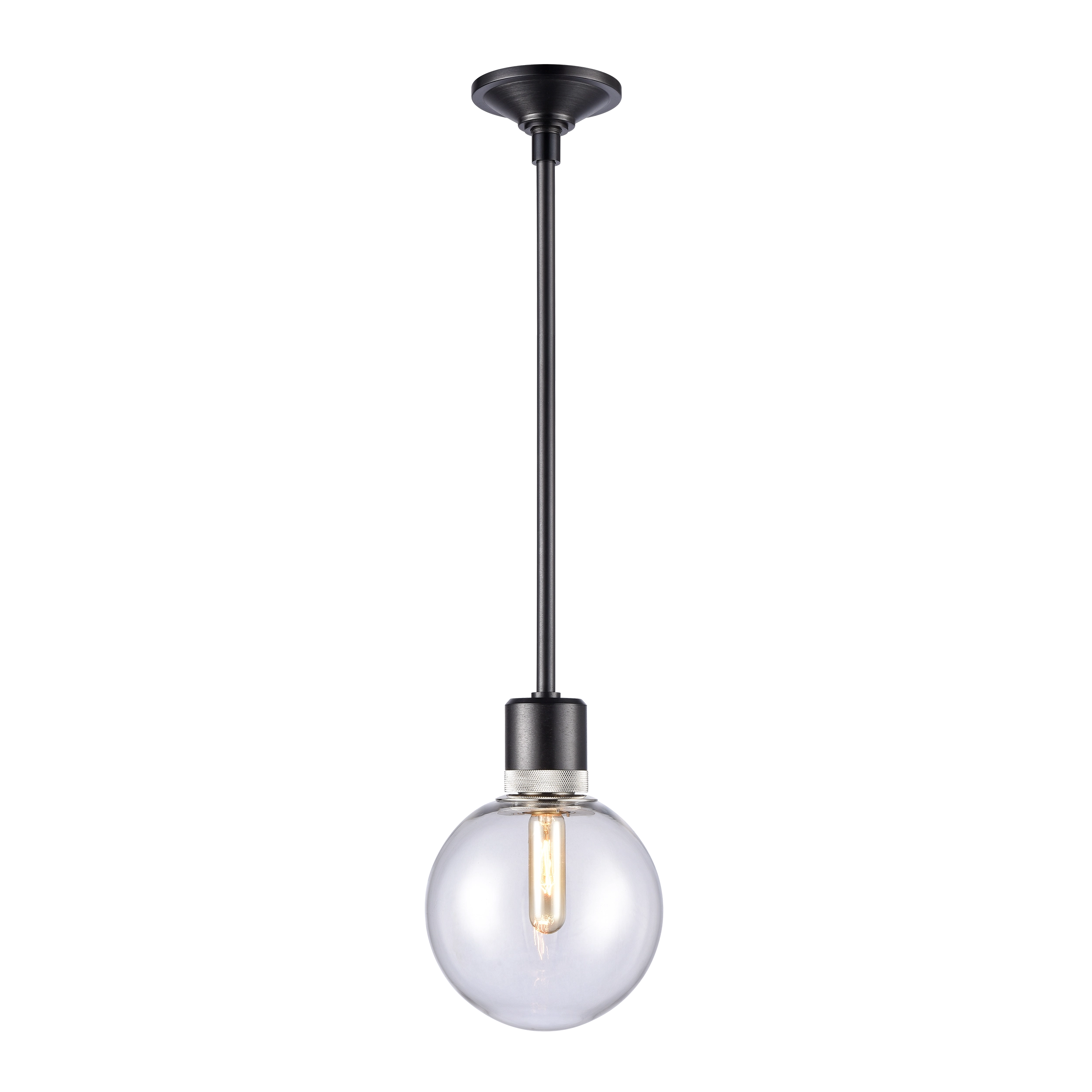 8" High End Clear Glass Globe Shade Pendant Light in Our Sleek Satin Brushed Black Finish with Detailed Polished Nickel Diamond Knurled Metal Band. E26 Medium Base Socket for 12" T10 Filament LED Bulb Not Included.