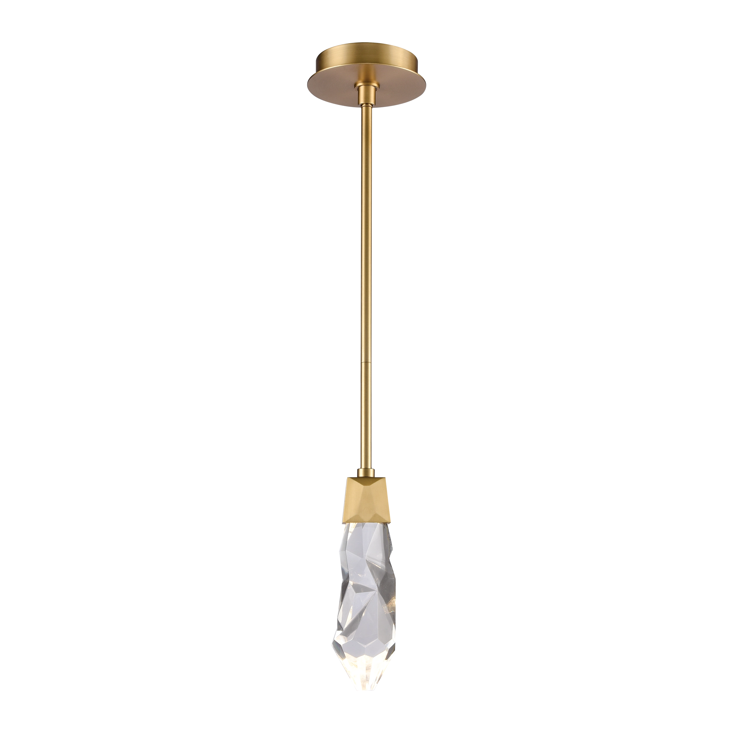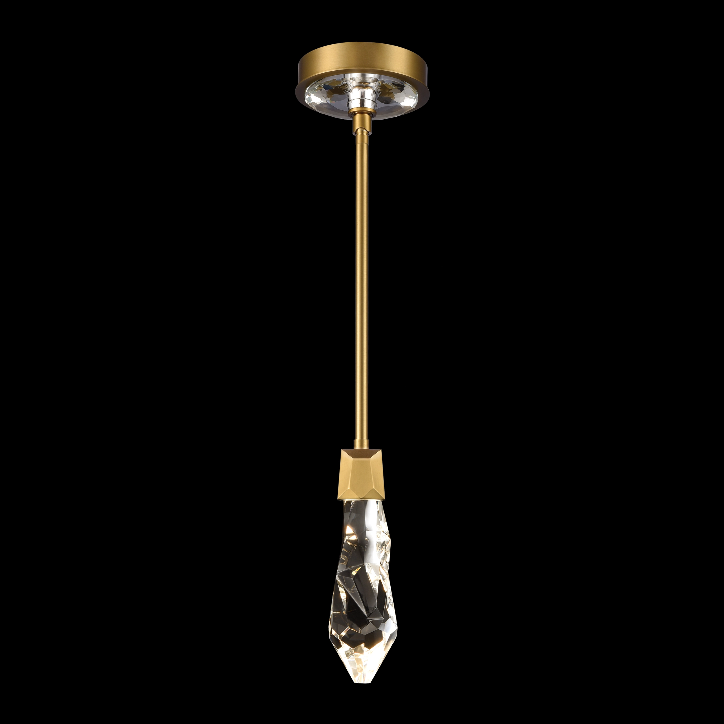 1-Light Inimitable Crystal Mini-Pendant, hand formed and polished crystal, with every turn of the crystal being unique. Refined metal with our premium aged brass finish. Integrated Replaceable LED with 3CCT 3000K, 3500K and 4000K. Optional installation of suspension stems to showcase the black braided fabric wire and optional installation of canopy crystal.