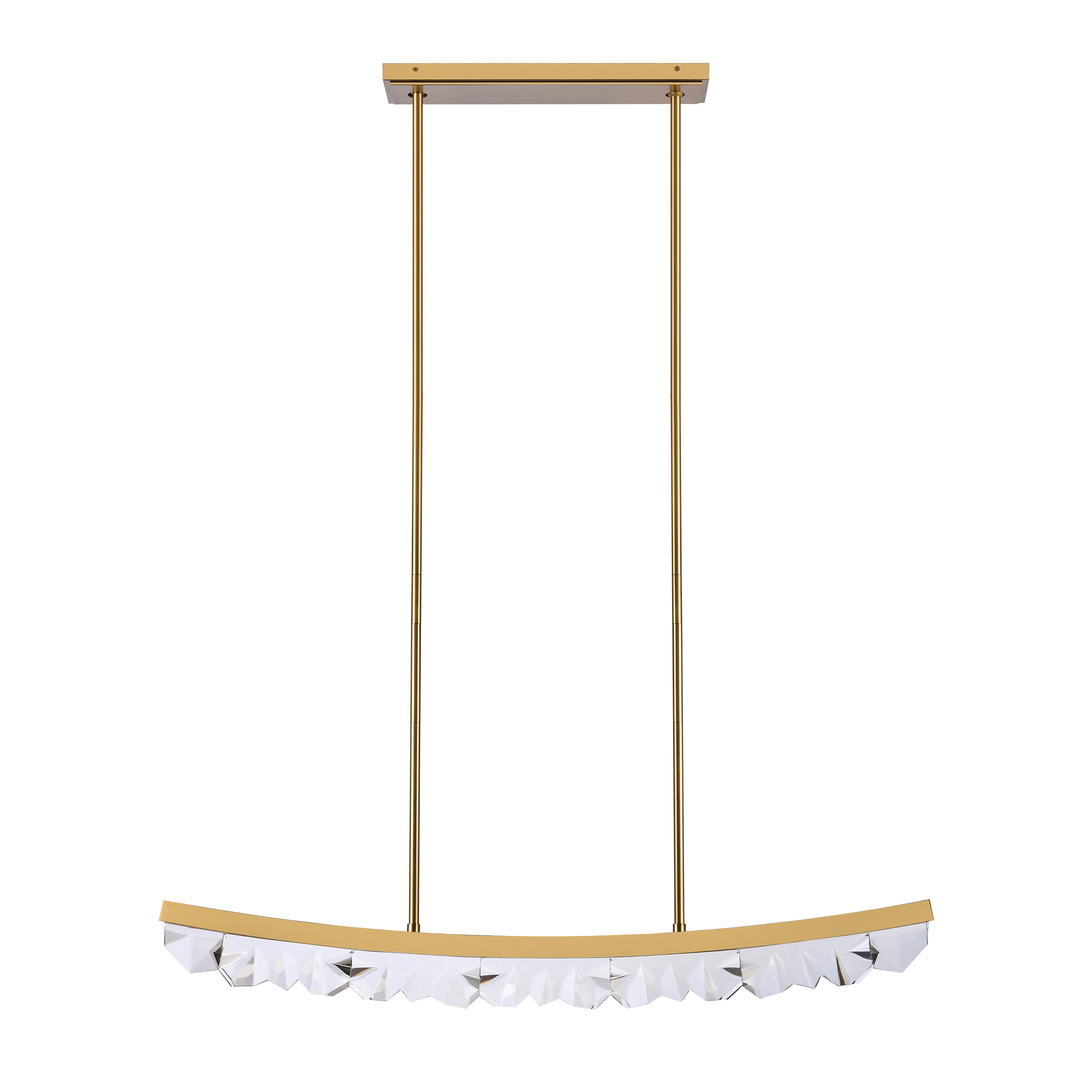 LED 48" Linear Crystal Pendant with unique sleek curved fire polished crystals from end to end. Heavy gauged refined metal with our premium aged brass finish. Integrated Replaceable LED with 3CCT 3000K, 3500K and 4000K.