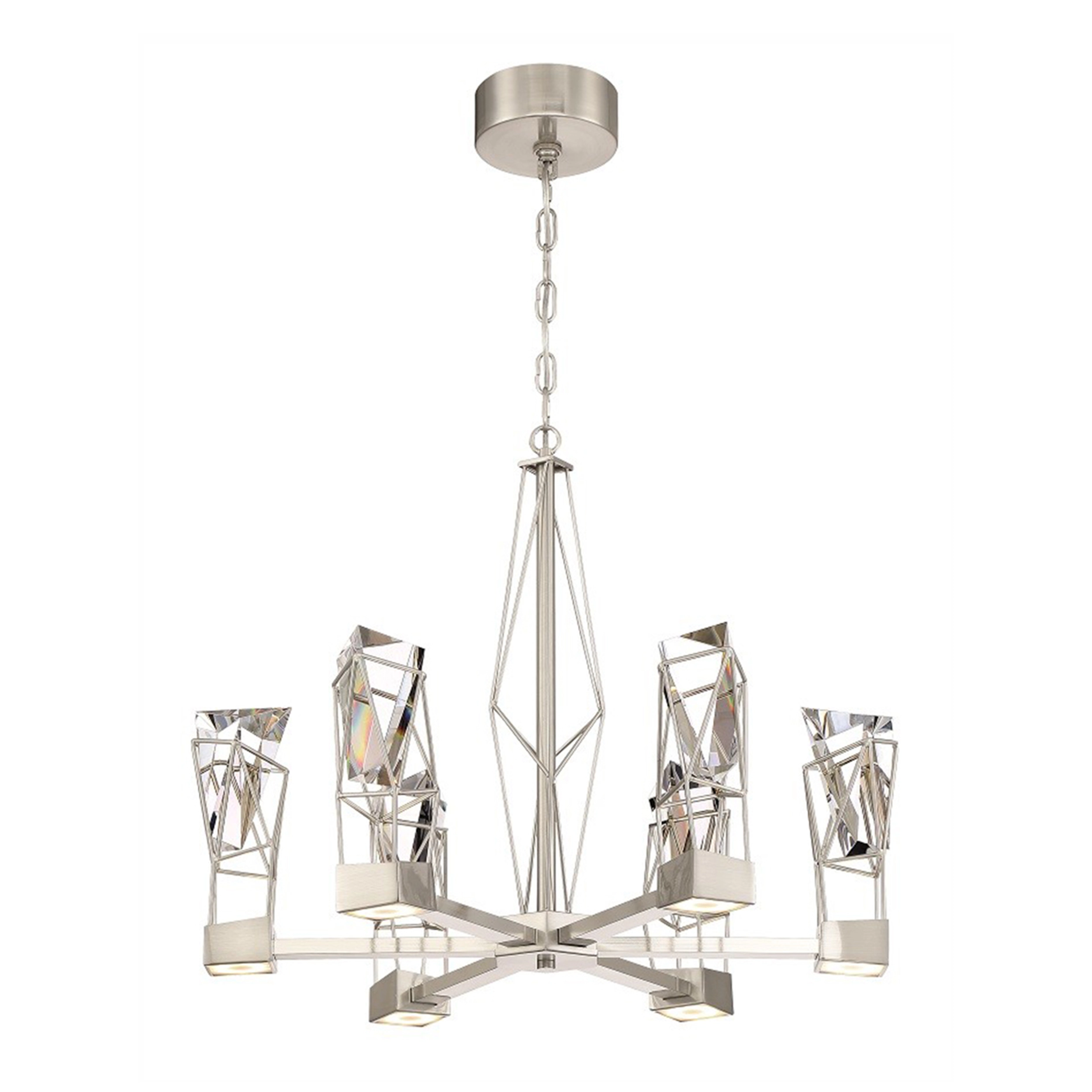 Duo 6-Light LED 24" Geometric Armed Chandelier with Heavy Gauge Clear Faceted Crystals and Satin Nickel Finish.
