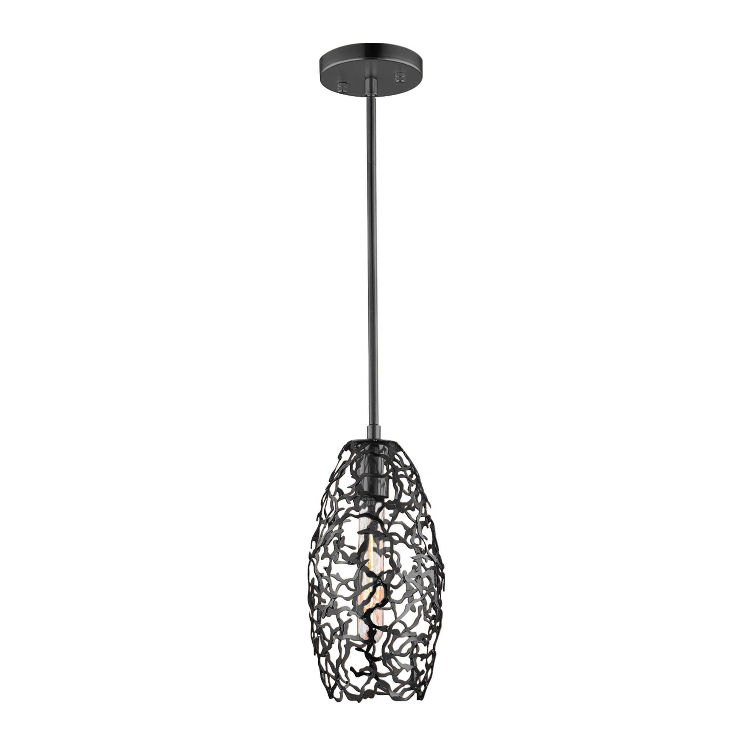 Zeev Lighting Helios Collection 1-Light 6 Inch Vertical Mini Pendant Light with Organic Metal Patterned Convex Shade and Matte Black Finish.